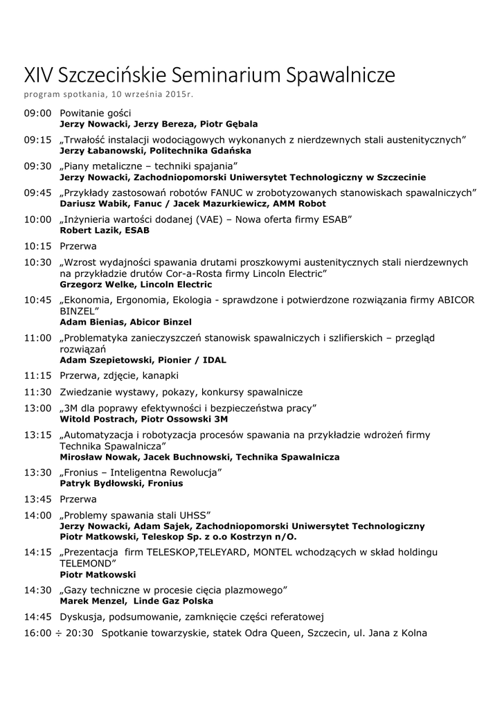 XIV Szczecińskie Seminarium Spawalnicze program spotkania, 10 września 2015r. 09:00 Powitanie gości Jerzy Nowacki, Jerzy Bereza, Piotr Gębala 09:15 „Trwałość instalacji wodociągowych wykonanych z nierdzewnych stali austenitycznych” Jerzy Łabanowski, Politechnika Gdańska 09:30 „Piany metaliczne – techniki spajania” Jerzy Nowacki, Zachodniopomorski Uniwersytet Technologiczny w Szczecinie 09:45 „Przykłady zastosowań robotów FANUC w zrobotyzowanych stanowiskach spawalniczych” Dariusz Wabik, Fanuc / Jacek Mazurkiewicz, AMM Robot 10:00 „Inżynieria wartości dodanej (VAE) – Nowa oferta firmy ESAB” Robert Lazik, ESAB 10:15 Przerwa 10:30 „Wzrost wydajności spawania drutami proszkowymi austenitycznych stali nierdzewnych na przykładzie drutów Cor-a-Rosta firmy Lincoln Electric” Grzegorz Welke, Lincoln Electric 10:45 „Ekonomia, Ergonomia, Ekologia - sprawdzone i potwierdzone rozwiązania firmy ABICOR BINZEL” Adam Bienias, Abicor Binzel 11:00 „Problematyka zanieczyszczeń stanowisk spawalniczych i szlifierskich – przegląd rozwiązań Adam Szepietowski, Pionier / IDAL 11:15 Przerwa, zdjęcie, kanapki 11:30 Zwiedzanie wystawy, pokazy, konkursy spawalnicze 13:00 „3M dla poprawy efektywności i bezpieczeństwa pracy” Witold Postrach, Piotr Ossowski 3M 13:15 „Automatyzacja i robotyzacja procesów spawania na przykładzie wdrożeń firmy Technika Spawalnicza” Mirosław Nowak, Jacek Buchnowski, Technika Spawalnicza 13:30 „Fronius – Inteligentna Rewolucja” Patryk Bydłowski, Fronius 13:45 Przerwa 14:00 „Problemy spawania stali UHSS” Jerzy Nowacki, Adam Sajek, Zachodniopomorski Uniwersytet Technologiczny Piotr Matkowski, Teleskop Sp. z o.o Kostrzyn n/O. 14:15 „Prezentacja firm TELESKOP,TELEYARD, MONTEL wchodzących w skład holdingu TELEMOND” Piotr Matkowski 14:30 „Gazy techniczne w procesie cięcia plazmowego” Marek Menzel, Linde Gaz Polska 14:45 Dyskusja, podsumowanie, zamknięcie części referatowej 16:00 ÷ 20:30 Spotkanie towarzyskie, statek Odra Queen, Szczecin, ul. Jana z Kolna