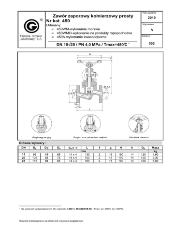 Rok wydania Zawór zaporowy kołnierzowy prosty Nr kat. 450 Odmiany: • 450WM-wykonanie morskie • 450WMO-wykonanie na produkty ropopochodne • 450A-wykonanie kwasoodporne 2010 Wydanie nr V Karta nr DN 15÷ ÷25 / PN 4,0 MPa / Tmax=450°C ∗ Grzyb regulacyjny Grzyb z uszczelnieniem miękkim 003 Wskaźnik otwarcia Główne wymiary : ∗ DN DZ Dp D0 dO x n 15 20 25 95 105 115 45 58 68 65 75 85 14 x 4 14 x 4 14 x 4 L mm 130 150 160 f g H h DK 2 2 2 16 18 18 190 190 190 14 14 14 120 120 120 dla wykonań kwasoodpornych (A) materiał: 1.4541 ( X6CrNiTi18-10) Tmax; od -196ºC do +300ºC. Rysunek przedstawiony na karcie jest rysunkiem poglądowym Masa kg 4,60 5,30 6,00 Zastosowanie : Zawory zaporowe kołnierzowe moŜna montować w dowolnym połoŜeniu na rurociągach, zwracając jedynie uwagę na prawidłowy kierunek przepływu czynnika, który powinien być zgodny z oznaczeniem na kadłubie. Zawory przeznaczone są do odcinania przepływu czynnika roboczego. W wykonaniu z grzybem regulacyjnym słuŜą ponadto do dławienia przepływu. Czynnik roboczy : Zawory przeznaczone są do wody, pary, oleju oraz innych neutralnych czynników ciekłych i gazowych w przedziale temperatur od -10°C do 450 °C, w wykonaniu morskim „WM”- do pracy w warunkach morskich i do wody morskiej- w wykonaniu kwasoodpornym do czynników aktywnych chemicznie takich jak kwasy, zasady, roztwory soli itp. Zakres stosowania : Największe ciśnienie robocze[w bar] przy temp. czynnika (°°C) Ciśnienie nominalne PN [bar] do 120 °C 200 °C 250 °C 300 °C 350 °C 400 °C 450 °C P250GH 40 35 32 28 24 21 18 X6CrNiTi18-10 40 36 34 32 Szczegółowe informacje zawiera wykres „Dopuszczalne parametry robocze armatury dla stosowanych materiałów” (Układ p/t) w części IV katalogu. Materiały podstawowe: Kadłub standard P250GH Materiał wykonanie WM i WMO P250GH X6CrNiTi18-10 Siedlisko kadłuba X17CrNi16-2 X17CrNi16-2 X6CrNiTi18-10 Pokrywa P250GH P250GH X6CrNiTi18-10 Trzpień X30Cr13 X17CrNi16-2 X6CrNiTi18-10 Siedlisko grzyba X30Cr13 X17CrNi16-2 X6CrNiTi18-10 Uszczelnienia Grafit Grafit Grafit Nazwa części kwasoodporne Uwagi : 1. 2. 3. 4. 5. 6. 7. Kołnierze zaworów wykonanie standard: z przylgą -„B1” i owiercone wg PN-EN 1092-1. Na Ŝyczenie wykonujemy inne rodzaje przylgi zgodnie z: ANSI, BS, DIN lub teŜ wg indywidualnych potrzeb klienta. Wykonujemy równieŜ zawory z kołnierzami na ciśnienia PN (0,6 ÷2,5) [MPa ]. Wymagania i badania techniczne zaworów wg PN-EN 12266-1. Klasa szczelności A wg PN-EN 12266-1. Długość budowy wg PN-EN 558. Świadectwo odbioru wg Ŝyczenia Klienta-wg PN-EN 10204. Zawory w wykonaniu morskim -WM wykonujemy zgodnie z normą PN-W-74017, na Ŝyczenie Klienta zawory mogą podlegać nadzorowi i spełniać wymagania Towarzystw Klasyfikacyjnych: GL, LRS, BV, DNV, PMPC (RMRS), ABS, RINA. UWAGA – W zapytaniu / zamówieniu prosimy o podanie norm i typu przyłącza oraz medium i parametry pracy. Producent i dostawca: Fabryka Armatur „Głuchołazy” S.A. Adres: 48-340 Głuchołazy ul. Wrocławska 1A tel.: 077 / 439 19 44 fax: 077 / 439 19 46 e-mail: [email protected] http: www.fagsa.com.pl Producent zastrzega moŜliwość wprowadzenia zmian w wyrobach bez powiadamiania.