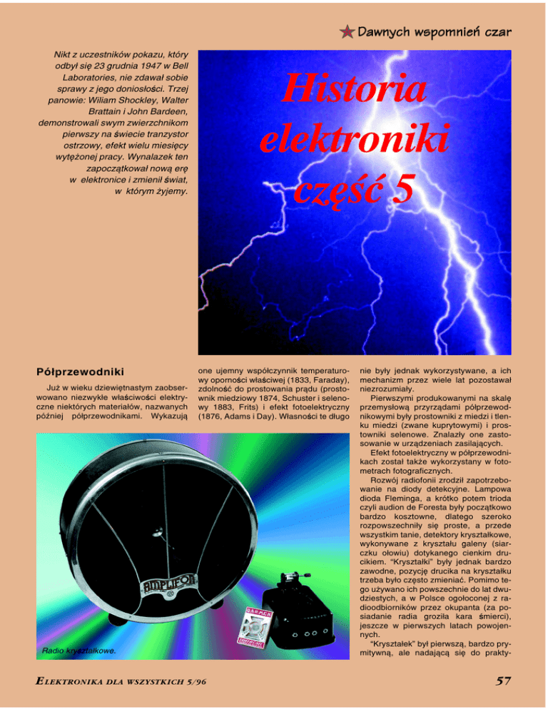 Dawnych wspomnień czar Nikt z uczestników pokazu, który odbył się 23 grudnia 1947 w Bell Laboratories, nie zdawał sobie sprawy z jego doniosłości. Trzej panowie: Wiliam Shockley, Walter Brattain i John Bardeen, demonstrowali swym zwierzchnikom pierwszy na świecie tranzystor ostrzowy, efekt wielu miesięcy wytężonej pracy. Wynalazek ten zapoczątkował nową erę w elektronice i zmienił świat, w którym żyjemy. Półprzewodniki Już w wieku dziewiętnastym zaobser− wowano niezwykłe właściwości elektry− czne niektórych materiałów, nazwanych później półprzewodnikami. Wykazują Historia elektroniki część 5 one ujemny współczynnik temperaturo− wy oporności właściwej (1833, Faraday), zdolność do prostowania prądu (prosto− wnik miedziowy 1874, Schuster i seleno− wy 1883, Frits) i efekt fotoelektryczny (1876, Adams i Day). Własności te długo Radio kryształkowe. E LEKTRONIKA DLA WSZYSTKICH 5/96 nie były jednak wykorzystywane, a ich mechanizm przez wiele lat pozostawał niezrozumiały. Pierwszymi produkowanymi na skalę przemysłową przyrządami półprzewod− nikowymi były prostowniki z miedzi i tlen− ku miedzi (zwane kuprytowymi) i pros− towniki selenowe. Znalazły one zasto− sowanie w urządzeniach zasilających. Efekt fotoelektryczny w półprzewodni− kach został także wykorzystany w foto− metrach fotograficznych. Rozwój radiofonii zrodził zapotrzebo− wanie na diody detekcyjne. Lampowa dioda Fleminga, a krótko potem trioda czyli audion de Foresta były początkowo bardzo kosztowne, dlatego szeroko rozpowszechniły się proste, a przede wszystkim tanie, detektory kryształkowe, wykonywane z kryształu galeny (siar− czku ołowiu) dotykanego cienkim dru− cikiem. “Kryształki” były jednak bardzo zawodne, pozycję drucika na kryształku trzeba było często zmieniać. Pomimo te− go używano ich powszechnie do lat dwu− dziestych, a w Polsce ogołoconej z ra− dioodbiorników przez okupanta (za po− siadanie radia groziła kara śmierci), jeszcze w pierwszych latach powojen− nych. “Kryształek” był pierwszą, bardzo pry− mitywną, ale nadającą się do prakty− 57 Dawnych wspomnień czar cznego użytku diodą półprzewodnikową. “Ostrzowy” styk drucika z kryształem tworzył elementarne złącze p−n. Podstawy teoretyczne W ciągu lat 20−tych i 30−tych pro− wadzono szereg prac nad półprzewo− dnikami, ale działo się to na margi− nesie wysiłków skupionych na te− chnologii lampowej. Nawet małe us− prawnienia w tym zakresie przynosiły bowiem szybkie efekty ekonomiczne. Jednak badania naukowe w dzie− dzinie fizyki ciała stałego były konty− nuowane. Do ich przyspieszenia przyczyniły się znacznie prace Erwina Schrödingera i jego opublikowane w 1926 równanie, które zapocząt− kowało gwałtowny rozwój mechaniki kwantowej. W rok później Werner Heisenberg sformułował swoją za− sadę nieoznaczoności. Wkrótce przy pomocy mechaniki kwantowej wyjaś− niono wszystkie znane wówczas zja− wiska z teorii ciała stałego i metali. Droga do praktycznego zastosowania tej wiedzy stanęła otworem. Dioda W latach 30−tych radio zajmowało już silną pozycję w technice, a jego zastosowanie szybko się poszerzało. Używano coraz wyższych częstotli− wości, na których spore pojemności międzyelektrodowe lamp elektrono− wych zaczynały ograniczać ich sto− sowanie. Badania nad półprzewodnikami zo− stały przyspieszone po wybuchu wojny w związku z szybkim rozwojem radaru. Urządzenia te działały na stosunkowo wysokich częstotliwoś− ciach, więc pojawiło się zapotrze− bowanie na niezawodne podzespoły do wielkich częstotliwości. Znacznie mniejsze wymiary diod półprzewod− nikowych predestynowały je do sto− sowania na wyższych częstotliwoś− ciach, jednak poziomem technologicz− nym nie dorównywały diodom lampo− wym. Russel Ohl, chemik w Bell Labora− tories, już przed wojną znacznie udo− skonalił metodę wytwarzania krysz− tałów krzemu, podstawowego mate− riału półprzewodnikowego. Posiadł też umiejętność wprowadzania do krzemu śladowych ilości domieszek, potrzebnych do otrzymywania krze− mu typu p i typu n. Szybko też udało mu się opracować sposób wprowa− dzania obu rodzajów przewodności do tego samego krzemowego podłoża. W 1941 Ohl otrzymał złącze p−n i stwierdził, że działa ono doskonale jako prostownik. Technologia diod półprzewodnikowych robiła szybkie 58 postępy, a parametry diod stawały się coraz lepsze. Tranzystorowa trójka Pod koniec wojny w Bell Laboratories doceniono wielkie możliwości otwie− rające się przed technologią półprze− wodników. Na wiosną 1945 odbyła się duża konferencja na temat przyszłości badań w tej dziedzinie. W jej następstwie zdecydowano podjąć badania “prowa− dzące do zdobycia wiedzy, której można by użyć do opracowania zupełnie nowych i doskonalszych podzespołów”. W wyniku tych decyzji została utwo− rzona grupa badawcza fizyki ciała sta− łego pod kierownictwem Wiliama Shock− leya i Stanleya Morgana. Shockley kiero− wał także podgrupą półprzewodników, w której uczestniczyli również Walter Brattain i John Bardeen. Trójka ta wyna− lazła tranzystor. Wiliam Shockley był Amerykaninem urodzonym w 1910 Londynie. Jego ro− dzice po trzech latach powrócili z nim do USA i osiedlili się w pobliżu San Fran− cisco. Tu ukończył on studia w California Institute of Technology, a następnie w 1936 otrzymał tytuł doktora w Massa− chussetts Institute of Technology. Roz− począł potem pracę w Bell Laboratories, gdzie początkowo zajmował się dyfrak− cją elektronów. W 1955 opuścił tę firmę i w swoim rodzinnym Palo Alto zało− żył własne przedsiębiorstwo, Shock− ley Semiconductors, które przyciąg− nęło wielu innych specjalistów pół− przewodnikowych. Niewiele później powst