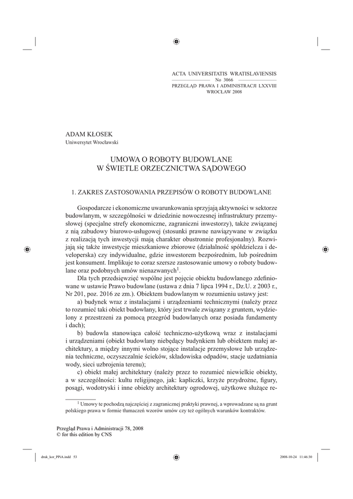 ACTA UNIVERSITATIS WRATISLAVIENSIS ———————— No 3066 ———————— PRZEGLĄD PRAWA I ADMINISTRACJI LXXVIII WROCŁAW 2008 ADAM KŁOSEK Uniwersytet Wrocławski UMOWA O ROBOTY BUDOWLANE W ŚWIETLE ORZECZNICTWA SĄDOWEGO 1. ZAKRES ZASTOSOWANIA PRZEPISÓW O ROBOTY BUDOWLANE Gospodarcze i ekonomiczne uwarunkowania sprzyjają aktywności w sektorze budowlanym, w szczególności w dziedzinie nowoczesnej infrastruktury przemysłowej (specjalne strefy ekonomiczne, zagraniczni inwestorzy), także związanej z nią zabudowy biurowo-usługowej (stosunki prawne nawiązywane w związku z realizacją tych inwestycji mają charakter obustronnie profesjonalny). Rozwijają się także inwestycje mieszkaniowe zbiorowe (działalność spółdzielcza i developerska) czy indywidualne, gdzie inwestorem bezpośrednim, lub pośrednim jest konsument. Implikuje to coraz szersze zastosowanie umowy o roboty budowlane oraz podobnych umów nienazwanych1. Dla tych przedsięwzięć wspólne jest pojęcie obiektu budowlanego zdefiniowane w ustawie Prawo budowlane (ustawa z dnia 7 lipca 1994 r., Dz.U. z 2003 r., Nr 201, poz. 2016 ze zm.). Obiektem budowlanym w rozumieniu ustawy jest: a) budynek wraz z instalacjami i urządzeniami technicznymi (należy przez to rozumieć taki obiekt budowlany, który jest trwale związany z gruntem, wydzielony z przestrzeni za pomocą przegród budowlanych oraz posiada fundamenty i dach); b) budowla stanowiąca całość techniczno-użytkową wraz z instalacjami i urządzeniami (obiekt budowlany niebędący budynkiem lub obiektem małej architektury, a między innymi wolno stojące instalacje przemysłowe lub urządzenia techniczne, oczyszczalnie ścieków, składowiska odpadów, stacje uzdatniania wody, sieci uzbrojenia terenu); c) obiekt małej architektury (należy przez to rozumieć niewielkie obiekty, a w szczególności: kultu religijnego, jak: kapliczki, krzyże przydrożne, figury, posągi, wodotryski i inne obiekty architektury ogrodowej, użytkowe służące re1 Umowy te pochodzą najczęściej z zagranicznej praktyki prawnej, a wprowadzane są na grunt polskiego prawa w formie tłumaczeń wzorów umów czy też ogólnych warunków kontraktów. Przegląd Prawa i Administracji 78, 2008 © for this edition by CNS druk_kor_PPiA.indd 53 2008-10-24 11:46:30 54 ADAM KŁOSEK kreacji codziennej i utrzymaniu porządku, jak: piaskownice, huśtawki, drabinki, śmietniki). Ponadto ustawa definiuje także wiele innych pojęć istotnych z punktu widzenia konstruowania stosunku obligacyjnego pomiędzy stronami umowy o roboty budowlane. Definiuje ona „budowę” jako wykonywanie obiektu budowlanego w określonym miejscu, a także odbudowę, rozbudowę, nadbudowę obiektu budowlanego, oraz pojęcie „robót budowlanych” jako pojęcie zbiorcze dla budowy, przebudowy, prac montażowych, remontów i rozbiórek obiektów budowlanych. Uczestnikiem procesu budowlanego wg prawa cywilnego jest wykonawca i inwestor, gdyż takimi pojęciami posługuje się ustawodawca w kodeksie cywilnym. Prawo budowlane na swoje potrzeby rozwija ten katalog, podając jako uczestników procesu budowlanego inwestora, inspektora nadzoru inwestorskiego, projektanta oraz kierownika budowy lub kierownika robót. Katalog ten nie zawiera wykonawcy jako odrębnego podmiotu, osobę wykonawcy reprezentuje kierownik robót. Z katalogu tego wynika, iż podmiotowość wykonawcy na tle prawa budowlanego nie jest tak istotna jak w relacjach cywilnoprawnych pomiędzy nim a inwestorem. Prawo budowlane podkreśla natomiast osobę projektanta (czasami także inspektora nadzoru autorskiego), który na tle prawa zobowiązań jest związany z inwestorem odrębną od wykonawcy umową obligacyjną. Mówiąc o grupie umów związanych z realizacją inwestycji budowlanej, wskazać należy, poza podstawowym modelem umowy o roboty budowlane, następującą typologię2: a) umowa o realizację – tzw. design & build, b) umowa o generalne wykonawstwo, c) umowa o podwykonawstwo, d) umowa o wykonawstwo częściowe, oraz e) umowa o zastępstwo inwestycyjne. 2. UMOWA O ROBOTY BUDOWLANE A UMOWA O DZIEŁO Umowa o roboty budowlane, co podkreślane jest w orzecznictwie, bez wątpienia wywodzi się z umowy o dzieło. Z tego też powodu dochodzi często do sporów o charakter prawny umowy faktycznie łączącej strony. W czasach pełnej swobody formułowania treści umów, dostrzec można krytyczne komentarze dualizmu tych, tak zbliżonych treściowo do siebie, umów3. 2 A. Kidyba, Prawo handlowe, Warszawa 2004, s. 763. Umowa o roboty budowlane została wyodrębniona z umów o dzieło w czasach gospodarki centralnie kierowanej, miała być jednym z instrumentów umacniania ówczesnego ustroju gospodarczego. W obecnym systemie gospodarki rynkowej odrębność umowy o roboty budowlane zdaje się mieć charakter reliktowy, ale jest zachowana – tak SN w wyroku z dnia 6 października 2004 r., I CK 71/2004, OSP 2005/12 poz. 146. 3 Przegląd Prawa i Administracji 78, 2008 © for this edition by CNS druk_kor_PPiA.indd 54 2008-10-24 11:46:30 UMOWA O ROBOTY BUDOWLANE A ORZECZNICTWO SĄDOWE 55 Jak widać wyraźnie na przykładzie poszczególnych sporów sądowych, nie bez znaczenia dla rozstrzygania sporów pomiędzy stronami jest reżim prawny stosowany do łączącego strony stosunku. W orzecznictwie sądowym często zachodzi potrzeba rozstrzygnięcia, poza treścią głównego roszczenia, także i powyższej kwestii. Spotkać można rozstrzygnięcia mające za cel rozgraniczenie obu umów, orzeczenia te mają wysokie znaczenie interpretacyjne, gdyż materia umów zawieranych w procesie inwestycyjnym jest dużo bardziej złożona, niżby to wynikało z brzmienia Tytułu XVI Księgi III Kodeksu Cywilnego. Najogólniej rzecz ujmując, problemy pojawiają się na trzech obszarach. Pierwszym z nich jest kwalifikacja stanu faktycznego jako podlegającego umowie o dzieło bądź umowie o roboty budowlane, gdyż, pomimo prób wyznaczenia wyraźny