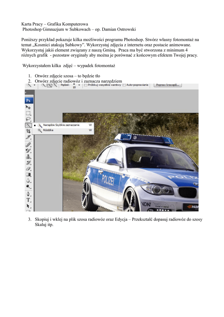 Karta Pracy – Grafika Komputerowa Photoshop Gimnazjum w Subkowach – op. Damian Ostrowski Poniższy przykład pokazuje kilka możliwości programu Photoshop. Stwórz własny fotomontaż na temat „Kosmici atakują Subkowy”. Wykorzystaj zdjęcia z internetu oraz postacie animowane. Wykorzystaj jakiś element związany z naszą Gminą. Praca ma być stworzona z minimum 4 różnych grafik - pozostaw oryginały aby można je porównać z końcowym efektem Twojej pracy. Wykorzystałem kilka zdjęć – wypadek fotomontaż 1. Otwórz zdjęcie szosa – to będzie tło 2. Otwórz zdjęcie radiowóz i zaznacza narzędziem 3. Skopiuj i wklej na plik szosa radiowóz oraz Edycja – Przekształć dopasuj radiowóz do szosy Skaluj itp. 4. W trybie Przekształcania dopasuj wygląd samochodu. 5. Otwórz plik Strus i zaznacz narzędziem Różdżka tło Strusia po czym wybierz opcje Zaznac -Odwrotność i skopiuj Strusia na Szosę. 6. Otwórz plik Wybuch i zaznacz płomień oraz wklej go na Szosę oraz dopasuj p;oprzez użycie opcji Filtry – Skraplanie 7. Następnie zastosuj jeden z Filtrów – Filtry – Artystyczne – Filowanie 8. Otwórz plik Kojot i zaznacz kojota (Kadrowanie a potem Różdżka – i odwróć zaznaczanie) 9. Wklej kojota na Szosę i narzędziem Przekształcania dopasuj kojota do obrazu 10. Na palecie warstw zaznacz pierwszą warstwę Szosy oraz Narzędziem Różdżka zaznacz niebo pona górami. Następnie wybierz narzędzie Filtr - Rendering - Chmura 11. Efekt końcowy mamy tutaj