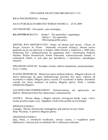 OWCZAREK FRANCUSKI BRIARD (FCI 113) KRAJ POCHODZENIA: Francja. DATA PUBLIKACJI OBECNEJ WERSJI WZORCA: 23.01.2009 UŻYTKOWOŚĆ: Owczarek i pies stróżujący. KLASYFIKACJA FCI: Grupa I Psy pasterskie i zaganiające. Sekcja 1 Psy pasterskie. Obowiązują próby pracy. KRÓTKI RYS HISTORYCZNY: Znany od dawna pod nazwą Chiens de Berger français de Plaine (francuski owczarek nizinny), obecna nazwa pojawiła się po raz pierwszy w książce Abbot Rozier o rolnictwie z 1809 roku. Hodowany był i selekcjonowany do zaganiania stad i stróżowania. Podczas obydwu Wojen Światowych Armia Francuska wykorzystywała briardy w rozmaitych rolach, w tym jako psy łącznikowe i ratownicze, odszukujące rannych. WRAŻENIE OGÓLNE: Krzepki, zwinny, dobrze umięśniony, proporcjonalny; żywy i czujny. WAŻNE PROPORCJE: Briard jest psem średniej budowy. Długość tułowia od stawu barkowego do guza siedzeniowego powinna być nieco większa od wysokości w kłębie. Długość głowy wynosi 2/5 wysokości w kłębie. Szerokość czaszki jest nieco mniejsza od połowy długości głowy. Kufa i czaszka jednakowej długości. ZACHOWANIE/TEMPERAMENT: Zrównoważony, ani lękliwy. Briard powinien być opanowany i nieustraszony. agresywny, ani GŁOWA: Mocna, długa, z długim włosem, tworzącym brodę, wąsy i brwi, trochę przykrywające oczy. Oglądane z boku linie profilu są równoległe. MÓZGOCZASZKA: Czaszka: Mocna, nieznacznie zaokrąglona, gdy patrzeć na nią z boku. Stop: Wyraźny, w połowie długości głowy. TRZEWIOCZASZKA: Nos: Duży, o otwartych nozdrzach, zawsze czarny, z wyjątkiem psów błękitnych, u których jest on niebieski lub w zbliżonym odcieniu. Kufa: Zakończona raczej kanciasto, mocna, dostatecznie szeroka , nigdy nie szpiczasta. Grzbiet nosa: Prosty. Wargi: Dobrze przylegające. Uzębienie: Szczęki mocne zęby białe, zgryz nożycowy. Oczy: Owalne, poziomo ustawione, dość duże i ciemne. U psów błękitnych mogą być jaśniejsze. Uszy: Wysoko osadzone, nie przyklejone do policzków, raczej krótkie, gdy zostawione są w stanie naturalnym – długość chrząstki niekopiowanego ucha powinna być równa lub nieco mniejsza od połowy długości głowy. Porośnięte długim włosem, płaskie. Gdy cięte (tam, gdzie nie jest to zabronione) jest sztywne i prosto noszone, nie skierowane do wewnątrz ani do zewnątrz. SZYJA: Umięśniona i ładnie wychodząca z łopatek. TUŁÓW: Linia górna: Grzbiet prosty. Lędźwie krótkie i mocne. Zad: Tylko lekko opadający, trochę zaokrąglony. Klatka piersiowa: Długa i szeroka, sięga łokcia. Żebra dobrze wysklepione. OGON: Naturalnego kształtu, nisko noszony, sięga co najmniej stawu skokowego, na końcu zawinięty, kształtu litery J. Nie może być zniekształcony. W ruchu noszony nie wyżej, niż jako przedłużenie linii grzbietu. KOŃCZYNY: Mocno umięśnione, o mocnym kośćcu, proste. WIELKOŚĆ: Pies 62 – 68 cm Suka 56 – 64 cm Ważniejsza jest proporcja wzrostu do długości ciała – briard ma być psem o wydłużonej sylwetce. Wady: Krępa, kwadratowa sylwetka i wielkość powyżej wzorcowej wykluczają ocenę doskonałą. Dyskwalifikacja: Wzrost poniżej dolnej granicy lub przekroczenie górnej granicy wzrostu o więcej, niż 2 cm. Psy i suki poniżej dolnej granicy wzrostu nie mogą być dopuszczone do hodowli. SZYJA: Umięśniona, wyraźnie widoczna. Wady: Szyja zbyt długa, zbyt krótka lub wiotka. KLATKA PIERSIOWA: Szeroka (między łokciami musi zmieścić się dłoń), głęboka, sięgająca łokcia. Wady: Klatka zbyt wąska, nie dość głęboka lub zbyt głęboka, żebra płaskie lub beczkowate. GRZBIET: Równy. Wady: Grzbiet lekko zapadnięty lub lekko wysklepiony. ZAD: Nieznacznie opadający i trochę zaokrąglony. Wady: - zad mocno ścięty lub poziomy - zad przebudowany, wyraźnie wyższy od kłębu. KOŃCZYNY: Dobrze umięśnione, o mocnym kośćcu, przednie kończyny zupełnie proste. Wady: Kończyny nie całkiem proste, zbyt szeroko rozstawione, luźne łopatki, śródręcze miękkie lub całkiem pionowe, długie palce. Strome kątowanie frontu, krótki włos na nogach, kościec lekki, słaby. Dyskwalifikacja: Kończyny przednie wyraźnie krzywe. STAW SKOKOWY: Niezbyt nisko umiejscowiony, śródstopie ustawione prawie pionowo do podłoża. Wady: Zbyt długie lub zbyt krótkie śródstopie, złe kątowanie. Dyskwalifikacja: Silnie wyrażone wady postawy kończyn tylnych. OGON: Kompletny, obficie owłosiony, z haczykiem na końcu, noszony nisko, sięga co najmniej stawu skokowego i nie więcej, niż 5 cm poniżej niego. Nie może być skrzywiony. Wady: - ogon trochę krótszy, bez haczyka, słabo owłosiony - noszony wyraźnie powyżej linii grzbietu - schowany pod brzuchem w postawie lub w ruchu. Dyskwalifikacja: - ogon położony na grzbiecie lub pionowo noszony - ślady chirurgicznego poprawiania ogona. ŁAPY: Mocne, okrągłe, kształt pośredni pomiędzy łapą kocią a zajęczą. Wady: - łapy długie, płaskie, nie dość zwarte - zwrócone na zewnątrz lub do wewnątrz - słabo owłosione. Dyskwalifikacja: Łapy mocno powykręcane. PAZURY: Czarne. Wady: Pazury szare. Dyskwalifikacja: Pazury białe. OPUSZKI: Mocne. Wady: Opuszki nie dość sprężyste, płaskie, miękkie. PALCE: Dobrze zwarte. Wady: Place luźne, długie, nie dość wysklepione. SZATA: Długa, sprężysta, sucha (włos kozi), z niezbyt obfitym podszerstkiem. Wady: - sierść nie dość sucha, trochę kędzierzawa, brak podszerstka. W przypadku kwalifikowania do hodowli ocenę sierści powtórzyć po 6 miesiącach - sierść zbyt krótka - włos cienki, delikatny. Dyskwalifikacja: Włos krótszy niż 7 cm. Sierść miękka lub wełnista. MAŚĆ: Dopuszczalne różne umaszczenia jednolite z wyjątkiem wymienionych poniżej. Pożądane ciemne odcienie. Maści dwubarwnej nie należy mylić z jaśniejszym odcieniem kończyn i brzucha, który jest dopuszczalny, o ile jest stonowany z umaszczeniem podstawowym (jasno płowy z ciemno płow