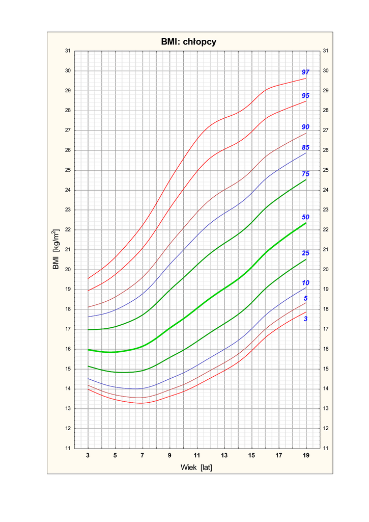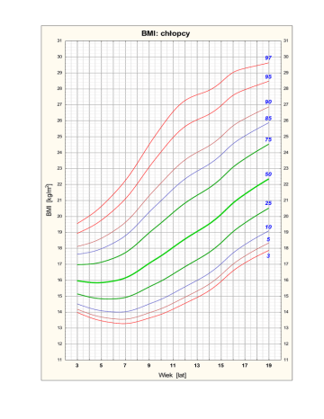 BMI: chłopcy 31 31 30 97 29 95 28 30 29 28 27 90 27 26 85 26 25 75 24 25 24 23 23 BMI [kg/m2] 50 22 22 21 25 20 21 20 10 19 19 5 18 18 3 17 17 16 16 15 15 14 14 13 13 12 12 11 11 3 5 7 9 11 Wiek [lat] 13 15 17 19