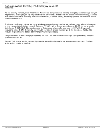Przedbórz Podsumowano kwestę. Padł kolejny rekord! 02.11.2015. Po raz siódmy Towarzystwo Miłośników Przedborza zorganizowało zbiórkę pieniędzy na renowację starych nagrobków, znajdujących się na przedborskim cmentarzu. Przez dwa dni blisko 40 wolonatriuszy, a wśród nich członkowie TMP, strażacy z OSP w Przedborzu, a także osoby, które się zgłosiły, kwestowało przed bramami cmentarza. Z roku na rok kwesty cieszą się coraz większym powodzeniem, udaje się zebrać coraz więcej pieniędzy, w tym roku pobito kolejny rekord. Zebrano 7 798,71 zł. + 5 euro sprzedane za 20,55 zł., co w sumie dało kwotę 7 819,26 zł. (dla porównania w Radomsku w tym roku zebrano 11 157 zł.). Do puszek wrzucono także 1 DM, 3 monety po 10 rubli rosyjskich oraz 2 monety po 2 lity litewskie. Każdy, kto wrzucił do puszki swój datek, otrzymał pamiątkową naklejkę. Dla porównania w roku ubiegłym zebrano 6 873,01 zł. Pomniki odnowione po ubiegłorocznej kweście pokazaliśmy TUTAJ. Zarząd TMP składa serdeczne podziękowania wszystkim Darczyńcom, Wolonatariuszom oraz Osobom, które wzięły udział w kweście. http://www.przedborz.com.pl Kreator PDF Utworzono 3 March, 2017, 16:32