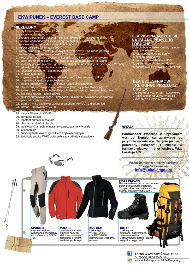 EKWIPUNEK – EVEREST BASE CAMP ` NIEZBĘDNY: 1. buty trekkingowe powyżej kostki 2. sandały lub lekkie buty DLA WSPINAJĄCYCH SIĘ 3. spodnie górskie typu softshell - cienkie i wygodne – na trekking NA ISLAND PEAK LUB 4. spodnie wodoodporne z membraną (na deszcz) - najlżejsze LOBUCHE: 5. spodnie lekkie typu safari – szybkoschnące 1. ciepłe buty wysokogórskie, najlepiej 6. kurtka polarowa (gramatura 200) podwójne lub skorupy 7. kurtka ocieplana – sweter puchowy lub syntetyczny – na zimne poranki 2. raki dopasowane do butów 8. kurtka przeciwdeszczowa – lekka i zaimpregnowana 3. czekan turystyczny 9. bielizna termoaktywna (bokserki, koszulki z krótkim i długim rękawem) 4. uprząż z 3 karabinkami HMS 10. getry stretch (rozciągliwe) – do spania, ale wygodne także na szlaku 5. ogrzewacze chemiczne do dłoni 11. skarpety górskie (cienkie i grube – syntetyczne lub z wełny merynosów) – 2/3 pary 6. bardzo ciepłe rękawice z membraną 12. rękawiczki stretch lub polar – cienkie 13. rękawice ocieplane – dla zmarzluchów 14. chustka typu buff 15.czapka – ciepła, np. z polaru lub wełny, może być wiatroszczelna 16. czapka lub kapelusz przeciwsłoneczny DLA UCZESTNIKÓW 17. plecak podręczny (ok. 30-40 litrów) – lekki, z kieszeniami TREKKINGU PRZEŁĘCZ 18. plecak duży – transportowy, >60 litrów (noszony przez Szerpów) CHO LA: 19. śpiwór o komforcie od 0 do -10 (puchowe są lżejsze, mniejsze i trwalsze) 1.lekkie turystyczne raki – koszykowe 20. kije trekkingowe – teleskopowe 2. lekki czekan turystyczny lub kij 21. okulary przeciwsłoneczne – kategoria 2 minimum , wskazane lodowcowe, trekkingowy z głowicą czekana. przydatna osłona na nos 22. latarka – tylko czołówka, zasilana bateriami AA/AAA, z diodami led 23. termos – sprawdzony 0,7-1L 24. butelka do picia na trasie – polecane marki: Nalgene, Camelbak, Sigg 25. krem z filtrem UV (30-50) 26. pomadka do ust 27. repelent przeciw moskitom 28. plastry na odciski i otarcia 29. multiwitamina i sole mineralne rozpuszczalne w wodzie WIZA: 30. leki osobiste 31. przybory toaletowe z ręcznikiem szybkoschnącym Formalności związane z uzyskaniem 32. żółta książeczka WHO potwierdzająca odbyte szczepienia wiz do Nepalu są załatwiane po przylocie na miejsce. Jedynie jest nam potrzebny paszport, 1 zdjęcie w formacie wizowym i bilet lotniczy. Wiza kosztuje 40$. Wszelkie pytania prosimy kierować do organizatorów na: [email protected] MAŁY PLECAK: Nieprzemakalny (lub z pokrowcem), pełen przydatnych kieszonek. Ten plecak w przeciwieństwie do dużego bedziemy nosić sami. SPODNIE: nieprzemakalne wykonane z membrany np. HyVent czy GORETEX POLAR: przydatny w czasie zimnych nocy czy ataku szczytowego / zamiennie z lekkim swetrem puchowym KURTKA: Lekka, typu WINDSTOPPER czy SOFT-SHELL oddychająca i odporna na wiatr BUTY: trekkingowe, ocieplane, oddychające, i nieprzemakalne. Usztywniające kostkę i przede wszystkim wygodne! AGENCJA WYPRAW 4CHALLENGE OUTDOOR SPORTS CLUB www.4challenge.com / 4challenge.org