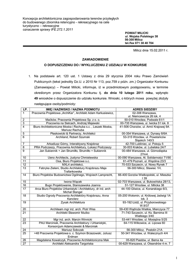 Koncepcja architektoniczna zagospodarowania terenów przyległych do budowanego zbiornika retencyjno - rekreacyjnego na cele turystyczno – rekreacyjne oznaczenie sprawy IFE.272.1.2011 POWIAT MILICKI ul. Wojska Polskiego 38 56-300 Milicz tel./fax 071 38 40 704 Milicz dnia 15.02.2011 r. ZAWIADOMIENIE O DOPUSZCZENIU DO / WYKLUCZENIU Z UDZIAŁU W KONKURSIE 1. Na podstawie art. 120 ust. 1 Ustawy z dnia 29 stycznia 2004 roku Prawo Zamówień Publicznych (tekst jednolity Dz.U. z 2010 Nr 113, poz.759 z późn. zm.) Organizator Konkursu (Zamawiajacy) – Powiat Milicki, informuje, iż w przedmiotowym postępowaniu, w terminie określonym przez Organizatora Konkursu tj. do dnia 10 lutego 2011 roku, wpłynęło 49 wniosków o dopuszczenie do udziału konkursie. Wnioski, o których mowa powyżej złożyły następujące osoby/podmioty: LP. 1 2 3 4 IMIĘ I NAZWISKO / NAZWA PODMIOTU Pracownia Projektowa „ArchiKar”, Architekt Adam Karkusiewicz, 5 6 Maćków, Pracownia Projektowa Sp. z o. o. Pracownia na Sielcach, Andrzej Majewski Biuro Architektoniczne Moska i Rachuba s.c. , Leszek Moska, Mariusz Rachuba Płaskowicki & Partnerzy, Architekci Archiland, Robert Szumski 7 8 9 Arkadiusz Górny, Interaktywny Krajobraz PRA Podczaszy, Pracownia Architektury, Łukasz Podczaszy Jan Sukiennik + Jan Strumiłło, Strumiłło + Sukiennik 10 11 12 13 Ueno Architects, Justyna Chmielewska Osa, Biuro Projektowe s.c. MXL4 architekci, Fabryka Zieleni, Studio Architektury Krajobrazu Maja Trafankowska Biuro Projektów Budownictwa Ogólnego, Wojciech Lamprecht, 14 15 16 17 19 Iwona Wiącek Bugn Projektowanie, Staniszewska Joanna Arca Biuro Projektów Urbanistyki i Architektury, dr inż. arch Michał Stangel Studio Ogrody Pracownia Architektóry Krajobrazu, Anna Kanclerz Zyxak Architektura 20 21 Architeam mgr inż. arch. Piotr Wiss Architekt Sławomir Mućko 22 23 Mgr inż. arch. Marcin Winnicki PAU Marciniak, Pracownia Architektury i Urbanistyki, Konsorcjum Adamczewski & Marciniak Mariusz Sobczak +48 Pracownia Projektowa s. c. Szymon Brzezowski, Juliusz Erdman Magdalena Kowalczyk, Pracownia Architektoniczna Mak Architekt Aleksandra Targońska 18 24 25 26 27 ADRES SIEDZIBY 02-306 Warszawa, ul. Niemcewicza 26 lok. 4 50-010 Wrocław, Podwale 61/1 00-735 Warszawa, ul. Iwicka 51 lok. 8 41-506 Chorzów, ul. Armii Krajowej 9A 00-354 Warszawa, ul. Dynasy 8/6A 53-315 Wrocław, ul. Powstańców Śląskich 140/3 42-700 Lubliniec, ul. Pokoju 5 30-003 Kraków, ul. Lubelska 24/7 00-484 Warszawa, ul. Górnośląska 27m4, 00-090 Warszawa, Al. Solidarności 71/90 61-479 Poznań, ul. Wspólna 23/3 70-533 Szczecin, ul. Nowy Rynek 7 56-300 Milicz, Stawiec 1H, 66-400 Gorzów Wielkopolski, ul. Mieszka I 39 02-703 Warszawa, ul. Bukowińska 28/13, 51-127 Wrocław, ul. Milicka 38 44-100 Gliwice, ul. Konarskiego 6/3, 05-200 Wołomin, ul. Królowej Jadwigi 1A lok. 3 93-192 Łódź, ul. Przyborowskiego W.9/37 59-430 Wądroże Wielkie, Mierczyce 77 71-743 Szczecin, ul. Ks. Barnima III Wielkiego 3/40 53-441 Wrocław, ul. Mosiężna 5/25 64-115 Wilkowice, ul. Lipowa 60 56-300 Milicz, Postolin 21A 50-341 Wrocław, ul. Walecznych 4/4 05-820 Piastów, ul. Bema 4a 00-629 Warszawa, ul. Oleandrów 4 m. 7 1 Koncepcja architektoniczna zagospodarowania terenów przyległych do budowanego zbiornika retencyjno - rekreacyjnego na cele turystyczno – rekreacyjne oznaczenie sprawy IFE.272.1.2011 POWIAT MILICKI ul. Wojska Polskiego 38 56-300 Milicz tel./fax 071 38 40 704 28 29 30 31 32 33 34 35 Kosik Autorska Pracownia Architektury, Arch-e Sp. z o.o. Synergia – Krzysztof Cebrat, Pracownia Projektowa Projektowanie i Aranżacja Terenów Zieleni „Greenplus” Pronobisstudio, Grzegorz Pronobis Mrzewa Architekci Robert Mrzewa Biuro 87 A s.c. Marek Nowacki, Małgorzata Adamowicz Nowacka Studio Projektowe Jakub Gałęski, 36 37 Bronisz Land Design, Studio Krajobraz Małgorzata Sobótka 38 39 40 41 42 43 44 45 46 47 48 49 Katarzyna Solarczyk Studio Sol Pracownia Projektowa Genius Loci Jacek Rypuła A 79 Grupa projektowa, Marek Woźniczka, Piotr Zarzycki Studio M PIK Studio Kasprzak & Pałkus s.c. Archem Pracownia Projektowa Ewa Postróżna-Wajzer B Kwadrat Antoni Baryła Sinergia Urbana Małgorzata Czaban BN Studio Bartosz Narożny Biuro Studiów i Projektów architekt Barbara Średniawa Bimaco Projektowanie Architektoniczno Budowlane Leszek Idzik Artmanu Studio Marta Fiema Projektowanie i Wykonawstwo 50-306 Wrocław, ul. Damrota 37/2 50-111 Wrocław, ul. Malarska 19/24/7 56-400 Oleśnica, Piszkawa 6c 60-688 Poznań, ul. Stróżyńskiego 17A/8 41-902 Bytom, ul. Szkolna 10/46 90-625 Łódź, ul. Żeromskiego 61 lok. 12 45-231 Opole, ul. Oleska 87a 43-300 Bielsko-Biała, ul. Poniatowskiego 25 05-070 Sulejówek, ul. Truskawkowa 10 05-622 Bielsk Duży, ul. Jana Kozietulskiego 39 52-022 Wrocław, ul. Katowicka 62/2 43-220 Bojszowy, ul. Pancerniaków 89a 50-439 Wrocław, ul. Kościuszki 142/8 61-872 Poznań, ul. Królowej Jadwigi 48/2 00-716 Warszawa, ul. Bartycka 51-141 Wrocław, ul. Brzechwy 3a 93-521 Łódź, ul. Strycharska 5/48 51-126 Wrocław, ul. Złotowska 4 53-206 Wrocław, ul. Pilnikarska 32 41-908 Bytom, ul. Nowa 21/8 53-207 Wrocław, ul. Ślusarska 14A 63-400 Ostrów Wielkopolski, ul. Dembińskiego 16/17 2. Wymagania określone przez Organizatora Konkursu spełniły następujące osoby / podmioty: LP. 1 2 3 4 IMIĘ I NAZWISKO / NAZWA PODMIOTU Pracownia Projektowa „ArchiKar”, Architekt Adam Karkusiewicz, 5 6 Maćków, Pracownia Projektowa Sp. z o. o. Pracownia na Sielcach, Andrzej Majewski Biuro Architektoniczne Moska i Rachuba s.c. , Leszek Moska, Mariusz Rachuba Płaskowicki & Partnerzy, Architekci Archiland, Robert Szumski 7 8 9 Arkadiusz Górny, Interaktywny krajobraz PRA Podczaszy, Pracownia Architektury, Łukasz Podczaszy Jan Sukiennik + Jan Strumiłło, Strumiłło + Sukiennik 10 11 12 13 14 Ueno Architects, Justyna Chmielewska Osa, Biuro Projektowe s.c. MXL4 architekci, Fabryka Zieleni, Studio Architektury Krajobrazu, Biuro Projektów Budownictwa Og