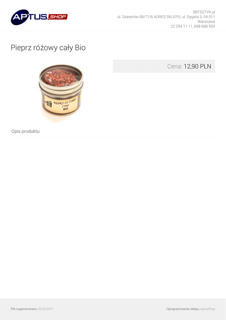 BEFSZTYK.pl ul. Szaserów 69/71/6 ADRES SKLEPU: ul. Dygata 3, 04-311 Warszawa 22 254 11 11, 668 668 500 Pieprz różowy cały Bio Cena: 12,90 PLN Opis produktu Plik wygenerowano: 03-03-2017 Powered by TCPDF (www.tcpdf.org) Oprogramowanie sklepu: AptusShop