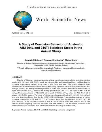 Available online at www.worldscientificnews.com WSN 50 (2016) 174-185 EISSN 2392-2192 A Study of Corrosion Behavior of Austenitic AISI 304L and 316Ti Stainless Steels in the Animal Slurry Krzysztof Rokosza, Tadeusz Hryniewiczb, Michał Uranc Division of Surface Electrochemistry and Engineering, Koszalin University of Technology, Racławicka 15-17, 75-622 Koszalin, Poland a-c E-mail addresses: [email protected] , [email protected] , [email protected] ABSTRACT The aim of this study was to compare the pitting corrosion resistance of two austenitic stainless steels, AISI 304L and AISI 316Ti, which are often used for agricultural machinery building. For the corrosion experiments, animal slurry from a pig farm was used. The results obtained from electrochemical corrosion experiments were proceeded by significance tests in Statistica software. The average value of the pitting corrosion potential of AISI 304L stainless steel in the animal slurry is equal 1044.3±146.6 mVSCE whereas the average potential for AISI 316Ti SS equals 1058.4 ±28.3m mVSCE. Corrosion potential of AISI 304L SS is equal 549±80.5 mVSCE, while for AISI 316Ti SS it equals 425.9±80.5 mVSCE. The range of pitting corrosion potentials of AISI 304L SS (364 mV SCE) was over four times higher than that for AISI 316Ti SS (84 mV SCE); the minimum values of pitting corrosion potential for AISI 304L SS (779 mVSCE) was lower than that obtained for AISI 316Ti SS (1012 mVSCE). On the basis of the results it may be concluded that AISI 304L stainless steel is less resistant in case of pitting corrosion resistance than AISI 316Ti SS. For this reason, austenitic AISI 316Ti stainless steel should be used for the transportation or storage of animal slurry. Keywords: Animal slurry; AISI 304L and 316Ti SS; Pitting corrosion; Comparison World Scientific News 50 (2016) 174-185 1. INTRODUCTION The corrosion stability of design material in a natural environment is an important feature when analyzing its behavior as a construction for machinery and equipment used in farming [1-6]. Manufacturers of agriculture equipment, instruments, tools and machinery, construction equipment, livestock buildings, edifices and facility, take into consideration possible risk of corrosion occurrence during maintenance and operation [3-10]. The highest threat of corrosion of steel appears in case of contact with chemical fertilizers, organic fertilizers, livestock manure and animal slurry. This was the main reason the alloy steels were used to operate with these means. Therefore the alloy steels may be used both for higher temperatures as well as aggressive environments. Animal slurry is a by-product arising from breeding of livestock, here swine. It is a liquid mixture of feces/excrement, urine and water. This animal slurry is used as an organic manure thanks to the content of good assimilation of alimentary/nourishment components. Dependent on the content of dry mass, the animal slurry may be characterized as thick, containing over 8% of dry mass, or diluted slurry of its content below 8%. The content of the components depends on the way of breeding, sort of livestock and feeding/nourishment: the average content of nitrogen equals 0.2-0.35%, potassium 0.2-0.3%, and phosphorus 0.050.1%. As an organic manure, it provides macro- and microelements to the soil thus resulting in changes of its physicochemical and physical properties [10-12]. The animal slurry which is to be used as the organic manure should be supplied to the soil by means of special hoses drugged after barrel or applied subsurface. Moreover it should be used in the periods regulated by a proper law [13]. The basic aim of the study was to determine the corrosion behavior of two austenitic stainless steels, AISI 304L and AISI 316Ti, after cold rolling (AR), in the aqueous solution of animal slurry [14-21]. This natural manure/slurry is used in agriculture to enrich the soil in elements and compounds of potassium and phosphorus. Knowledge on the corrosion action/behavior of steel containers/tanks and hoses is of great importance during their use and the slurry storage. 2. METHOD 2. 1. Set up and samples Potentiodynamic studies of corrosion resistance have been carried out at the Surface Electrochemistry Division, Koszalin University of Technology, on the set-up using ATLAS 98 EII with IMP98 software, the same as described recently in [WSN]. A calomel electrode (Eurosensor EK-101 No. 184) was applied for the reference, with platinum used as a current electrode. The studied samples, made of austenitic steel, were used as working electrodes. The electrochemical cell, with all electrodes used, was presented in [18]. Rectangular samples cut off of 2 mm thick sheet of austenitic cold-rolled AISI 304L and AISI 316Ti stainless steels [19-24] of dimensions 40 × 30 mm were used for the studies. The experiment was repeated seven times for each of the samples used. -175- World Scientific News 50 (2016) 174-185 2. 2. Solution used for corrosion resistance studies The animal slurry was used as the solution for the studies, with composition presented in Table 1. For each experiment, the electrochemical cell was filled in with 20 ml of the fresh solution. Table 1. Composition of the animal slurry used for experiments [10]. pH 8.01 Dry mass, wt % Contents of elements and compounds, wt %, in the fresh mass of solution N P2O5 K2O Mg Ca 0.011 0.025 0.096 0.008 0.007 0.35 3. RESULTS 3. 1. Corrosion study results for AISI 304L SS in the slurry The main corrosion study results of AISI 304L SS, with 7 repetitions, are given in Figures 1, 2, 3 and in Table 2. Corrosion potentials, measured against a calomel electrode, were in the range from –601 mV to 1143 mV. It results from the studies that the average value of the pitting corrosion potential equals 1044.3±146.6 mVSCE, at the range and median equaling 364 mVSCE and 1119 mVSCE, respectively. Corrosion potential of the linear Tafel region for this steel equals –549±80.5 mVSCE