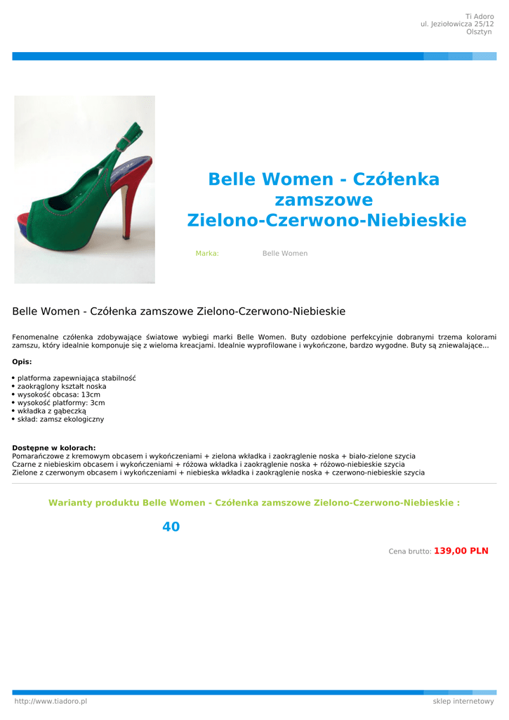 Ti Adoro ul. Jeziołowicza 25/12 Olsztyn Belle Women - Czółenka zamszowe Zielono-Czerwono-Niebieskie Marka: Belle Women Belle Women - Czółenka zamszowe Zielono-Czerwono-Niebieskie Fenomenalne czółenka zdobywające światowe wybiegi marki Belle Women. Buty ozdobione perfekcyjnie dobranymi trzema kolorami zamszu, który idealnie komponuje się z wieloma kreacjami. Idealnie wyprofilowane i wykończone, bardzo wygodne. Buty są zniewalające... Opis: platforma zapewniająca stabilność zaokrąglony kształt noska wysokość obcasa: 13cm wysokość platformy: 3cm wkładka z gąbeczką skład: zamsz ekologiczny Dostępne w kolorach: Pomarańczowe z kremowym obcasem i wykończeniami + zielona wkładka i zaokrąglenie noska + biało-zielone szycia Czarne z niebieskim obcasem i wykończeniami + różowa wkładka i zaokrąglenie noska + różowo-niebieskie szycia Zielone z czerwonym obcasem i wykończeniami + niebieska wkładka i zaokrąglenie noska + czerwono-niebieskie szycia Warianty produktu Belle Women - Czółenka zamszowe Zielono-Czerwono-Niebieskie : 40 Cena brutto: http://www.tiadoro.pl 139,00 PLN sklep internetowy
