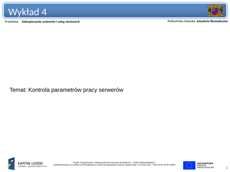 Wykład 4 Przedmiot: Zabezpieczenie systemów i usług sieciowych Politechnika Gdańska, Inżynieria Biomedyczna Temat: Kontrola parametrów pracy serwerów Projekt „Przygotowanie i realizacja kierunku inżynieria biomedyczna – studia międzywydziałowe” współfinansowany ze środków Unii Europejskiej w ramach Europejskiego Funduszu Społecznego. Nr umowy UDA – POKL.04.01.01-00-236/08 1 Jakie parametry możemy monitorować Przedmiot: Zabezpieczenie systemów i usług sieciowych Politechnika Gdańska, Inżynieria Biomedyczna - temperatura na wlocie i wylocie serwerów - temperatura procesora, pamięci, dysku twardego - awarie podzespołów - stan zasilaczy UPS, parametry napięcia - aktualny pobór prądu - dostępność maszyn i usług - obciążenie procesora - zapełnienie przestrzeni dyskowej, pamięci ram - ilość użytkowników Projekt „Przygotowanie i realizacja kierunku inżynieria biomedyczna – studia międzywydziałowe” współfinansowany ze środków Unii Europejskiej w ramach Europejskiego Funduszu Społecznego. Nr umowy UDA – POKL.04.01.01-00-236/08 2 Jak monitorujemy Przedmiot: Zabezpieczenie systemów i usług sieciowych Politechnika Gdańska, Inżynieria Biomedyczna - karty typu iLOM, DRAC, itp - interfejs zarządzania UPS - oprogramowanie testujące dostępność - liczniki wbudowane w system operacyjny - mechanizmy naszej aplikacji - liczniki w sprzęcie sieciowym Ogólnie przyjętym standardem udostępniania tego typu danych jest protokół SNMP (Simple Network Management Protocol). Jest on obecny w każdym współczesnym sprzęcie sieciowym i serwerowym. Projekt „Przygotowanie i realizacja kierunku inżynieria biomedyczna – studia międzywydziałowe” współfinansowany ze środków Unii Europejskiej w ramach Europejskiego Funduszu Społecznego. Nr umowy UDA – POKL.04.01.01-00-236/08 3 SNMP Przedmiot: Zabezpieczenie systemów i usług sieciowych Politechnika Gdańska, Inżynieria Biomedyczna - SNMPv3 najnowsza wersja protokołu - zbiór object identifiers (OID) tworzy Management information base (MIB) - podstawowe rodzaje żądań: get, set, trap Przykład: .1.3.6.1.2.1.1.1.0 = STRING: ProCurve J9022A Switch 2810-48G, revision N. 11.52, ROM N.10.01 .1.3.6.1.2.1.1.3.0 = Timeticks: (1754253550) 203 days, 0:55:35.50 .1.3.6.1.2.1.1.4.0 = STRING: [email protected] .1.3.6.1.2.1.1.5.0 = STRING: 2810-48G wea.sw.gw .1.3.6.1.2.1.1.6.0 = STRING: WEAp210 .1.3.6.1.2.1.1.7.0 = INTEGER: 74 .1.3.6.1.2.1.2.1.0 = INTEGER: 86 Projekt „Przygotowanie i realizacja kierunku inżynieria biomedyczna – studia międzywydziałowe” współfinansowany ze środków Unii Europejskiej w ramach Europejskiego Funduszu Społecznego. Nr umowy UDA – POKL.04.01.01-00-236/08 4 Czym monitorujemy Przedmiot: Zabezpieczenie systemów i usług sieciowych Politechnika Gdańska, Inżynieria Biomedyczna Najczęściej spotykane oprogramowanie: - Nagios - Cacti - Zabbix - Graphite - IBM Tivoli Projekt „Przygotowanie i realizacja kierunku inżynieria biomedyczna – studia międzywydziałowe” współfinansowany ze środków Unii Europejskiej w ramach Europejskiego Funduszu Społecznego. Nr umowy UDA – POKL.04.01.01-00-236/08 5 Czym monitorujemy Przedmiot: Zabezpieczenie systemów i usług sieciowych Politechnika Gdańska, Inżynieria Biomedyczna Projekt „Przygotowanie i realizacja kierunku inżynieria biomedyczna – studia międzywydziałowe” współfinansowany ze środków Unii Europejskiej w ramach Europejskiego Funduszu Społecznego. Nr umowy UDA – POKL.04.01.01-00-236/08 6 Czym monitorujemy Przedmiot: Zabezpieczenie systemów i usług sieciowych Politechnika Gdańska, Inżynieria Biomedyczna Projekt „Przygotowanie i realizacja kierunku inżynieria biomedyczna – studia międzywydziałowe” współfinansowany ze środków Unii Europejskiej w ramach Europejskiego Funduszu Społecznego. Nr umowy UDA – POKL.04.01.01-00-236/08 7 Czym monitorujemy Przedmiot: Zabezpieczenie systemów i usług sieciowych Politechnika Gdańska, Inżynieria Biomedyczna Projekt „Przygotowanie i realizacja kierunku inżynieria biomedyczna – studia międzywydziałowe” współfinansowany ze środków Unii Europejskiej w ramach Europejskiego Funduszu Społecznego. Nr umowy UDA – POKL.04.01.01-00-236/08 8 Po co monitorujemy Przedmiot: Zabezpieczenie systemów i usług sieciowych Politechnika Gdańska, Inżynieria Biomedyczna - przez redundancję łatwo przegapić awarię sprzętu - zarządzanie obciążeniem infrastruktury - trend wykorzystania zasobów pozwala lepiej planowć zakupy - odnajdywanie "wąskich gardeł" w aplikacjach - reagowanie na problemy z usługą zanim zadzwoni klient - odciążenie zespołu administratorów Projekt „Przygotowanie i realizacja kierunku inżynieria biomedyczna – studia międzywydziałowe” współfinansowany ze środków Unii Europejskiej w ramach Europejskiego Funduszu Społecznego. Nr umowy UDA – POKL.04.01.01-00-236/08 9