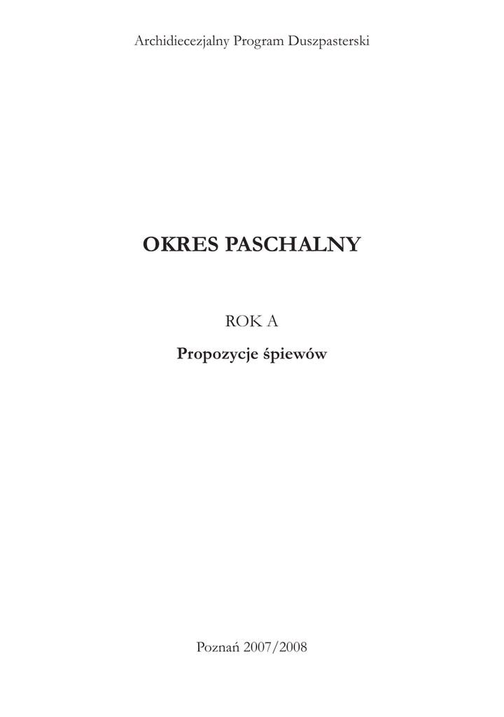 Archidiecezjalny Program Duszpasterski Okres PASCHALNy ROK A Propozycje śpiewów Poznań 2007/2008 21 WIELKI CZWARTEK W. W Krzyżu cierpienie; A myśmy się chlubić powinni (antyfona śpiewana na przemian z pieśnią: W krzyżu cierpienie); Pan wieczernik przygotował Podczas obrzędu umycia nóg: Przykazanie nowe D. Jak Cię zrozumieć, Tajemnico; Gdzie miłość wzajemna K. Kiedy razem się schodzimy; Pan wieczernik przygotował; Umiłowałeś nas do końca U. Dziękujemy Ci, Ojcze nasz Podczas przeniesienia N.S. do ołtarza wystawienia: Sław, języku, Tajemnicę WIELKI PIĄTEK Adoracja Krzyża Ludu mój, ludu + Święty Boże; Krzyżu Święty, nade wszystko; Krzyżu, mój krzyżu; Krzyżu Chrystusa; Najdroższy Jezu K. O Krwi Najdroższa; Witam Cię, witam U. Śpiewaj sercem całym; Witaj, krzyżu zwycięski Podczas procesji do Grobu: Odszedł Pasterz WIGILIA PASCHALNA Po odnowieniu przyrzeczeń chrzcielnych: O Chryste, nasz Panie; Com przyrzekł Bogu D. Otrzyjcie już łzy K. Zwycięzca śmierci; Oto dzień, w którym Pan nasz zmartwychwstał Podczas procesji rezurekcyjnej: Wesoły nam dzień dziś nastał 22 Po powrocie: Ciebie Boga wysławiamy Po błogosławieństwie N.S.: Pan zmartwychwstał i jest z nami; Wesel się, Królowo miła I Niedziela Wielkanocna W. Wesoły nam dzień dziś nastał D. Otrzyjcie już łzy, płaczący K. Zwycięzca śmierci U. Alleluja, biją dzwony Z. Pan zmartwychwstał i jest z nami; Regina caeli (Wesel się, Królowo miła) II Niedziela Wielkanocna – Niedziela Miłosierdzia Bożego Błogosławieni, którzy nie widzieli, a uwierzyli W. Bądź uwielbiony, miłosierny Boże; D. Alleluja, alleluja, O dniu radosny K. Zbliżam się w pokorze U. Dziękujemy Ci, Ojcze nasz; Wysławiajmy Chrysta Pana Z. Jezu, ufam Tobie; Miłosierdzie Boże, tryskające III Niedziela Wielkanocna Poznali Chrystusa przy łamaniu chleba W. Zwycięzca śmierci; Chrystus zmartwychwstał jest D. Alleluja, biją dzwony; Gdzie jest, o śmierci, twoje zwycięstwo (dodatek nutowy) K. Wesoły nam dzień dziś nastał; Ojciec nam powierzył Słowo U. Alleluja, alleluja, alleluja. Chwalcie Pana, bo dobry Z. Oto dzień, w którym Pan nasz zmartwychwstał; Przez twoje święte zmartwychpowstanie 23 IV Niedziela Wielkanocna Jezus jest bramą owiec W. O Panie, Tyś moim Pasterzem; Na świętej uczcie Baranka D. Jeden chleb; Dobry Pasterzu, miłosierny Panie K. Panie, pragnienia ludzkich serc U. Cały świat niech śpiewa tę pieśń; Oto dzień, w którym Pan nasz zmartwychwstał Z. Wstał Pan Chrystus z martwych ninie; Chrystus Pan zmartwychwstał zwycięstwo otrzymał V Niedziela Wielkanocna Ja jestem drogą, prawdą i życiem W. Ludu kapłański – (7 zwr.) D. Już zbawiciel, Jezus żyje; Nadzieja nasza w Zmartwychwstałym K. O Panie, Ty nam dajesz U. Radośnie Panu hymn śpiewajmy, alleluja Błogosławcie Pana, wszystkie dzieła Pańskie, alleluja Z. Nie zna śmierci Pan żywota; Zmartwychwstał Zbawca nasz VI Niedziela Wielkanocna Będę prosił Ojca, a da wam Ducha Prawdy W. Gdzie miłość wzajemna D. Przykazanie nowe daję wam K. Skosztujcie i zobaczcie U. Dzięki, o Panie, składamy dzięki; Panie mój, cóż Ci oddać mogę Z. Otrzyjcie już łzy płaczący; Dziś Chrystus Król wiecznej chwały 24 VII Niedziela Wielkanocna – Wniebowstąpienie Pańskie W. Chrystus Pan w niebo wstępuje D. Przez Twoje święte Wniebowstąpienie; Otoczon gronem świętych Aniołów; Boże, zmiłuj się nad nami, pobłogosław, udziel łaski K. Ciebie całą duszą pragnę; Panie, pragnienia ludzkich serc U. Upadnij na kolana Z. Idźcie na cały świat; Ciesz się, Królowo Anielska Niedziela Zesłania Ducha Św. W. O Stworzycielu Duchu przyjdź D. Duch Pański napełnił okrąg ziemi; Duchu Najświętszy, otwórz usta moje O Tajemniczy Płomieniu (dodatek nutowy) K. Ojciec nam powierzył Słowo; Pan wieczernik przygotował U. Niech z serca płynie pieśń; Bogu Ojcu przez Jezusa Chrystusa Z. Pamiątkę dnia wesołego; Idźcie na cały świat; Otwórzcie serca, tchnienie daje Bóg Pieśni w powyższych propozycjach zaczerpnięte są ze śpiewnika Exultate Deo (2004) i śpiewnika Siedleckiego (2001). Zaproponowano także kilka pieśni – do wyboru. 25