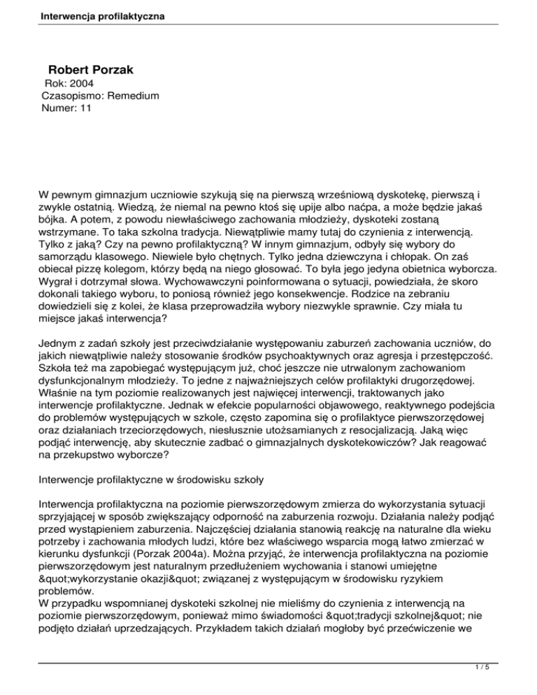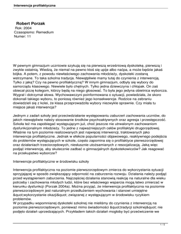 Interwencja profilaktyczna Robert Porzak Rok: 2004 Czasopismo: Remedium Numer: 11 W pewnym gimnazjum uczniowie szykują się na pierwszą wrześniową dyskotekę, pierwszą i zwykle ostatnią. Wiedzą, że niemal na pewno ktoś się upije albo naćpa, a może będzie jakaś bójka. A potem, z powodu niewłaściwego zachowania młodzieży, dyskoteki zostaną wstrzymane. To taka szkolna tradycja. Niewątpliwie mamy tutaj do czynienia z interwencją. Tylko z jaką? Czy na pewno profilaktyczną? W innym gimnazjum, odbyły się wybory do samorządu klasowego. Niewiele było chętnych. Tylko jedna dziewczyna i chłopak. On zaś obiecał pizzę kolegom, którzy będą na niego głosować. To była jego jedyna obietnica wyborcza. Wygrał i dotrzymał słowa. Wychowawczyni poinformowana o sytuacji, powiedziała, że skoro dokonali takiego wyboru, to poniosą również jego konsekwencje. Rodzice na zebraniu dowiedzieli się z kolei, że klasa przeprowadziła wybory niezwykle sprawnie. Czy miała tu miejsce jakaś interwencja? Jednym z zadań szkoły jest przeciwdziałanie występowaniu zaburzeń zachowania uczniów, do jakich niewątpliwie należy stosowanie środków psychoaktywnych oraz agresja i przestępczość. Szkoła też ma zapobiegać występującym już, choć jeszcze nie utrwalonym zachowaniom dysfunkcjonalnym młodzieży. To jedne z najważniejszych celów profilaktyki drugorzędowej. Właśnie na tym poziomie realizowanych jest najwięcej interwencji, traktowanych jako interwencje profilaktyczne. Jednak w efekcie popularności objawowego, reaktywnego podejścia do problemów występujących w szkole, często zapomina się o profilaktyce pierwszorzędowej oraz działaniach trzeciorzędowych, niesłusznie utożsamianych z resocjalizacją. Jaką więc podjąć interwencję, aby skutecznie zadbać o gimnazjalnych dyskotekowiczów? Jak reagować na przekupstwo wyborcze? Interwencje profilaktyczne w środowisku szkoły Interwencja profilaktyczna na poziomie pierwszorzędowym zmierza do wykorzystania sytuacji sprzyjającej w sposób zwiększający odporność na zaburzenia rozwoju. Działania należy podjąć przed wystąpieniem zaburzenia. Najczęściej działania stanowią reakcję na naturalne dla wieku potrzeby i zachowania młodych ludzi, które bez właściwego wsparcia mogą łatwo zmierzać w kierunku dysfunkcji (Porzak 2004a). Można przyjąć, że interwencja profilaktyczna na poziomie pierwszorzędowym jest naturalnym przedłużeniem wychowania i stanowi umiejętne "wykorzystanie okazji" związanej z występującym w środowisku ryzykiem problemów. W przypadku wspomnianej dyskoteki szkolnej nie mieliśmy do czynienia z interwencją na poziomie pierwszorzędowym, ponieważ mimo świadomości "tradycji szkolnej" nie podjęto działań uprzedzających. Przykładem takich działań mogłoby być przećwiczenie we 1/5 Interwencja profilaktyczna współpracy z samorządem szkolnym oraz rodzicami, umiejętności organizacji zabawy w trakcie dyskoteki w sposób atrakcyjny i angażujący, eliminujący potrzebę odurzania się. Profilaktyką byłoby przećwiczenie z uczniami sposobów reagowania, w razie pojawienia się podczas zabawy agresji lub propozycji wypicia alkoholu czy zażycia narkotyków. Interwencja mogłaby też objąć wypracowanie w ramach rady pedagogicznej, sposobów przygotowania i przeprowadzenia imprezy w sposób zmniejszający ryzyko pojawienia się zachowań problemowych uczniów. Zapobieganie patologii samorządności na poziomie pierwszorzędowym, wiązałoby się z przygotowaniem uczniów do przeprowadzenia demokratycznych wyborów. Dyskusja na temat istoty samorządności, demokracji oraz mechanizmu wyborów i "przekrętów" pojawiających się w wielkiej polityce, mogłaby zwiększyć odporność uczniów na przekupstwo. Takie działanie wymaga jednak zwiększenia, poprzez pogłębione szkolenie, dojrzałości i odpowiedzialności wychowawczyni i grona pedagogicznego szkoły oraz wypracowania w szkole rzeczywistego miejsca dla samorządu uczniowskiego. Zróżnicowanie poziomu materialnego rodziców w tej klasie jest bardzo duże. Dlatego dostarczenie rodzicom przed wyborami samorządowymi, krótkiej informacji na temat wzorów etycznych obowiązujących w szkole oraz ryzyka dysfunkcjonalności wiążącego się z konsumpcjonizmem, byłoby w pełni uzasadnione. Mogłoby to wpłynąć na właściwsze przygotowanie zamożniejszych pociech do sensownego dysponowania posiadanymi zasobami oraz zmniejszenie gotowości mniej zamożnych do korzystania z "pizzy wyborczej". Powyższe opisy przykładowych działań akcentują, że ważnym czynnikiem zwiększającym szanse powodzenia interwencji na poziomie pierwszorzędowym jest jej środowiskowy charakter. Skuteczne wykorzystywanie pojawiających się sytuacji rozwojowych jest możliwe, gdy występuje żywa współpraca i szeroki przepływ informacji między uczniami, rodzicami, nauczycielami i innymi pracownikami oraz środowiskiem społecznym szkoły. Interwencja na poziomie drugorzędowym stanowi reakcję na podjęte przez uczniów zachowania naruszające normy społeczne, prawne lub pierwsze próby zastosowania środków odurzających. Reakcja pojawia się w momencie występowania problemu i zmierza do stworzenia możliwości powrotu do zdrowych zachowań. Zwykle interwencja na poziomie drugorzędowym jest podejmowana wtedy, kiedy objawy zaburzeń rozwoju są już bardzo uciążliwe i niepokoją środowisko, jak w przypadku upijania się, agresji i przemocy, czy też stosowania narkotyków (Gaś 1998). Z powodu wyrazistości objawów uruchamiających interwencję drugorzędową, osoby podejmujące ją, mają skłonność do skupiania się na najważniejszych ich zdaniem objawach i kończenia działań z chwilą zmniejszenia lub wyeliminowania najbardziej uciążliwych. Należy jednak pamiętać, że interwencja na poziomie drugorzędowym powinna umożliwiać wytworzenie trwałej motywacji do zmiany swojego zachowania or