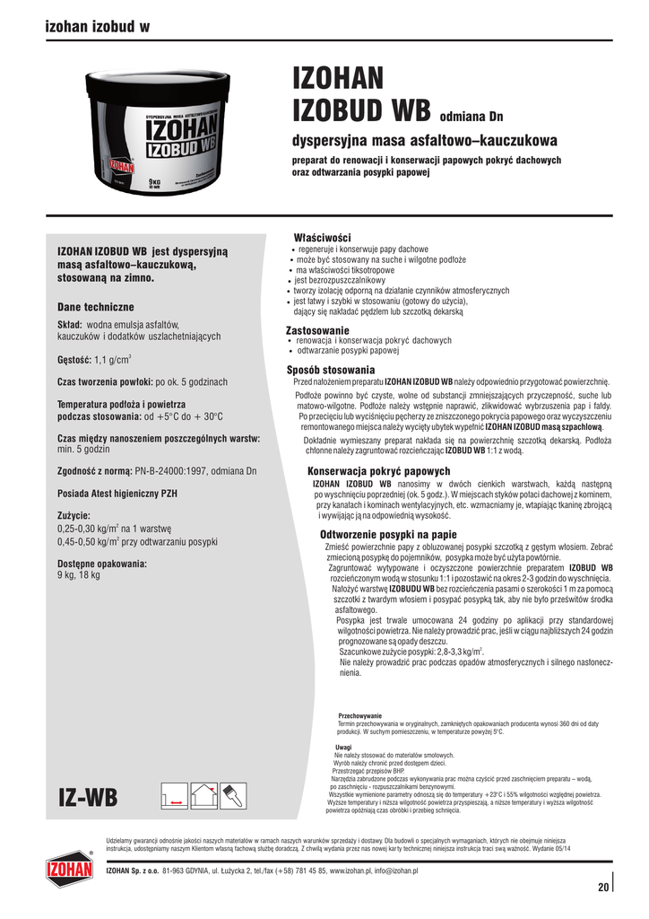 izohan?izobud w IZOHAN IZOBUD WB odmiana Dn dyspersyjna masa asfaltowo–kauczukowa preparat do renowacji i konserwacji papowych pokryæ dachowych oraz odtwarzania posypki papowej W³aœciwoœci IZOHAN IZOBUD WB jest dyspersyjn¹ mas¹ asfaltowo–kauczukow¹, stosowan¹ na zimno. Dane techniczne Sk³ad: wodna emulsja asfaltów, kauczuków i dodatków uszlachetniaj¹cych Gêstoœæ: 1,1 g/cm3 • regeneruje i konserwuje papy dachowe • mo¿e byæ stosowany na suche i wilgotne pod³o¿e • ma w³aœciwoœci tiksotropowe • jest bezrozpuszczalnikowy • tworzy izolacjê odporn¹ na dzia³anie czynników atmosferycznych • jest ³atwy i szybki w stosowaniu (gotowy do u¿ycia), daj¹cy siê nak³adaæ pêdzlem lub szczotk¹ dekarsk¹ Zastosowanie • renowacja i konserwacja pokryæ dachowych • odtwarzanie posypki papowej Sposób stosowania Czas tworzenia pow³oki: po ok. 5 godzinach Przed na³o¿eniem preparatu IZOHAN IZOBUD WB nale¿y odpowiednio przygotowaæ powierzchniê. Temperatura pod³o¿a i powietrza podczas stosowania: od +5°C do + 30°C Pod³o¿e powinno byæ czyste, wolne od substancji zmniejszaj¹cych przyczepnoœæ, suche lub matowo-wilgotne. Pod³o¿e nale¿y wstêpnie naprawiæ, zlikwidowaæ wybrzuszenia pap i fa³dy. Po przeciêciu lub wyciœniêciu pêcherzy ze zniszczonego pokrycia papowego oraz wyczyszczeniu remontowanego miejsca nale¿y wyciêty ubytek wype³niæ IZOHAN IZOBUD mas¹ szpachlow¹. Czas miêdzy nanoszeniem poszczególnych warstw: min. 5 godzin Zgodnoœæ z norm¹: PN-B-24000:1997, odmiana Dn Posiada Atest higieniczny PZH Zu¿ycie: 0,25-0,30 kg/m2 na 1 warstwê 0,45-0,50 kg/m2 przy odtwarzaniu posypki Dostêpne opakowania: 9 kg, 18 kg Dok³adnie wymieszany preparat nak³ada siê na powierzchniê szczotk¹ dekarsk¹. Pod³o¿a ch³onne nale¿y zagruntowaæ rozcieñczaj¹c IZOBUD WB 1:1 z wod¹. Konserwacja pokryæ papowych IZOHAN IZOBUD WB nanosimy w dwóch cienkich warstwach, ka¿d¹ nastêpn¹ po wyschniêciu poprzedniej (ok. 5 godz.). W miejscach styków po³aci dachowej z kominem, przy kana³ach i kominach wentylacyjnych, etc. wzmacniamy je, wtapiaj¹c tkaninê zbroj¹c¹ i wywijaj¹c j¹ na odpowiedni¹ wysokoœæ. Odtworzenie posypki na papie Zmieœæ powierzchnie papy z obluzowanej posypki szczotk¹ z gêstym w³osiem. Zebraæ zmiecion¹ posypkê do pojemników, posypka mo¿e byæ u¿yta powtórnie. Zagruntowaæ wytypowane i oczyszczone powierzchnie preparatem IZOBUD WB rozcieñczonym wod¹ w stosunku 1:1 i pozostawiæ na okres 2-3 godzin do wyschniêcia. Na³o¿yæ warstwê IZOBUDU WB bez rozcieñczenia pasami o szerokoœci 1 m za pomoc¹ szczotki z twardym w³osiem i posypaæ posypk¹ tak, aby nie by³o przeœwitów œrodka asfaltowego. Posypka jest trwale umocowana 24 godziny po aplikacji przy standardowej wilgotnoœci powietrza. Nie nale¿y prowadziæ prac, jeœli w ci¹gu najbli¿szych 24 godzin prognozowane s¹ opady deszczu. Szacunkowe zu¿ycie posypki: 2,8-3,3 kg/m2. Nie nale¿y prowadziæ prac podczas opadów atmosferycznych i silnego nas³onecznienia. Przechowywanie Termin przechowywania w oryginalnych, zamkniêtych opakowaniach producenta wynosi 360 dni od daty produkcji. W suchym pomieszczeniu, w temperaturze powy¿ej 5° C. IZ-WB Uwagi Nie nale¿y stosowaæ do materia³ów smo³owych. Wyrób nale¿y chroniæ przed dostêpem dzieci. Przestrzegaæ przepisów BHP. Narzêdzia zabrudzone podczas wykonywania prac mo¿na czyœciæ przed zaschniêciem preparatu – wod¹, po zaschniêciu - rozpuszczalnikami benzynowymi. Wszystkie wymienione parametry odnosz¹ siê do temperatury +23° C i 55% wilgotnoœci wzglêdnej powietrza. Wy¿sze temperatury i ni¿sza wilgotnoœæ powietrza przyspieszaj¹, a ni¿sze temperatury i wy¿sza wilgotnoœæ powietrza opóŸniaj¹ czas obróbki i przebieg schniêcia. Udzielamy gwarancji odnoœnie jakoœci naszych materia³ów w ramach naszych warunków sprzeda¿y i dostawy. Dla budowli o specjalnych wymaganiach, których nie obejmuje niniejsza instrukcja, udostêpniamy naszym Klientom w³asn¹ fachow¹ s³u¿bê doradcz¹. Z chwil¹ wydania przez nas nowej kar ty technicznej niniejsza instrukcja traci sw¹ wa¿noœæ. Wydanie 05/14 IZOHAN Sp. z o.o. 81-963 GDYNIA, ul. £u¿ycka 2, tel./fax (+58) 781 45 85, www.izohan.pl, [email protected] 20