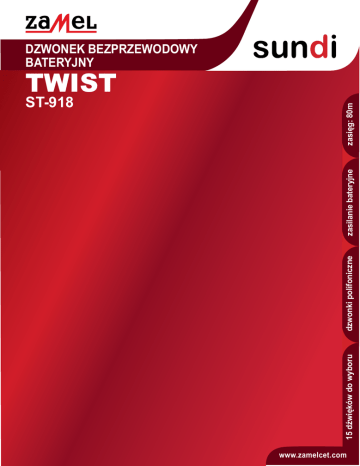 dzwonki polifoniczne zasilanie bateryjne zasięg: 80m ST-918 15 dźwięków do wyboru DZWONEK BEZPRZEWODOWY BATERYJNY TWIST www.zamelcet.com karta gwarancyjna producent udziela 24 miesięcznej gwarancji pieczęć i podpis sprzedawcy, data sprzedaży 1. ZAMEL Sp. z o.o. udziela 24 - miesięcznej gwarancji na sprzedawane towary. 2. Gwarancją ZAMEL Sp. z o.o. nie są objęte: a) mechaniczne uszkodzenia powstałe w transporcie, załadunku/ rozładunku lub innych okolicznościach, b) uszkodzenia powstałe na skutek wadliwie wykonanego montażu lub eksploatacji wyrobów ZAMEL Sp. z o.o., c) uszkodzenia powstałe na skutek jakichkolwiek przeróbek dokonanych przez KUPUJĄCEGO lub osoby trzecie a odnoszących się do wyrobów będących przedmiotem sprzedaży lub urządzeń niezbędnych do prawidłowego funkcjonowania wyrobów będących przedmiotem sprzedaży, d) uszkodzenia wynikające z działania siły wyższej lub innych zdarzeń losowych, za które ZAMEL Sp. z o.o. nie ponosi odpowiedzialności e) źródła zasilania (baterie), będące na wyposażeniu urządzenia w momencie jego sprzedaży (jeśli występują). 3. Wszelkie roszczenia z tytułu gwarancji KUPUJĄCY zgłosi w punkcie zakupu lub firmie ZAMEL Sp. z o.o. na piśmie po ich stwierdzeniu. 4. ZAMEL Sp. z o.o. zobowiązuje się do rozpatrywania reklamacji zgodnie z obowiązującymi przepisami prawa polskiego. 5. Wybór formy załatwienia reklamacji, np. wymiana towaru na wolny od wad, naprawa lub zwrot pieniędzy należy do ZAMEL Sp. z o.o. 6. Terytorialny zasięg obowiązywania gwarancji: Rzeczpospolita Polska. 7. Gwarancja nie wyłącza, nie ogranicza, ani nie zawiesza uprawnień KUPUJĄCEGO wynikających z niezgodności towaru z umową. ZAMEL sp. z o.o. 43-200 Pszczyna, ul. Zielona 27; tel.: (32) 210 46 65; fax: (32) 210 80 04 e-mail: [email protected], www.zamelcet.com TWIST ● ● ● ● ● ● ● ● ● ● ● ● ● ST-918 DZWONEK BEZPRZEWODOWY BATERYJNY idealny jako dzwonek do drzwi lub wewnętrzne urządzenie przywoławcze, przydatny w domu, firmie lub osobom wymagającym opieki, nie wymaga instalacji dzwonkowej, łatwy montaż, transmisja radiowa (433,92MHz), kodowanie: 256 kodów (kod ustawiony fabrycznie, bez możliwości zmiany kodu przez użytkownika), dzwonek zasilany 3 bateriami R6, przycisk zasilany baterią 12V, zasięg działania*: 80 metrów w terenie otwartym, przycisk nie przystosowany do pracy w zmiennych warunkach atmosferycznych, 15 melodii do wyboru (dzwonki polifoniczne), temperaturowy zakres pracy przycisku: od -20°C do +35°C, głośność: 80 dB. Instrukcja montażu wewnątrz opakowania. ST-918-001 dzwonek: 3 baterie 1,5V typ R6; IP 20 przycisk: bateria 12V typ 23A; IP 20 PN-EN 301 489-1 Masa netto wyrobu: 0,17 kg Kraj pochodzenia: PRC Producent: Q. E. Co., Ltd. 0681 Symbol oznaczający selektywne zbieranie sprzętu elektrycznego i elektronicznego. Zakaz umieszczania zużytego sprzętu z innymi odpadami. Deklaracja zgodności znajduje się na stronie internetowej www.zamelcet.com Dane techniczne: • Dzwonek TWIST: Zasilanie: 3 baterie alkaliczne 1,5V typ R6 Pobór prądu: czuwanie – 0,5mA; praca – 200mA Dźwięk: 15 melodii do wyboru (dzwonki polifoniczne) Poziom dźwięku: ok. 80dB Kodowanie: 256 kodów (kod ustawiony fabrycznie, bez możliwości zmiany kodu przez użytkownika) Stopień ochrony: IP 20 Klasa ochronności: III Temperaturowy zakres pracy: od 0°C do +35°C Wymiary [mm]: 98 x 82 x 31 • Przycisk: Zasilanie: bateria 12V typ 23A Zasięg działania*: ok. 80m w terenie otwartym Transmisja: radiowa Częstotliwość: 433,92MHz Kodowanie: 256 kodów (kod ustawiony fabrycznie, bez możliwości zmiany kodu przez użytkownika) Stopień ochrony: IP 20 Klasa ochronności: III Temperaturowy zakres pracy: od -20°C do +35°C Wymiary [mm]: 80 x 40 x 17 *Podany zasięg działania dotyczy przestrzeni otwartej czyli waruków idealnych bez przeszkód. Jeżeli pomiędzy odbiornikiem a nadajnikiem znajdują się przeszkody, należy przewidzieć zmniejszenie zasięgu działania odpowiednio dla: drewna i gipsu od 5 do 20%, cegły od 20 do 40%, betonu zbrojongo od 40 do 80%. Przy przeszkodach metalowych, stosowanie systemów radiowych nie jest zalecane z uwagi na znaczne ograniczenie zasięgu działania. Negatywny wpływ na zasięg działania mają też napowietrzne i podziemne linie energetyczne dużej mocy oraz nadajniki sieci GSM umieszczone w bliskiej odległości urządzeń. Instrukcja MONTAŻU: 1. Instalacja dzwonka i przycisku. Dzwonek ST – 918 może być stosowany jako urządzenie wolnostojące lub można je na stałe przymocować do ściany za pomocą wkrętów (rys. 2). Przycisk dzwonkowy należy przymocować do podłoża za pomocą taśmy dwustronnie przylepnej (dostarczonej wraz z kompletem) lub za pomocą dwóch wkrętów (po uprzednim rozebraniu przycisku) (rys. 5). Należy pamiętać, aby nie montować przycisku bezpośrednio na podłożu metalowym, ponieważ może to w dużym stopniu ograniczyć jego zasięg działania. 2.Wybór melodii. Wybór melodii następuje poprzez naciśnięcie przycisku znajdującego się z boku dzwonka (rys. 2). Użytkownik ma do wyboru 15 różnych melodii (dzwonki polifoniczne). Każde naciśnięcie przycisku powoduje zmianę melodii. Po wybraniu melodii i naciśnięciu przycisku, dzwonek odtwarza wybraną przez użytkownika melodię. 3.Kodowanie. W celu uniknięcia wzajemnego zakłócania się występujących w pobliżu niezależnych dzwonków, urządzenie jest kodowane (256 kodów). Kod jest ustawiany fabrycznie, użytkownik nie ma zatem możliwości zmiany kodu. 4.Wymiana baterii. Dzwonek: Dostęp do baterii jest z tyłu dzwonka po zdjęciu pokrywy gniazda baterii (rys. 2). Należy pamiętać, aby baterie umieścić zgodnie z polaryzacją, która jest oznaczona na dnie gniazda, w przeciwnym razie dojdzie do uszkodzenia dzwonka. Przycisk: Dostęp do baterii jest po usunięciu niebieskiej zaślepki i podważeniu śrubokrętem zatrzasku znajdującego si