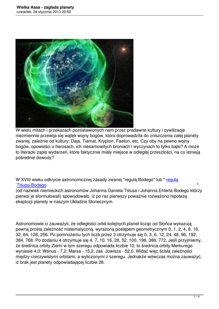 Wielka Assa - zagłada planety czwartek, 24 stycznia 2013 20:50 W wielu mitach i przekazach pozostawionych nam przez pradawne kultury i cywilizacje niezmiennie przewija się wątek wojny bogów, która doprowadziła do zniszczenia całej planety zwanej, zależnie od kultury: Deja, Tiamat, Krypton, Faeton, etc. Czy oby na pewno wojny bogów, opowieści o herosach, ich niesamowitych broniach i wyczynach to tylko bajki? A może to literacki zapis wydarzeń, które faktycznie miały miejsce w odległej przeszłości, na co istnieją pośrednie dowody? W XVIII wieku odkrycie astronomicznej zasady zwanej "regułą Bodego" lub " regułą Titiusa-Bodego " (od nazwisk niemieckich astronomów Johanna Daniela Titiusa i Johanna Ehlerta Bodego którzy pierwsi je sformułowali) spowodowało, iż po raz pierwszy poważnie rozważono hipotezę eksplozji planety w naszym Układzie Słonecznym. Astronomowie ci zauważyli, że odległości orbit kolejnych planet licząc od Słońca wykazują pewną prostą zależność matematyczną, wyrażoną postępem geometrycznym 0, 1, 2, 4, 8, 16, 32, 64, 128, 256. Po pomnożeniu tych liczb przez 3 otrzymuje się 0, 3, 6, 12, 24, 48, 96, 192, 384, 768. Po dodaniu 4 otrzymuje się 4, 7, 10, 16, 28, 52, 100, 196, 388, 772. Jeśli przyjmiemy, że średnica orbity Ziemi w tym szeregu odpowiada liczbie 10, to średnica orbity Merkurego wyniesie 4,0; Wenus - 7,2; Marsa - 15,2, zaś Jowisza - 52,0. Widać więc ścisłą zależności między rzeczywistymi orbitami, a wyliczonymi z szeregu. Jednakże wówczas można zauważyć, iż brak jest planety odpowiadającej liczbie 28. 1/4 Wielka Assa - zagłada planety czwartek, 24 stycznia 2013 20:50 Współczesny zwolennik hipotezy brakującej planety, astronom doktor Tom van Flandern , tak opisuje tę historię w książce Dark Matter, Missing Planets, and New Comets (Ciemna materia, brakujące planety i nowe komety): Astronom Johann Daniel Titius zauważył ciekawy fakt dotyczący odstępów między planetami: każda z sześciu znanych planet znajduje się w odległości od Słońca w przybliżeniu dwa razy większej niż poprzednia planeta, z jednym wyjątkiem: luki między Marsem a Jowiszem, gdzie powinna znajdować się dodatkowa planeta. Astronom Johann Bode opublikował to ciekawe spostrzeżenie w 1778 roku jako “prawo". Nie przywiązywano do tego specjalnie dużej wagi aż do 1781 roku, gdy William Herschel odkrył siódmą planetę, Urana, której odległość od Słońca znakomicie zgadza się z prawem Bodego. To zwróciło uwagę na lukę, gdzie zgodnie z tym prawem powinna znajdować się planeta 1 stycznia 1801 roku, dokładnie w odległości przewidzianej przez regułę Titiusa-Bodego włoski astronom Giuseppe Piazzi odkrył, jak się wydawało brakującą planetę krążącą wokół Słońca, którą nazwano Ceres . Jednakże nowo odkryta “planeta" okazała się być “niewiarygodnie małą w porównaniu z innymi planetami, zbyt małą nawet jak na porządny księżyc ". Sprawę skomplikował fakt, iż w tym samym roku odkryto kolejną miniaturową “planetę" w mniej więcej tej samej odległości od Słońca, którą nazwano Pallas . Tym samy w miejscu, gdzie zgodnie z regułą Titiusa-Bodego powinna znajdować się jedna duża planeta, były dwie mini planetki, z których żadna nie osiągała wielkości Księżyca. Według niemieckiego astronoma Heinricha Olbersa odnaleziono dwie planetoidy, gdyż: “duża planeta eksplodowała". Na tej podstawie Olbers przewidział, że na podobnej orbicie zostanie odkrytych zdecydowanie więcej podobnych planetoid, które “ będą zmieniać jasność przy obracaniu się, ponieważ stanowią fragmenty o nieregularnych kształtach ". Hipotezę tą rozwinął w 1814 roku francuski astronom Louis Lagrange starając się wyjaśnić pochodzenie oraz niezwykle wydłużone orbity komet. Zgodnie z jego teorią, komety były “ naturalnymi produktami ubocznymi eksplozji ", dlatego też posiadają bardzo osobliwą cechę, a raczej jej brak. Otóż jeśli przyjmie się zgodnie ze współczesną teorią astronomiczną - że większość komet pochodzi spoza Układu Słonecznego, czyli spoza orbity Plutona, to należałoby oczekiwać, że powinny występować komety poruszające się po orbitach hiperbolicznych, które znajdą się w naszym Układzie Słonecznym tylko raz, a potem wylecą z niego i nigdy nie powrócą. Jak dotąd nigdy nie zaobserwowano komety poruszającej się po takiej właśnie orbicie. 2/4 Wielka Assa - zagłada planety czwartek, 24 stycznia 2013 20:50 W 1972 roku kanadyjski astronom Michael Ovenden opracował znacznie bardziej zaawansowany wzór matematyczny, który nie tylko “przewidywał odległości między orbitami planet ", lecz także “ich największe księżyce ". Ponadto obliczył, iż pla neta musiała być gigantyczna wielkości Saturna czyli znacznie większa niż wszystkie pozostałe planety razem wzięte . Była to ważna okoliczność, której przedtem nie rozważano. Znaczyło to, że w zdarzeniu, które spowodowało zniszczenie planety, musiała występować niewyobrażalnie wielka ilość energii. Znaczyło także, iż większość pozostałości po planecie została wyrzucona całkowicie poza Układ Słoneczny Dodatkowym argumentem przemawiającym za potężną eksplozją w Układzie Słonecznym są niektóre meteoryty wykazujące ślady szybkiego topnienia, tak jakby nagle zostały poddane działaniu bardzo wysokiej temperatury. Niektóre wykazują ślady uderzeń, inne są silnie osmalone. Jeszcze inne powstały w warunkach bardzo wysokiej temperatury i/lub wysokiego ciśnienia, czyli w warunkach typowych dla wnętrza dużej planety. Na przykład znajdywano wewnątrz meteorytów małe diamenty. Jest to dowód wystawienia na działanie ogromnej energii, co konwencjonalna teoria wyjaśnia wybuchem pobliskiej supernowej. Ponadto obiekty kosmiczne nie mające atmosfery, a “znajdujące się w zewnętrznej części Układu Słonecznego s