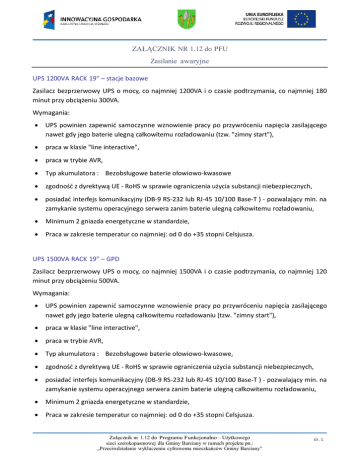 ZAŁĄCZNIK NR 1.12 do PFU Zasilanie awaryjne UPS 1200VA RACK 19" – stacje bazowe Zasilacz bezprzerwowy UPS o mocy, co najmniej 1200VA i o czasie podtrzymania, co najmniej 180 minut przy obciążeniu 300VA. Wymagania: UPS powinien zapewnić samoczynne wznowienie pracy po przywróceniu napięcia zasilającego nawet gdy jego baterie ulegną całkowitemu rozładowaniu (tzw. "zimny start"), praca w klasie "line interactive", praca w trybie AVR, Typ akumulatora : Bezobsługowe baterie ołowiowo-kwasowe zgodność z dyrektywą UE - RoHS w sprawie ograniczenia użycia substancji niebezpiecznych, posiadać interfejs komunikacyjny (DB-9 RS-232 lub RJ-45 10/100 Base-T ) - pozwalający min. na zamykanie systemu operacyjnego serwera zanim baterie ulegną całkowitemu rozładowaniu, Minimum 2 gniazda energetyczne w standardzie, Praca w zakresie temperatur co najmniej: od 0 do +35 stopni Celsjusza. UPS 1500VA RACK 19" – GPD Zasilacz bezprzerwowy UPS o mocy, co najmniej 1500VA i o czasie podtrzymania, co najmniej 120 minut przy obciążeniu 500VA. Wymagania: UPS powinien zapewnić samoczynne wznowienie pracy po przywróceniu napięcia zasilającego nawet gdy jego baterie ulegną całkowitemu rozładowaniu (tzw. "zimny start"), praca w klasie "line interactive", praca w trybie AVR, Typ akumulatora : Bezobsługowe baterie ołowiowo-kwasowe, zgodność z dyrektywą UE - RoHS w sprawie ograniczenia użycia substancji niebezpiecznych, posiadać interfejs komunikacyjny (DB-9 RS-232 lub RJ-45 10/100 Base-T ) - pozwalający min. na zamykanie systemu operacyjnego serwera zanim baterie ulegną całkowitemu rozładowaniu, Minimum 2 gniazda energetyczne w standardzie, Praca w zakresie temperatur co najmniej: od 0 do +35 stopni Celsjusza. Załącznik nr 1.12 do Programu Funkcjonalno – Użytkowego sieci szerokopasmowej dla Gminy Barciany w ramach projektu pn.: „Przeciwdziałanie wykluczeniu cyfrowemu mieszkańców Gminy Barciany” str. 1 UPS 350VA - WN01,...,WN23 Moc nie mniej niż: 350VA Czas ciągłego podtrzymania przy obciążeniu 100VA nie mniej niż: 30 minut, Funkcja AVR, UPS powinien zapewnić każdorazowe samoczynne wznowienie pracy po przywróceniu napięcia zasilającego nawet gdy jego baterie ulegną całkowitemu rozładowaniu (tzw. "zimny start"), Typ akumulatora : Bezobsługowe baterie ołowiowo-kwasowe, Minimum 2 gniazda energetyczne w standardzie C/E, Praca w zakresie temperatur co najmniej: od 0 do +35 stopni Celsjusza. Uwaga: każdy dostarczony UPS musi zostać dodatkowo wyposażony w listę zasilającą pozwalającą na zwiększenie liczby możliwych do podłączenia urządzeń: nimum 9 gniazd energetycznych z bolcem ochronnym przystosowana do montażu w szafach typu RACK 19”, zakończona wtykiem pozwalającym podpiąć listwę bezpośrednio do zaproponowanego modelu zasilacza awaryjnego UPS, Metalowa obudowa. Załącznik nr 1.12 do Programu Funkcjonalno – Użytkowego sieci szerokopasmowej dla Gminy Barciany w ramach projektu pn.: „Przeciwdziałanie wykluczeniu cyfrowemu mieszkańców Gminy Barciany” str. 2