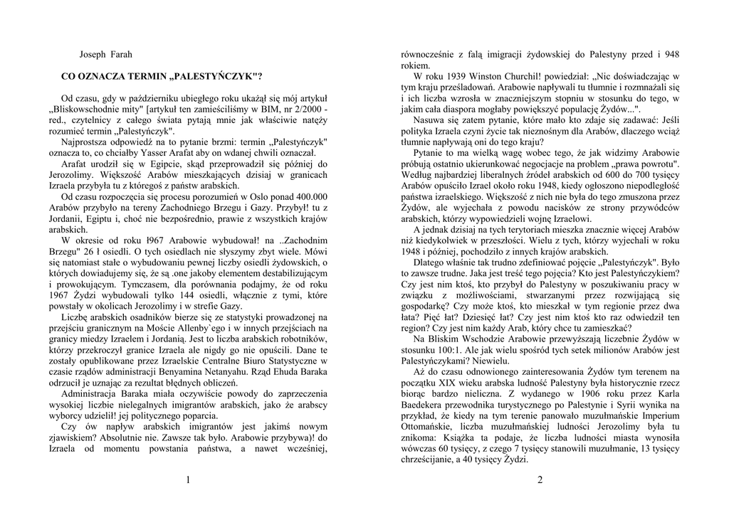 Joseph Farah CO OZNACZA TERMIN „PALESTYŃCZYK"? Od czasu, gdy w październiku ubiegłego roku ukaŜął się mój artykuł „Bliskowschodnie mity" [artykuł ten zamieściliśmy w BIM, nr 2/2000 red., czytelnicy z całego świata pytają mnie jak właściwie natęŜy rozumieć termin „Palestyńczyk". Najprostsza odpowiedź na to pytanie brzmi: termin „Palestyńczyk" oznacza to, co chciałby Yasser Arafat aby on wdanej chwili oznaczał. Arafat urodził się w Egipcie, skąd przeprowadził się później do Jerozolimy. Większość Arabów mieszkających dzisiaj w granicach Izraela przybyła tu z któregoś z państw arabskich. Od czasu rozpoczęcia się procesu porozumień w Oslo ponad 400.000 Arabów przybyło na tereny Zachodniego Brzegu i Gazy. Przybył! tu z Jordanii, Egiptu i, choć nie bezpośrednio, prawie z wszystkich krajów arabskich. W okresie od roku ł967 Arabowie wybudował! na ..Zachodnim Brzegu" 26 ł osiedli. O tych osiedlach nie słyszymy zbyt wiele. Mówi się natomiast stałe o wybudowaniu pewnej liczby osiedli Ŝydowskich, o których dowiadujemy się, Ŝe są .one jakoby elementem destabilizującym i prowokującym. Tymczasem, dla porównania podajmy, Ŝe od roku 1967 śydzi wybudowali tylko 144 osiedli, włącznie z tymi, które powstały w okolicach Jerozolimy i w strefie Gazy. Liczbę arabskich osadników bierze się ze statystyki prowadzonej na przejściu granicznym na Moście Allenby`ego i w innych przejściach na granicy miedzy Izraelem i Jordanią. Jest to liczba arabskich robotników, którzy przekroczył granice Izraela ale nigdy go nie opuścili. Dane te zostały opublikowane przez Izraelskie Centralne Biuro Statystyczne w czasie rządów administracji Benyamina Netanyahu. Rząd Ehuda Baraka odrzucił je uznając za rezultat błędnych obliczeń. Administracja Baraka miała oczywiście powody do zaprzeczenia wysokiej liczbie nielegalnych imigrantów arabskich, jako Ŝe arabscy wyborcy udzielił! jej politycznego poparcia. Czy ów napływ arabskich imigrantów jest jakimś nowym zjawiskiem? Absolutnie nie. Zawsze tak było. Arabowie przybywa)! do Izraela od momentu powstania państwa, a nawet wcześniej, 1 równocześnie z falą imigracji Ŝydowskiej do Palestyny przed i 948 rokiem. W roku 1939 Winston Churchil! powiedział: „Nic doświadczając w tym kraju prześladowań. Arabowie napływali tu tłumnie i rozmnaŜali się i ich liczba wzrosła w znaczniejszym stopniu w stosunku do tego, w jakim cała diaspora mogłaby powiększyć populację śydów...". Nasuwa się zatem pytanie, które mało kto zdaje się zadawać: Jeśli polityka Izraela czyni Ŝycie tak nieznośnym dla Arabów, dlaczego wciąŜ tłumnie napływają oni do tego kraju? Pytanie to ma wielką wagę wobec tego, Ŝe jak widzimy Arabowie próbują ostatnio ukierunkować negocjacje na problem „prawa powrotu". Według najbardziej liberalnych źródeł arabskich od 600 do 700 tysięcy Arabów opuściło Izrael około roku 1948, kiedy ogłoszono niepodległość państwa izraelskiego. Większość z nich nie była do tego zmuszona przez śydów, ale wyjechała z powodu nacisków ze strony przywódców arabskich, którzy wypowiedzieli wojnę Izraelowi. A jednak dzisiaj na tych terytoriach mieszka znacznie więcej Arabów niŜ kiedykolwiek w przeszłości. Wielu z tych, którzy wyjechali w roku 1948 i później, pochodziło z innych krajów arabskich. Dlatego właśnie tak trudno zdefiniować pojęcie „Palestyńczyk". Było to zawsze trudne. Jaka jest treść tego pojęcia? Kto jest Palestyńczykiem? Czy jest nim ktoś, kto przybył do Palestyny w poszukiwaniu pracy w związku z moŜliwościami, stwarzanymi przez rozwijającą się gospodarkę? Czy moŜe ktoś, kto mieszkał w tym regionie przez dwa łata? Pięć łat? Dziesięć łat? Czy jest nim ktoś kto raz odwiedził ten region? Czy jest nim kaŜdy Arab, który chce tu zamieszkać? Na Bliskim Wschodzie Arabowie przewyŜszają liczebnie śydów w stosunku 100:1. Ale jak wielu spośród tych setek milionów Arabów jest Palestyńczykami? Niewielu. AŜ do czasu odnowionego zainteresowania śydów tym terenem na początku XIX wieku arabska ludność Palestyny była historycznie rzecz biorąc bardzo nieliczna. Z wydanego w 1906 roku przez Karla Baedekera przewodnika turystycznego po Palestynie i Syrii wynika na przykład, Ŝe kiedy na tym terenie panowało muzułmańskie Imperium Ottomańskie, liczba muzułmańskiej ludności Jerozolimy była tu znikoma: KsiąŜka ta podaje, Ŝe liczba ludności miasta wynosiła wówczas 60 tysięcy, z czego 7 tysięcy stanowili muzułmanie, 13 tysięcy chrześcijanie, a 40 tysięcy śydzi. 2 „Liczba śydów ogromnie wzrosła w ciągu ostatnich dziesięcioleci, mimo, xc nic wolno im imigrować ani posiadać własności ziemskiej", czytamy w przewodniku. Mimo iŜ śydzi byli prześladowani, przybywali oni do Jerozolimy i juŜ w ł906 roku stanowili tu przewaŜającą większość jej mieszkańców. Dlaczego liczba ludności -muzułmańskiej była tak niska? PrzecieŜ mówi się nam, Ŝe Jerozolima jest trzecim najświętszym miejscem islamu. Gdyby -..takie przekonanie było szeroko rozpowszechnione w 1906 roku. z pewnością znacznie więcej muzułmanów byłoby się tu ' osiedliło. Prawda jest taka, Ŝe śydzi zawsze byli obecni w Jerozolimie i w całej Ziemi Świętej, na przestrzeni całej ich krwawej historii. Znakomicie udokumentowała to Joan Peters w swej przełomowej pracy „Prom Time Immemorial" („Od niepamiętnych czasów"), omawiającej początki konfliktu arabsko-Ŝydowskiego w tym regionie. Prawdą jest i to, Ŝe liczba ludności arabskiej rosła w następstwie imigracji śydów do tego regionu. Arabowie przybywał! z powodu rozwoju ekonomicznego, l czy się w to wierzy czy nic, przybywali do Izraela, poniewaŜ tu znajdowali wolność i moŜliwości, jakich nic mieli w swoich własnych krajach. Kim zatem jest Palestyńczyk? Jeśli jakikolwiek Arab moŜe mieć uzasadnione roszczenia do w