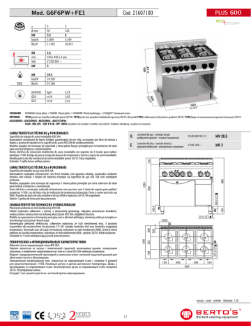 Mod. G6F6PW+FE1 TOT. 3 120 6 5.159 20.473 GN mm Volt kW 1/1 550 x 450 x 4 pos. V 220-240 ~ 3 kW kcal/h Btu/h 28,5 24.505 97.246 G30/G31 G20 G25 kg/h m3/h m3/h 900 3 90 3,5 3.009 11.942 / 23 3 600 5” 2,23 3,02 3,51 35 3/8” n. Ø mm kW kcal/h Btu/h PLUS 600 Cod. 21607100 900 35 2/5” STANDARD ESTÁNDAR Llama piloto / PADRÃO Chama piloto / STANDARD Płomień pilotujący / СТАНДАРТ Запальный огонь OPTIONAL 1P30 puerta con manilla moldeada grosor 20/10 / 1P30 porta com puxador moldado de espessura 20/10 / drzwiczki 1P30 z odlewanym uchwytem o grubości 20/10 / 1P30 дверь со штампованной ручкой толщиной 20/10. ACCESORIOS - ACESSÓRIOS - AKCESORIA - АКСЕССУАРЫ CG60 - REG GPL - GRC 1/1GN - MP - KRF6 (modelos con mueble / modelos com móvel / modele z obudową / модели со столом). CARACTERÍSTICAS TÉCNICAS y FUNCIONALES G conexión del gas - conexão do gás podłączenie gazowe - газовое соединение R 3/8 UNI ISO 7/1 kW 28,5 E conexión eléctrica - conexão eléctrica połączenie elektryczne - электрическое соединение V 220-240 ~ kW 3 120 Superficie de trabajo de acero inoxidable AISI 304. Quemadores totalmente de hierro fundido, garantizados de por vida, accionados por llave de válvula y fijados a prueba de líquidos en la superficie de acero AISI 304 de moldeo profundo. Modelos dotados de termopar de seguridad y llama piloto fuegos protegida por revestimiento de latón para una fácil limpieza y mantenimiento. Horno eléctrico de convección totalmente de acero inoxidable con soportes de 3 niveles para rejillas/ bandejas 1/1GN. Testigo de paso y testigo de alcance de temperatura. Puerta y marco de acero inoxidable. Manilla puerta de alta resistencia de acero inoxidable grosor 20/10. Patas regulables. Estándar: 1 rejilla horno antibasculante. CHARAKTERYSTYKI TECHNICZNE I FUNKCJONALNE 165 Płaszczyzna robocza ze stali nierdzewnej AISI 304. Palniki wykonane całkowicie z żeliwa, z dożywotnią gwarancją, włączane zaworowym kranikiem, wodoszczelne i umieszczone na stalowej płaszczyźnie AISI 304, dogłębnie tłoczone. Modele są wyposażone w termoparę awaryjną oraz w płomień pilotujący, chroniony osłoną z mosiądzu w celu łatwego czyszczenia i konserwacji. Konwekcyjny piekarnik elektryczny, całkowicie wykonany ze stali nierdzewnej inox, 3 poziomy wsporników dla rusztów/form do pieczenia 1/1 GN. Lampka kontrolna linii oraz kontrolka osiągniętej temperatury. Drzwiczki oraz ich część wewnętrzna wykonane ze stali nierdzewnej INOX. Uchwyt drzwi odporny na wysoką temperaturę, wykonany ze stali nierdzewnej INOX , grubość 20/10. Nóżki nastawne. Standard: nr 1 ruszt zabezpieczający przed przewróceniem. E G 140 100 (1/2") 1020 900 Superfície de trabalho de aço inox AISI 304. Queimadores realizados inteiramente com ferro fundido, com garantia vitalícia, accionados mediante torneira com válvula e fixados de maneira estanque na superfície de aço AISI 304 com moldagem profunda. Modelos equipados com termopar de segurança e chama piloto protegida por uma cobertura de latão para facilitar a limpeza e a manutenção. Forno eléctrico a convecção, realizado inteiramente com aço inox, com 3 níveis de suporte para grelhas/ assadeiras 1/1GN. Luz de linha e luz de indicação de temperatura alcançada. Porta e contra-porta de aço INOX. Puxador da porta de alta resistência de aço INOX e espessura 20/10. Pés reguláveis. Padrão: 1 grelha do forno anti-basculamento. 880 CARACTERÍSTICAS TÉCNICAS e FUNCIONAIS 15 (1/2") 150 168 Рабочий стол из нержавеющей стали AISI 304. Горелки полностью из чугуна с пожизненной гарантией, включаемые краном, оснащенным клапаном, и герметично закрепленные на столе из стали AISI 304 глубокой штамповки. Модели с предохранительной термопарой и запальным огнем с латунной защитной крышкой для облегчения чистки и обслуживания. Электрическая конвекционная печь полностью из нержавеющей стали с опорами 4 уровней для решеток/противней 1/1GN. Линейный датчик и датчик достижения температуры. Дверь и противодверь из нержавеющей стали. Высокопрочная ручка из нержавеющей стали толщиной 20/10. Регулируемые ножки. Стандарт: 1 шт. решетка для печи с системой против опрокидывания. 3.5 kW 6 kW G 3.5 kW 150 6 kW 300 272 (1/2") ТЕХНИЧЕСКИЕ и ФУНКЦИОНАЛЬНЫЕ ХАРАКТЕРИСТИКИ 6 kW 232 600 200 50 E 3.5 kW 300 150 900 escala - scale - échelle - Maßstab 1:20 17