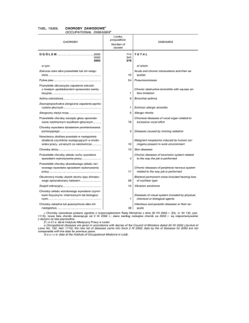 TABL. 19(89). a CHOROBY ZAWODOWE OCCUPATIONAL DISEASESa CHOROBY O G Ó Ł E M .............................................2000 2002 2003 Liczba przypadków DISEASES Number of causes 714 T O T A L 345 278 of which: w tym: Zatrucia ostre albo przewlekłe lub ich natępstwa................................................................. 10 Acute and chronic intoxications and their sequelae Pylice płuc.......................................................... 54 Pneumoconioses Przewlekłe obturacyjne zapalenie oskrzeli, z trwałym upośledzeniem sprawności wentylacyjnej ............................................................ 1 Astma oskrzelowa .............................................. 9 Bronchial asthma Zewnątrzpochodne alergiczne zapalenie pęcherzyków płucnych.............................................. 1 Extrinsic allergic alveolitis Alergiczny nieżyt nosa ....................................... 5 Przewlekłe choroby narządu głosu spowodowane nadmiernym wysiłkiem głosowym.......... 79 Choroby wywołane działaniem promieniowania joznizującego .................................................. 3 Nowotwory złośliwe powstałe w następstwie działania czynników występujących w środowisku pracy, uznanych za rakotwórcze ........... 10 Choroby skóry .................................................... 13 Skin diseases Chronic obstructive bronchitis with causes airflow limitation Allergic rhinitis Chronical diseases of vocal organ related to excessive vocal effort Diseases caused by ionizing radiation Malignant neoplasms induced by human carciogens present in work environment Przewlekłe choroby układu ruchu wywołane sposobem wykonywania pracy........................ 4 Chronic diseases of locomotor system related to the way the job is performed Przewlekłe choroby obwodowego układu nerwowego wywołane sposobem wykonywania pracy ............................................................... 11 Chronic diseases of peripheral nervous system related to the way job is performed Obustronny trwały ubytek słuchu typu ślimakowego spowodowany hałasem ......................... 26 Bilateral permanent noise-included hearing loss of cochlear type Zespół wibracyjny............................................... 12 Vibration sendrome Choroby układu wzrokowego wywołane czynnikami fizycznymi, chemicznymi lub biologicznymi................................................................. 1 Choroby zakaźne lub pasożytnicze albo ich następstwa ...................................................... 38 Diseases of visual system included by physical, chemical or biological agents Infectious and parasitic diseases or their sequels a Choroby zawodowe podano zgodnie z rozporządzeniem Rady Ministrów z dnia 30 VII 2002 r. (Dz. U. Nr 132, poz. 1115); nowa lista chorób obowiązuje od 2 IX 2002 r.; dane według rodzajów chorób za 2003 r. są nieporównywalne z danymi za lata poprzednie. Ź r ó d ł o: dane Instytutu Medycyny Pracy w Łodzi. a Occupational diseases are given in accordance with decree of the Council of Ministers dated 30 VII 2002 (Journal of Laws No. 132, item 1115); the now list of diseases came into force 2 IX 2002; data by the of diseases for 2003 are not comparable with the data for previous years. S o u r c e: data of the Institute of Occupational Medicine in Łódź.