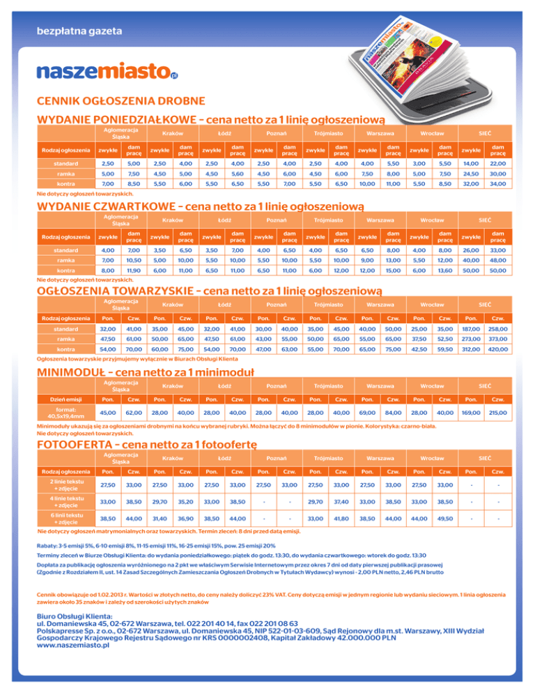 bezpłatna gazeta CENNIK OGŁOSZENIA DROBNE WYDANIE PONIEDZIAŁKOWE – cena netto za 1 linię ogłoszeniową Aglomeracja Śląska zwykłe dam pracę standard 2,50 ramka 5,00 kontra 7,00 Rodzaj ogłoszenia Kraków zwykłe dam pracę 5,00 2,50 7,50 4,50 8,50 5,50 Łódź Poznań Trójmiasto zwykłe dam pracę 4,00 2,50 4,00 2,50 4,00 5,00 4,50 5,60 4,50 6,00 6,00 5,50 6,50 5,50 7,00 5,50 zwykłe dam pracę Warszawa dam pracę zwykłe 2,50 4,00 4,00 4,50 6,00 7,50 6,50 10,00 11,00 zwykłe dam pracę Wrocław SIEĆ zwykłe dam pracę 5,50 3,00 5,50 14,00 22,00 8,00 5,00 7,50 24,50 30,00 5,50 8,50 32,00 34,00 zwykłe dam pracę Nie dotyczy ogłoszeń towarzyskich. WYDANIE CZWARTKOWE – cena netto za 1 linię ogłoszeniową Aglomeracja Śląska dam pracę Kraków zwykłe dam pracę Łódź Poznań dam pracę zwykłe 3,50 7,00 5,50 10,00 11,00 Rodzaj ogłoszenia zwykłe zwykłe standard 4,00 7,00 3,50 6,50 ramka 7,00 10,50 5,00 10,00 kontra 8,00 11,90 6,00 11,00 6,50 Trójmiasto dam pracę Warszawa dam pracę zwykłe 4,00 6,50 4,00 6,50 5,50 10,00 5,50 10,00 6,50 11,00 6,00 12,00 12,00 Wrocław dam pracę zwykłe 6,50 8,00 4,00 8,00 26,00 33,00 9,00 13,00 5,50 12,00 40,00 48,00 15,00 6,00 13,60 50,00 50,00 zwykłe dam pracę SIEĆ zwykłe dam pracę Nie dotyczy ogłoszeń towarzyskich. OGŁOSZENIA TOWARZYSKIE – cena netto za 1 linię ogłoszeniową Aglomeracja Śląska Kraków Łódź Poznań Trójmiasto Warszawa Wrocław SIEĆ Rodzaj ogłoszenia Pon. Czw. Pon. Czw. Pon. Czw. Pon. Czw. Pon. Czw. Pon. Czw. Pon. Czw. Pon. Czw. standard 32,00 41,00 35,00 45,00 32,00 41,00 30,00 40,00 35,00 45,00 40,00 50,00 25,00 35,00 187,00 258,00 ramka 47,50 61,00 50,00 65,00 47,50 61,00 43,00 55,00 50,00 65,00 55,00 65,00 37,50 52,50 273,00 373,00 kontra 54,00 70,00 60,00 75,00 54,00 70,00 47,00 63,00 55,00 70,00 65,00 75,00 42,50 59,50 312,00 420,00 Ogłoszenia towarzyskie przyjmujemy wyłącznie w Biurach Obsługi Klienta MINIMODUŁ – cena netto za 1 minimoduł Aglomeracja Śląska Kraków Łódź Poznań Trójmiasto Warszawa Wrocław SIEĆ Dzień emisji Pon. Czw. Pon. Czw. Pon. Czw. Pon. Czw. Pon. Czw. Pon. Czw. Pon. Czw. Pon. Czw. format: 40,5x19,4mm 45,00 62,00 28,00 40,00 28,00 40,00 28,00 40,00 28,00 40,00 69,00 84,00 28,00 40,00 169,00 215,00 Minimoduły ukazują się za ogłoszeniami drobnymi na końcu wybranej rubryki. Można łączyć do 8 minimodułów w pionie. Kolorystyka: czarno-biała. Nie dotyczy ogłoszeń towarzyskich. FOTOOFERTA – cena netto za 1 fotoofertę Aglomeracja Śląska Kraków Łódź Poznań Trójmiasto Warszawa Wrocław SIEĆ Rodzaj ogłoszenia Pon. Czw. Pon. Czw. Pon. Czw. Pon. Czw. Pon. Czw. Pon. Czw. Pon. Czw. Pon. Czw. 2 linie tekstu + zdjęcie 27,50 33,00 27,50 33,00 27,50 33,00 27,50 33,00 27,50 33,00 27,50 33,00 27,50 33,00 - - 4 linie tekstu + zdjęcie 33,00 38,50 29,70 35,20 33,00 38,50 - - 29,70 37,40 33,00 38,50 33,00 38,50 - - 6 linii tekstu + zdjęcie 38,50 44,00 31,40 36,90 38,50 44,00 - - 33,00 41,80 38,50 44,00 44,00 49,50 - - Nie dotyczy ogłoszeń matrymonialnych oraz towarzyskich. Termin zleceń: 8 dni przed datą emisji. Rabaty: 3-5 emisji 5%, 6-10 emisji 8%, 11-15 emisji 11%, 16-25 emisji 15%, pow. 25 emisji 20% Terminy zleceń w Biurze Obsługi Klienta: do wydania poniedziałkowego: piątek do godz. 13:30, do wydania czwartkowego: wtorek do godz. 13:30 Dopłata za publikację ogłoszenia wyróżnionego na 2 pkt we właściwym Serwisie Internetowym przez okres 7 dni od daty pierwszej publikacji prasowej (Zgodnie z Rozdziałem II, ust. 14 Zasad Szczególnych Zamieszczania Ogłoszeń Drobnych w Tytułach Wydawcy) wynosi - 2,00 PLN netto, 2,46 PLN brutto Cennik obowiązuje od 1.02.2013 r. Wartości w złotych netto, do ceny należy doliczyć 23% VAT. Ceny dotyczą emisji w jednym regionie lub wydaniu sieciowym. 1 linia ogłoszenia zawiera około 35 znaków i zależy od szerokości użytych znaków Biuro Obsługi Klienta: ul. Domaniewska 45, 02-672 Warszawa, tel. 022 201 40 14, fax 022 201 08 63 Polskapresse Sp. z o.o., 02-672 Warszawa, ul. Domaniewska 45, NIP 522-01-03-609, Sąd Rejonowy dla m.st. Warszawy, XIII Wydział Gospodarczy Krajowego Rejestru Sądowego nr KRS 0000002408, Kapitał Zakładowy 42.000.000 PLN www.naszemiasto.pl