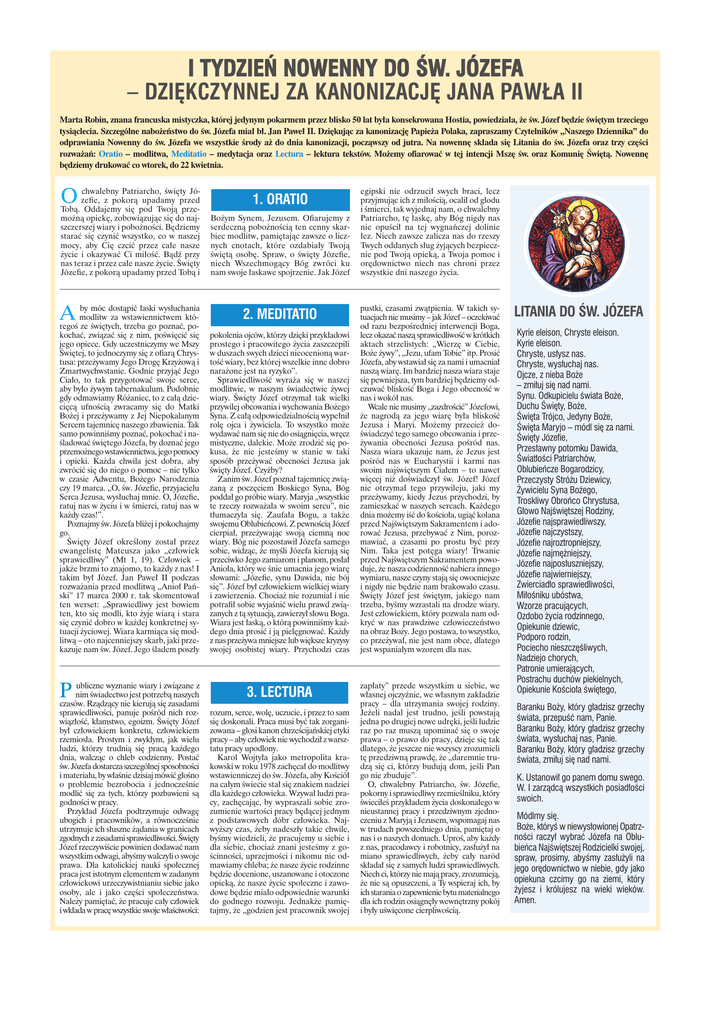 I TYDzIEŃ nOwEnnY DO św. JózEfA – dziękczynnej za kanonizację jana Pawła ii Marta Robin, znana francuska mistyczka, której jedynym pokarmem przez blisko 50 lat była konsekrowana Hostia, powiedziała, że św. Józef będzie świętym trzeciego tysiąclecia. Szczególne nabożeństwo do św. Józefa miał bł. Jan Paweł II. Dziękując za kanonizację Papieża Polaka, zapraszamy Czytelników „Naszego Dziennika” do odprawiania Nowenny do św. Józefa we wszystkie środy aż do dnia kanonizacji, począwszy od jutra. Na nowennę składa się Litania do św. Józefa oraz trzy części rozważań: Oratio – modlitwa, Meditatio – medytacja oraz Lectura – lektura tekstów. Możemy ofiarować w tej intencji Mszę św. oraz Komunię Świętą. Nowennę będziemy drukować co wtorek, do 22 kwietnia. O chwalebny Patriarcho, święty Józefie, z pokorą upadamy przed Tobą. Oddajemy się pod Twoją przemożną opiekę, zobowiązując się do najszczerszej wiary i pobożności. Będziemy starać się czynić wszystko, co w naszej mocy, aby Cię czcić przez całe nasze życie i okazywać Ci miłość. Bądź przy nas teraz i przez całe nasze życie. Święty Józefie, z pokorą upadamy przed Tobą i A by móc dostąpić łaski wysłuchania modlitw za wstawiennictwem któregoś ze świętych, trzeba go poznać, pokochać, związać się z nim, poświęcić się jego opiece. Gdy uczestniczymy we Mszy Świętej, to jednoczymy się z ofiarą Chrystusa: przeżywamy Jego Drogę Krzyżową i Zmartwychwstanie. Godnie przyjąć Jego Ciało, to tak przygotować swoje serce, aby było żywym tabernakulum. Podobnie gdy odmawiamy Różaniec, to z całą dziecięcą ufnością zwracamy się do Matki Bożej i przeżywamy z Jej Niepokalanym Sercem tajemnicę naszego zbawienia. Tak samo powinniśmy poznać, pokochać i naśladować świętego Józefa, by doznać jego przemożnego wstawiennictwa, jego pomocy i opieki. Każda chwila jest dobra, aby zwrócić się do niego o pomoc – nie tylko w czasie Adwentu, Bożego Narodzenia czy 19 marca. „O, św. Józefie, przyjacielu Serca Jezusa, wysłuchaj mnie. O, Józefie, ratuj nas w życiu i w śmierci, ratuj nas w każdy czas!”. Poznajmy św. Józefa bliżej i pokochajmy go. Święty Józef określony został przez ewangelistę Mateusza jako „człowiek sprawiedliwy” (Mt 1, 19). Człowiek – jakże brzmi to znajomo, to każdy z nas! I takim był Józef. Jan Paweł II podczas rozważania przed modlitwą „Anioł Pański” 17 marca 2000 r. tak skomentował ten werset: „Sprawiedliwy jest bowiem ten, kto się modli, kto żyje wiarą i stara się czynić dobro w każdej konkretnej sytuacji życiowej. Wiara karmiąca się modlitwą – oto najcenniejszy skarb, jaki przekazuje nam św. Józef. Jego śladem poszły P ubliczne wyznanie wiary i związane z nim świadectwo jest potrzebą naszych czasów. Rządzący nie kierują się zasadami sprawiedliwości, panuje pośród nich rozwiązłość, kłamstwo, egoizm. Święty Józef był człowiekiem konkretu, człowiekiem rzemiosła. Prostym i zwykłym, jak wielu ludzi, którzy trudnią się pracą każdego dnia, walcząc o chleb codzienny. Postać św. Józefa dostarcza szczególnej sposobności i materiału, by właśnie dzisiaj mówić głośno o problemie bezrobocia i jednocześnie modlić się za tych, którzy pozbawieni są godności w pracy. Przykład Józefa podtrzymuje odwagę ubogich i pracowników, a równocześnie utrzymuje ich słuszne żądania w granicach zgodnych z zasadami sprawiedliwości. Święty Józef rzeczywiście powinien dodawać nam wszystkim odwagi, abyśmy walczyli o swoje prawa. Dla katolickiej nauki społecznej praca jest istotnym elementem w zadanym człowiekowi urzeczywistnianiu siebie jako osoby, ale i jako części społeczeństwa. Należy pamiętać, że pracuje cały człowiek i wkłada w pracę wszystkie swoje właściwości: 1. ORATIO Bożym Synem, Jezusem. Ofiarujemy z serdeczną pobożnością ten cenny skarbiec modlitw, pamiętając zawsze o licznych cnotach, które ozdabiały Twoją świętą osobę. Spraw, o święty Józefie, niech Wszechmogący Bóg zwróci ku nam swoje łaskawe spojrzenie. Jak Józef 2. MEDITATIO pokolenia ojców, którzy dzięki przykładowi prostego i pracowitego życia zaszczepili w duszach swych dzieci nieocenioną wartość wiary, bez której wszelkie inne dobro narażone jest na ryzyko”. Sprawiedliwość wyraża się w naszej modlitwie, w naszym świadectwie żywej wiary. Święty Józef otrzymał tak wielki przywilej obcowania i wychowania Bożego Syna. Z całą odpowiedzialnością wypełnił rolę ojca i żywiciela. To wszystko może wydawać nam się nie do osiągnięcia, wręcz mistyczne, dalekie. Może zrodzić się pokusa, że nie jesteśmy w stanie w taki sposób przeżywać obecności Jezusa jak święty Józef. Czyżby? Zanim św. Józef poznał tajemnicę związaną z poczęciem Boskiego Syna, Bóg poddał go próbie wiary. Maryja „wszystkie te rzeczy rozważała w swoim sercu”, nie tłumaczyła się. Zaufała Bogu, a także swojemu Oblubieńcowi. Z pewnością Józef cierpiał, przeżywając swoją ciemną noc wiary. Bóg nie pozostawił Józefa samego sobie, widząc, że myśli Józefa kierują się przeciwko Jego zamiarom i planom, posłał Anioła, który we śnie umacnia jego wiarę słowami: „Józefie, synu Dawida, nie bój się”. Józef był człowiekiem wielkiej wiary i zawierzenia. Chociaż nie rozumiał i nie potrafił sobie wyjaśnić wielu prawd związanych z tą sytuacją, zawierzył słowu Boga. Wiara jest łaską, o którą powinniśmy każdego dnia prosić i ją pielęgnować. Każdy z nas przeżywa mniejsze lub większe kryzysy swojej osobistej wiary. Przychodzi czas 3. LECTURA rozum, serce, wolę, uczucie, i przez to sam się doskonali. Praca musi być tak zorganizowana – głosi kanon chrześcijańskiej etyki pracy – aby człowiek nie wychodził z warsztatu pracy upodlony. Karol Wojtyła jako