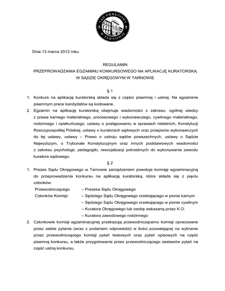 Dnia 13 marca 2012 roku REGULAMIN PRZEPROWADZANIA EGZAMINU KONKURSOWEGO NA APLIKACJĘ KURATORSKĄ W SĄDZIE OKRĘGOWYM W TARNOWIE §1 1. Konkurs na aplikację kuratorską składa się z części pisemnej i ustnej. Na egzaminie pisemnym prace kandydatów są kodowane. 2. Egzamin na aplikację kuratorską obejmuje wiadomości z zakresu: ogólnej wiedzy z prawa karnego materialnego, procesowego i wykonawczego, cywilnego materialnego, rodzinnego i opiekuńczego, ustawy o postępowaniu w sprawach nieletnich, Konstytucji Rzeczypospolitej Polskiej, ustawy o kuratorach sądowych oraz przepisów wykonawczych do tej ustawy, ustawy – Prawo o ustroju sądów powszechnych, ustawy o Sądzie Najwyższym, o Trybunale Konstytucyjnym oraz innych podstawowych wiadomości z zakresu psychologii, pedagogiki, resocjalizacji potrzebnych do wykonywania zawodu kuratora sądowego. §2 1. Prezes Sądu Okręgowego w Tarnowie zarządzeniem powołuje komisję egzaminacyjną do przeprowadzenia konkursu na aplikację kuratorską, która składa się z pięciu członków: Przewodniczącego – Prezesa Sądu Okręgowego Członków Komisji: – Sędziego Sądu Okręgowego orzekającego w pionie karnym – Sędziego Sądu Okręgowego orzekającego w pionie cywilnym – Kuratora Okręgowego lub osobę wskazaną przez K.O. – Kuratora zawodowego rodzinnego 2. Członkowie komisji egzaminacyjnej przekazują przewodniczącemu komisji opracowane przez siebie pytania (wraz z podaniem odpowiedzi) w ilości pozwalającej na wybranie przez przewodniczącego komisji pytań testowych oraz pytań opisowych na część pisemną konkursu, a także przygotowanie przez przewodniczącego zestawów pytań na część ustną konkursu. 2 3. Zakazane jest wnoszenie na salę egzaminacyjną urządzeń służących do przekazu, odbioru lub rejestracji informacji lub innych urządzeń elektronicznych z dostępem do mediów strumieniowych, a także wnoszenia tekstów aktów prawnych, komentarzy lub innych opracowań albo tekstów źródłowych mogących służyć pomocą przy rozwiązywaniu testu. Posiadane komórki na czas egzaminu kandydaci deponują do kopert, które podpisują i po zaklejeniu składają do przygotowanego pojemnika. Zakazane jest otwieranie posiadanych przez kandydatów torebek czy saszetek, komunikowanie się z innymi osobami zdającymi lub osobami z zewnętrz oraz zakłócanie przebiegu egzaminu w inny sposób. Złamanie przez kandydata powyższych zakazów skutkuje wykluczeniem z egzaminu. Co do zasady zabronione jest opuszczanie sali podczas egzaminu a w przypadku zaistnienia takiej konieczności, fakt ten jest odnotowywany na ostatniej stronie testu przez członka komisji egzaminacyjnej. 4. Wejście na salę egzaminacyjną następuje w kolejności zgodnie z listą alfabetyczną po odczytaniu przez członka komisji egzaminacyjnej imienia i nazwiska kandydata i okazaniu przez kandydata dowodu tożsamości. 5. Kandydaci losują koperty oznaczone numerami (numer widniejący na kopercie umieszczony jest na stronie niewidocznej dla kandydata podczas losowania). W kopercie znajduje się test, opieczętowane kartki do prac pisemnych oraz mała koperta – oznaczone tym samym numerem, który widnieje na dużej, wylosowanej kopercie. W małej kopercie znajduje się czysta kartka papieru, na której kandydat wpisuje swoje nazwisko i imię, następnie kopertę zakleja. Na teście i pracy pisemnej kandydat nie umieszcza swojego imienia i nazwiska. 6. Przewodniczący komisji egzaminacyjnej zarządza wyłonienie spośród kandydatów trzyosobowej komisji, która po zakończonym egzaminie pisemnym dokona zakodowania prac, a po ich sprawdzeniu przez komisję egzaminacyjną dokona odkodowania prac. 7. Część pisemna konkursu trwa 90 minut i składa się z 30 pytań testowych jednokrotnego wyboru oraz 2 pytań opisowych. Za każdą prawidłową odpowiedź na pytanie testowe kandydat otrzymuje jeden punkt, a za opracowanie pytań opisowych otrzymuje od 0 do 5 punktów za każde pytanie opisowe. Maksymalna ilość punktów w części pisemnej wynosi 40 punktów. 8. Po zakończonym egzaminie kandydat składa na stole komisji egzaminacyjnej swoją pracę pisemną wraz z zaklejoną małą kopertą zawierającą kartkę z jego imieniem i nazwiskiem. 9. Komisja wybrana spośród kandydatów pozostaje na sali egzaminacyjnej do czasu zakończenia egzaminu pisemnego. Po oddaniu wszystkich prac komisja ta dokonuje SĄD OKRĘGOWY W TARNOWIE Ul. Dąbrowskiego 27, 33-100 Tarnów tel. centrala: 14 688 74 00 NIP: 873-10-47-701 REGON: 000570708 www.tarnow.so.gov.pl 3 zakodowania prac poprzez oddzielenie od prac pisemnych zaklejonych kopert zawierających imiona i nazwiska kandydatów. Następnie prace pisemne przekazywane są Przewodniczącemu komisji egzaminacyjnej a zaklejone koperty z nazwiskami kandydatów komisja wyłoniona spośród kandydatów umieszcza w jednej dużej kopercie, którą po zaklejeniu i opisaniu przez członków komisji wyłonionej spośród kandydatów – ci przekazują Przewodniczącemu komisji egzaminacyjnej do przechowania do czasu odkodowania prac. 10. Członkowie komisji egzaminacyjnej po sprawdzeniu prac wpisują na zewnętrznej stronie testu liczbę punków uzyskanych przez kandydata z części pisemnej i podpisują się. 11. W terminie ogłoszonym przez przewodniczącego komisji na stronie internetowej sądu www.tarnow.so.gov.pl następuje odkodowanie prac. Komisja wyłoniona spośród kandydatów sprawdza w obecności wszystkich członków komisji egzaminacyjnej czy zamknięta i opisana przez nich koperta zawierająca koperty z nazwiskami kandydatów nie została naruszona. Następnie rozcina koperty zawierające kartki z imionami i nazwiskami kandydatów i dołącza je do właściwych prac kandydatów. Z czynności odkodowania sporządza protokół, który podpisują wszyscy jej członkowie. 12. Ogłoszenie odkodowaniu wyników prac, z części poprzez pisemnej konkursu ogłoszenie na następuje stronie niezwłocznie inte