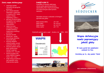 Zalety wapna defekacyjnego wspomaga szybkie tworzenie się agregatów glebowych jest cennym nawozem wapniowym o zawartości co najmniej 30% tlenku wapnia w formie węglanowej ( CaCo 3 ) poprawia strukturę gleby, szczególnie tych ciężkich zapobiegając ich zaskorupieniu wspiera procesy zachodzące w glebie (rozkład substancji organicznej, produkcja próchnicy) poprawia warunki powietrzno – wodne neutralizuje szkodliwą kwasowość gleby aktywuje składniki odżywcze gleby, przede wszystkim fosfor i azot aktywnie podnosi odczyn gleby (jednorazowy zabieg to poprawa odczynu o 0,1 – 0,6 pH) dostarcza glebie inne cenne składniki (magnez, fosfor, azot i inne) dzięki swojej strukturze jest nawozem, który działa bardzo szybko. PAMIĘTAJMY !!! Prawidłowe utrzymanie właściwego odczynu gleby gwarantuje pobranie odpowiedniej ilości innych pierwiastków oraz skuteczniejsze wykorzystanie nawożenia. Optymalne odczyny w zależności od kategorii agronomicznej gleby: Gleby bardzo lekkie Gleby lekkie Gleby średnie Gleby ciężkie pH < 5,5 pH 5,5-6,0 pH 6,0-7,0 pH > 7,0 Zasobność polskich gleb w wapń - średnia z lat 2006 - 2010 Wapno defekacyjne nawóz poprawiający jakość gleby W razie pytań lub wątpliwości zadzwoń do Nas. Jesteśmy po to, aby pomóc Tobie! www.suedzucker.pl/plantatorzy Zasady składowania i stosowania wapna nawozowego: Długookresowe przechowalnictwo wymaga okrycia oraz utwardzonego nieprzepuszczalnego podłoża Stosować je najlepiej jesienią po zbiorze przedplonu Rozsiew powinien być równomierny na całej powierzchni pola Uwzględniajmy odległości ochronne (co najmniej 20 m) od ujęć wody pitnej, oraz od brzegów zbiorników i cieków wodnych Dawki uzależniamy od wyników analiz gleby oraz warunków klimatycznych rejonu W KAŻDEJ TONIE WAPNA DEFEKACYJNEGO ZNAJDUJE SIĘ: CaO ------------ > ok. 30,00 % = 300 kg oraz inne cenne składniki takie jak: P2O5 Fosfor K2O Potas MgO Magnez Na2O Sód PAMIETAJMY!!!! Wapno nie powinno mieć bezpośredniego kontaktu na polu z nawozem organicznym (obornikiem) oraz nawożeniem fosforowym Wapno defekacyjne powstaje po odwodnieniu mleka wapiennego wykorzystywanego w produkcji cukru (oczyszczaniu soku). Jest to bezpieczny produkt przyjazny dla gleby i środowiska. Ponieważ wapno defekacyjne jest nawozem oznaczonym znakiem ,,NAWÓZ WE’’ podlega on regulacjom zapisanym w ustawie o nawozach i nawożeniu z dnia 10 lipca 2007 (Dz. U. z 14 sierpnia 2007). ZALECANE DAWKI WAPNA DEFEKACYJNEGO NA HEKTAR: WAPNOWANIE ZACHOWAWCZE WAPNOWANIE ZDROWOTNE Wapno defekacyjne rozsiewa się przy użyciu tradycyjnych rozsiewaczy nawozowych 1-2 t/ha 2 - 5 t/ha Wapno defekacyjne jako cenny nawóz może być stosowane w płodozmianach większości bardzo ważnych roślin uprawnych, a w szczególności buraków cukrowych, kukurydzy, rzepaku i zbóż Dokładny rozsiew w dawce zalecanej to podstawa sukcesu