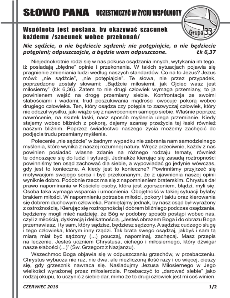 SŁOWO PANA UCZESTNICZYĆ W ŻYCIU WSPÓLNOTY Wspólnota jest posłana, by okazywać szacunek każdemu /szacunek wobec przekonań/ Nie sądźcie, a nie będziecie sądzeni; nie potępiajcie, a nie będziecie potępieni; odpuszczajcie, a będzie wam odpuszczone. Łk 6,37 Niejednokrotnie rodzi się w nas pokusa osądzania innych, wytykania im tego, iż posiadają „błędne” opinie i przekonania. W takich sytuacjach pojawia się pragnienie zmieniania ludzi według naszych standardów. Co na to Jezus? Jezus mówi: „nie sądźcie”, „nie potępiajcie”. Te słowa, nie przez przypadek, poprzedzone zostały słowami: „Bądźcie miłosierni, jak Ojciec wasz jest miłosierny” (Łk 6,36). Zatem to nie drugi człowiek wymaga przemiany, to ja powinienem wejść na drogę przemiany siebie. Konfrontacja ze swoimi słabościami i wadami, trud poszukiwania mądrości owocuje pokorą wobec drugiego człowieka. Ten, który osądza czy potępia to zazwyczaj człowiek, który nie odczuł wysiłku, jaki wiąże się z nawróceniem samego siebie. Właśnie poprzez nawrócenie, na skutek łaski, nasz sposób myślenia ulega przemianie. Kiedy stajemy wobec bliźnich z pokorą, dajemy szansę przeżycia tej łaski również naszym bliźnim. Poprzez świadectwo naszego życia możemy zachęcić do podjęcia trudu przemiany myślenia. Polecenie „nie sądźcie” w żadnym wypadku nie zabrania nam samodzielnego myślenia, które wynika z naszej rozumnej natury. Wręcz przeciwnie, każdy z nas powinien posiadać własne zdanie na różnego rodzaju tematy, również te odnoszące się do ludzi i sytuacji. Jednakże kierując się zasadą roztropności powinniśmy ten osąd zachować dla siebie, a wypowiadać go jedynie wówczas, gdy jest to konieczne. A kiedy jest to konieczne? Powinniśmy przyjrzeć się motywacjom swojego serca i być przekonanym, że z ujawnienia naszej opinii wyniknie dobro. Podobnie rzecz ma się z napomnieniem braterskim. Chrystus dał prawo napominania w Kościele osoby, która jest zgorszeniem, błądzi, myli się. Osoba taka wymaga wsparcia i umocnienia. Obojętność w takiej sytuacji byłaby brakiem miłości. W napomnieniu potrzeba miłości, pokory i taktu oraz kierowania się dobrem duchowym człowieka. Pamiętajmy jednak, by nasz osąd był wyrażony z ostrożnością. Kierując się roztropnością i dobrem bliźniego podczas osądzania, będziemy mogli mieć nadzieję, że Bóg w podobny sposób postąpi wobec nas, czyli z miłością, dyskrecją i delikatnością. „Jesteś obrazem Boga i do obrazu Boga przemawiasz, i ty sam, który sądzisz, będziesz sądzony. A sądzisz cudzego sługę i tego człowieka, którym inny rządzi. Tak brata swego osądzaj, jakbyś i sam tą miarą miał być sądzony (...) pouczaj, napominaj, zachęcaj. Masz przepis na leczenie. Jesteś uczniem Chrystusa, cichego i miłosiernego, który dźwigał nasze słabości (...)” (Św. Grzegorz z Nazjanzu). Wszechmoc Boga objawia się w odpuszczaniu grzechów, w przebaczeniu. Chrystus wybacza nie raz, nie dwa, ale niezliczoną ilość razy i co więcej, cieszy się, gdy grzesznik nawraca się. Naśladujmy Jezusa Miłosiernego w Jego wielkości wyrażonej przez miłosierdzie. Przebaczyć to „darować siebie” jako rodzaj okupu, to uczynić z siebie dar, mimo że to drugi człowiek jest mi coś winien. CZERWIEC 2016 1/2 SŁOWO PANA UCZESTNICZYĆ W ŻYCIU WSPÓLNOTY Nie sądźcie, a nie będziecie sądzeni; nie potępiajcie, a nie będziecie potępieni; odpuszczajcie, a będzie wam odpuszczone. Łk 6,37 Strumień miłosierdzia przenika do naszego serca dopiero wówczas, gdy przebaczymy naszym winowajcom. W odniesieniu do drugiego człowieka niezwykle ważny jest szacunek. Św. Jan Paweł II w swoim nauczaniu, odwołując się do misji ewangelizacyjnej Kościoła, zwraca uwagę na obowiązek poszanowania dla człowieka, jego rozumu, woli, sumienia i wolności. Papież zachęca jednocześnie do wspólnego poszukiwania prawdy, która według jego nauczania, jest warunkiem szczerego i autentycznego dialogu. Św. Jan Paweł II zachęca także do dawania swym życiem świadectwa prawdzie, pisze on: „z poszanowaniem dla wszelkich przekonań i wszelkiej wrażliwości winniśmy przede wszystkim potwierdzić z prostotą naszą wiarę w Chrystusa, jedynego Zbawiciela człowieka”. Papież przestrzega jednak przed nieograniczoną tolerancją, która wiązać by się mogła z łamaniem praw człowieka, czy też lekceważeniem podstawowych zasad moralności, która chciałaby decydować o dobru i prawdzie. Szacunku dla poglądów błędnych, heretyckich czy niemoralnych mieć nie możemy. Szanujmy prawo ludzi do posiadania poglądów odmiennych niż nasze, o ile nie sprzeciwiają się wierze i moralności katolickiej. Szanujmy, więc przede wszystkim człowieka oraz prawdę. Świadectwo Łatwo jest wyciągać pochopne wnioski odnośnie zachowań danej osoby. Niestety ta przypadłość nie jest obca również członkom naszej grupy. Wiele razy zdarzało nam się przypisywać sobie wzajemnie złe intencje, nie starając się wczuć w sytuację danej osoby. Brak czyjegoś zaangażowania w życie małej grupy tłumaczyliśmy sobie jego obojętnością lub lenistwem, niewłaściwie użyte słowa złośliwością. Po czasie okazywało się, że zachowania te podyktowane były czy to chorobą, nadmiarem obowiązków w pracy, złą kondycją psychiczną, trudną sytuacją w rodzinie, czy też zmęczeniem. Czasami zabrakło dialogu, odrobiny empatii, by to zrozumieć, bo przecież tak łatwo osądzić... Jako grupa różnimy się poglądami. Podczas rozmów komunikujemy swoje opinie na różne tematy. Często są one odmienne, jednakże staramy się z szacunkiem wysłuchać drugiej strony. Pamiętamy o tym, że mimo iż możemy różnić się w poglądach na tematy polityczne, społeczne czy kulturalne, to w podstawowych kwestiach religijnych i moralnych nasze myśli powinny zmierzać w tym samym kierunku – ku
