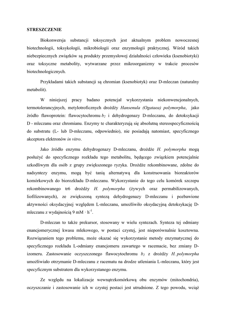 STRESZCZENIE Biokonwersja substancji toksycznych jest aktualnym problem nowoczesnej biotechnologii, toksykologii, mikrobiologii oraz enzymologii praktycznej. Wśród takich niebezpiecznych związków są produkty przemysłowej działalności człowieka (ksenobiotyki) oraz toksyczne metabolity, wytwarzane przez mikroorganizmy w trakcie procesów biotechnologicznych. Przykładami takich substancji są chromian (ksenobiotyk) oraz D-mleczan (naturalny metabolit). W niniejszej pracy badano potencjał wykorzystania niekonwencjonalnych, termotolerancyjnych, metylotroficznych drożdży Hansenula (Ogataea) polymorpha, jako źródło flawoprotein: flawocytochromu b2 i dehydrogenazy D-mleczanu, do detoksykacji D - mleczanu oraz chromianu. Enzymy te charakteryzują się absolutną stereospecyficznością do substratu (L- lub D-mleczanu, odpowiednio), nie posiadają natomiast, specyficznego akceptora elektronów in vitro. Jako źródło enzymu dehydrogenazy D-mleczanu, drożdże H. polymorpha mogą posłużyć do specyficznego rozkładu tego metabolitu, będącego związkiem potencjalnie szkodliwym dla osób z grupy zwiększonego ryzyka. Drożdże rekombinowane, zdolne do nadsyntezy enzymu, mogą być tanią alternatywą dla konstruowania bioreaktorów komórkowych do biorozkładu D-mleczanu. Wykorzystanie do tego celu komórek szczepu rekombinowanego tr6 drożdży H. polymorpha (żywych oraz permabilizowanych, liofilizowanych), ze zwiększoną syntezą dehydrogenazy D-mleczanu i pozbawione aktywności oksydacyjnej względem L-mleczanu, umożliwiło oksydacyjną detoksykację Dmleczanu z wydajnością 9 mM · h-1. D-mleczan to także prekursor, stosowany w wielu syntezach. Synteza tej odmiany enancjomerycznej kwasu mlekowego, w postaci czystej, jest nieporównalnie kosztowna. Rozwiązaniem tego problemu, może okazać się wykorzystanie metody enzymatycznej do specyficznego rozkładu L-odmiany enancjomeru zawartego w racemacie, bez zmiany Dizomeru. Zastosowanie oczyszczonego flawocytochromu b2 z drożdży H. polymorpha umożliwiało otrzymanie D-mleczanu z racematu na drodze utleniania L-mleczanu, który jest specyficznym substratem dla wykorzystanego enzymu. Ze względu na lokalizacje wewnątrzkomórkową obu enzymów (mitochondria), oczyszczanie i zastosowanie ich w czystej postaci jest utrudnione. Z tego powodu, wciąż aktualnym jest problem nadsyntezy tych enzymów za pomocą alternatywnych systemów ekspresyjnych, oraz zastosowanie podjeść inżynierii białkowej w celu modyfikacji białek, ułatwiających ich izolację i oczyszczanie. W tym celu, wykorzystano w pracy eukariotyczne i prokariotyczny system ekspresyjny do syntezy tych enzymów. Zastosowano system, oparty na drożdżach Saccharomyces cerevisiae, dla syntezy białka fuzyjnego, składającego się z połączenia białka yEGFP („Yeast Enhanced Green Fluorescent Protein”), dehydrogenazy D - mleczanu z drożdży Hansenula polymorpha oraz znacznika (His)6-tag. Eksprymowane białko fuzyjne jest zdolne do fluorescencji w komórkach gospodarza ekspresyjnego, nie wykazuje, jednak, aktywności enzymatycznej, charakterystycznej dla dehydrogenazy D - mleczanu. Natomiast, eukariotycznego układ sekrecyjny z użyciem drożdży Kluyveromyces lactis dla ekspresji pochodzącej z drożdży Hansenula polymorpha dehydrogenazy D-mleczanu powoduje sekrecję skróconej i nieaktywnej postaci enzymu. Wykorzystanie prokariotycznego systemu ekspresyjnego opartego na bakteriach Escherichia coli i wektorze plazmidowym z serii pET32a do IPTG-indukowanej ekspresji drożdżowego ORF HpCYB2, kodującego flawocytochrom b2, daje w efekcie syntezę tego enzymu w postaci ciał inkluzyjnych. Fuzja białek znacznikowych - tioredoksyny (Trx), (His)6-tag, S-tag z flawocytochromem b2, zachowuje aktywność (16 J · mg-1), enzymatyczną tego białka, po solubilizacji ciał inkluzyjnych w obecności 0,3% N-lauroilosarkozyny. Do mikrobiologicznej bioremediacji chromianu zastosowano rekombinowane drożdże H. polymorpha tr1, wykazujące zwiększoną syntezę mitochondrialnej flawoproteiny, flawocytochromu b2. Jak pokazały doświadczenia, enzym przyczynia się do wyższej aktywności bioremediacyjnej, względem chromianu, drożdży rekombinowanych w porównaniu do szczepu drożdży wyjściowych, na bazie których zostały skonstruowane. Szczep ten był zdolny do wydajnej (100%) bioremediacji redukcyjnej 1 mM chromianu. Natomiast, przy zastosowaniu czystej postaci enzymu, wykazano że Cr(VI) może bezpośrednio reagować ze zredukowaną postacią FC b2, dzięki niespecyficzności tego enzymu do akceptora elektronów in vitro, co skutkuje powstawaniem formy Cr(III). Wyselekcjonowany barwnik o aktywności redoks, dichlorofenoloindofenol, znacznie przyczynia się do zwiększonej aktywności bioremediacyjnej względem chromianu zarówno oczyszczonej postaci enzymu oraz komórek drożdży H. polymorpha (żywych bądź permabilizowanych, liofilizowanych). Wykazano ponadto, że drożdże H. polymorpha tr1 posiadają zdolność do zewnątrzkomórkowej redukcji toksycznego chromianu i chelatacji chromu(III), czego wynikiem było powstawanie biokompleksów Cr(III) w podłożu hodowlanym. Jak wykazała analiza fizyko-chemiczna, wyizolowane biokompleksy Cr(III) składają się przynajmniej z dwóch komponentów, w tym białkowego. Wyraźnie pochłaniają światło w zakresie UV posiadając piki absorbancji 275 i 325 nm oraz słabsze przy 580 i 975 nm. Biokompleksy te fluoryzują również na zielono. Posiadają także właściwości antyoksydacyjne (9,9 ÷ 21,9 J · g1 Cr) w testach z ABTS i jonami żelaza(III). Otrzymane bio-kompleksy Cr(III) wykazują pozytywną biologiczną aktywność w badaniach fizjologicznych z użyciem szczurów jako modelu badawczego: spowodowały obniżenie poziomu glukozy we krwi zwierząt, nie wykazując działania toksycznego (w teście na aktywność aminotransferaz ALAT i AST).