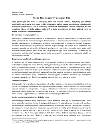 Milena Nosek, dietetyk, ekspert BoboVita Porcja Zbóż na zdrowy początek dnia 1000 pierwszych dni życia to szczególny okres dla rozwoju dziecka. Nazywany jest oknem możliwości, ponieważ w tym czasie rodzice mają realny wpływ przede wszystkim na kształtowanie nawyków żywieniowych, a także preferencji smakowych niemowlęcia. Dbałość o żywienie jest bez wątpienia istotna nie tylko podczas ciąży, czyli w życiu prenatalnym, ale także później, m.in. na etapie rozszerzania diety niemowlęcia. Po pierwsze – kontynuuj ochronę Ważna jest konsekwencja we wdrażaniu prawidłowych zachowań żywieniowych, szczególnie przez 1000 pierwszych dni życia niemowlęcia. Konsekwencja ta powinna odzwierciedlać się w podawaniu dziecku bezpiecznych, przebadanych posiłków, przygotowanych z najwyższej jakości surowców i w pełni dostosowanych do potrzeb na każdym etapie rozwoju. W okresie 1000 pierwszych dni organizm dziecka jest niezwykle delikatny i wrażliwy, m.in. na zanieczyszczenia, które może nieść nieodpowiednia żywność. Niska masa ciała, wciąż dojrzewający układ pokarmowy i kształtujący się mechanizm „odtruwania” wymaga zapewnienia niemowlęciu pożywienia o najlepszej jakości ze sprawdzonego źródła. Bezpieczne produkty dla wrażliwego organizmu Z uwagi na to, że młody organizm jest dużo bardziej narażony na zanieczyszczenia występujące w żywności niż organizm osoby dorosłej, normy jakościowe żywności dla niemowląt i małych dzieci są dużo bardziej restrykcyjne niż normy dla żywności ogólnego spożycia, a produkty przechodzą szereg testów jakości. Organizm dziecka jest szczególnie wrażliwy w pierwszych miesiącach życia, dlatego warto kontynuować jego ochronę i zapewniać mu zbilansowany, bezpieczny sposób żywienia także na etapie rozszerzania diety. Pierwszymi uzupełniającymi posiłkami powinny być pojedyncze warzywa, następnie, gdy dziecko zaakceptuje już smak warzyw, owoce oraz kaszki. Zboże to podstawa! Jedną spośród grup produktów żywnościowych będącą podstawą racji pokarmowej każdego dnia są zboża. Stanowią one niezbędne źródło węglowodanów złożonych, bardzo ważnych dla prawidłowego rozwoju dziecka, w szczególności – mózgu, a także kluczowy element w codziennym, urozmaiconym jadłospisie. Zboża dostarczają ponadto szereg witamin, np. z grupy B, dzięki którym układ nerwowy może rozwijać się prawidłowo, a także składników mineralnych i błonnika. Nauka spożywania śniadań, bez dodatku cukru Wprowadzając zboża do diety niemowlęcia, warto podawać kaszki, np. na pierwszy posiłek. Dzięki temu u dziecka kształtuje się nawyk spożywania śniadania. To ważny krok do 5 regularnych posiłków dziennie i jedna z podstawowych zasad prawidłowego odżywiania. Niestety często można zauważyć, że szczególnie małym dzieciom oferowane są dosładzane produkty: płatki śniadaniowe, kremy do kanapek czy desery mleczne, a także wyroby z dodatkiem soli. Dane pokazują, że aż 80% dzieci w wieku od 1. do 3. roku życia spożywa zbyt dużo cukru1. Badania sygnalizują także, że dzieci spożywające znaczne ilości słodkich produktów jednocześnie jedzą mniejsze ilości produktów 1 Weker H. i wsp.: „Kompleksowa ocena sposobu żywienia dzieci w wieku 13-36 miesięcy w Polsce”; Instytut Matki i Dziecka we współpracy z Fundacją NUTRICIA, 2011. mlecznych, a także warzyw oraz produktów zbożowych zawierających cenny błonnik. W ten sposób młody organizm narażony jest na ryzyko powstawania wielu chorób w przyszłości. Niemowlę rodzi się z naturalną preferencją smaku słodkiego, dlatego rozszerzanie diety powinno zaczynać się od podawania warzyw czy produktów zbożowych. Dzięki temu u dziecka wykształcą się prawidłowe nawyki żywieniowe, a preferencja smaku słodkiego nie rozwinie się. Wpłynie to na prawidłowy sposób odżywiania się malucha w przyszłości.
