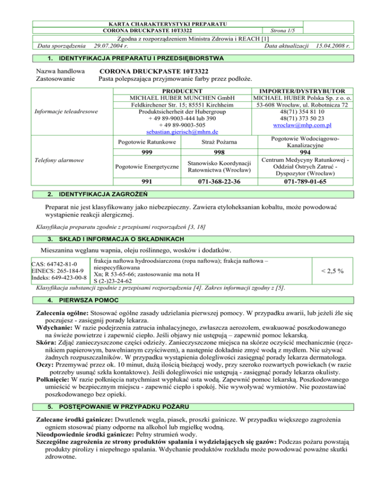 KARTA CHARAKTERYSTYKI PREPARATU CORONA DRUCKPASTE 10T3322 Data sporządzenia Strona 1/5 Zgodna z rozporządzeniem Ministra Zdrowia i REACH [1] 29.07.2004 r. Data aktualizacji 15.04.2008 r. 1. IDENTYFIKACJA PREPARATU I PRZEDSIĘBIORSTWA Nazwa handlowa Zastosowanie CORONA DRUCKPASTE 10T3322 Pasta polepszająca przyjmowanie farby przez podłoŜe. PRODUCENT MICHAEL HUBER MUNCHEN GmbH Feldkirchener Str. 15; 85551 Kirchheim Produktsicherheit der Hubergroup + 49 89-9003-444 lub 390 + 49 89-9003-505 [email protected] Informacje teleadresowe IMPORTER/DYSTRYBUTOR MICHAEL HUBER Polska Sp. z o. o. 53-608 Wrocław, ul. Robotnicza 72 48(71) 354 81 10 48(71) 373 50 23 [email protected] Pogotowie WodociągowoKanalizacyjne Pogotowie Ratunkowe StraŜ PoŜarna 999 998 994 Pogotowie Energetyczne Stanowisko Koordynacji Ratownictwa (Wrocław) Centrum Medycyny Ratunkowej Oddział Ostrych Zatruć Dyspozytor (Wrocław) 991 071-368-22-36 071-789-01-65 Telefony alarmowe 2. IDENTYFIKACJA ZAGROśEŃ Preparat nie jest klasyfikowany jako niebezpieczny. Zawiera etyloheksanian kobaltu, moŜe powodować wystąpienie reakcji alergicznej. Klasyfikacja preparatu zgodnie z przepisami rozporządzeń [3, 18] 3. SKŁAD I INFORMACJA O SKŁADNIKACH Mieszanina węglanu wapnia, oleju roślinnego, wosków i dodatków. frakcja naftowa hydroodsiarczona (ropa naftowa); frakcja naftowa – niespecyfikowana Xn; R 53-65-66; zastosowanie ma nota H S (2-)23-24-62 Klasyfikacja substancji zgodnie z przepisami rozporządzenia [4]. Zakres informacji zgodny z [5]. CAS: 64742-81-0 EINECS: 265-184-9 Indeks: 649-423-00-8 < 2,5 % 4. PIERWSZA POMOC Zalecenia ogólne: Stosować ogólne zasady udzielania pierwszej pomocy. W przypadku awarii, lub jeŜeli źle się poczujesz - zasięgnij porady lekarza. Wdychanie: W razie podejrzenia zatrucia inhalacyjnego, zwłaszcza aerozolem, ewakuować poszkodowanego na świeŜe powietrze i zapewnić ciepło. Jeśli objawy nie ustępują – zapewnić pomoc lekarską. Skóra: Zdjąć zanieczyszczone części odzieŜy. Zanieczyszczone miejsca na skórze oczyścić mechanicznie (ręcznikiem papierowym, bawełnianym czyściwem), a następnie dokładnie zmyć wodą z mydłem. Nie uŜywać Ŝadnych rozpuszczalników. W przypadku wystąpienia dolegliwości zasięgnąć porady lekarza dermatologa. Oczy: Przemywać przez ok. 10 minut, duŜą ilością bieŜącej wody, przy szeroko rozwartych powiekach (w razie potrzeby usunąć szkła kontaktowe). Jeśli dolegliwości nie ustępują - zasięgnąć porady lekarza okulisty. Połknięcie: W razie połknięcia natychmiast wypłukać usta wodą. Zapewnić pomoc lekarską. Poszkodowanego umieścić w bezpiecznym miejscu - zapewnić ciepło i spokój. Nie wywoływać wymiotów. Nie pozostawiać poszkodowanego bez opieki. 5. POSTĘPOWANIE W PRZYPADKU POśARU Zalecane środki gaśnicze: Dwutlenek węgla, piasek, proszki gaśnicze. W przypadku większego zagroŜenia ogniem stosować piany odporne na alkohol lub mgiełkę wodną. Nieodpowiednie środki gaśnicze: Pełny strumień wody. Szczególne zagroŜenia ze strony produktów spalania i wydzielających się gazów: Podczas poŜaru powstają produkty pirolizy i niepełnego spalania. Wdychanie produktów rozkładu moŜe powodować powaŜne skutki zdrowotne. KARTA CHARAKTERYSTYKI PREPARATU CORONA DRUCKPASTE 10T3322 Strona 2/5 Specjalne wyposaŜenie ochronne straŜaków: Pełne wyposaŜenie bojowe z aparatami oddechowymi. Inne informacje: Sąsiednie pojemniki chłodzić wodą. 6. POSTĘPOWANIE W PRZYPADKU NIEZAMIERZONEGO UWOLNIENIA DO ŚRODOWISKA Indywidualne środki ostroŜności: Szczegółowe informacje zamieszczone są w punkcie 7 i 8. Zapewnić przewietrzanie pomieszczeń. UniemoŜliwić dostęp osób postronnych. Unikać bezpośredniego kontaktu z preparatem. Środki ostroŜności w zakresie ochrony środowiska: Nie dopuszczać do zanieczyszczania wód powierzchniowych (gruntowych) oraz gruntu. Zapobiegać przedostaniu się zanieczyszczeń do kanalizacji. W przypadku przedostania się do rzek, przewodów kanalizacyjnych lub wodociągowych, powiadomić odpowiednie władze (Inspekcja Ochrony Środowiska, Państwowa StraŜ PoŜarna, Przedsiębiorstwo Wodno - Kanalizacyjne). Metody oczyszczania/usuwania: Pastę zbierać mechanicznie, a ewentualne wycieki absorbować niepalnym materiałem chłonnym np. piaskiem, wermikulitem, ziemią okrzemkową. Zebrać sorbent i grunt - umieścić w zamykanym i oznakowanym pojemniku w celu dalszego usunięcia. Postępowanie z odpadami - pkt 13. Nie uŜywać Ŝadnych rozpuszczalników. Pozostałości na powierzchni utwardzonej zebrać dokładnie czyściwem, a następnie zmywać wodą z detergentem. 7. POSTĘPOWANIE Z PREPARATEM I JEGO MAGAZYNOWANIE Postępowanie z preparatem: Przestrzegać ogólnych zasad bezpieczeństwa i higieny pracy [6]. Podczas pracy nie jeść i nie pić. Nie wdychać oparów ani aerozoli. Unikać kontaktu z oczami i ze skórą. W wyniku reakcji z farbami drukarskimi, lakierami lub olejami obrabianymi oksydacyjnie, moŜe pobudzać odzieŜ lub czyściwo do reakcji kaskadowej z wydzieleniem ciepła – odpady zbierać selektywnie do pojemników ogniochronnych. UŜywać środków ochrony osobistej wymienionych w punkcie 8. Magazynowanie: Zabezpieczyć przed dostępem osób nieuprawnionych. Magazynować w suchym, chłodnym i przewietrzanym miejscu. Magazynować na utwardzonej powierzchni. Pojemniki przechowywać szczelnie zamknięte. Po uŜyciu pojemniki dokładnie zamknąć. Przechowywać w oryginalnych pojemnikach. Zadbać, by etykiety były dobrze widoczne. Chronić przed źródłami ciepła i bezpośrednim promieniowaniem słonecznym. Pomieszczenie magazynowe powinno spełniać wymagania przepisów budowlanych w zakresie magazynowania substancji palnych, w szczególności rozporządzenia [7]. 8. KONTROLA NARAśENIA I ŚRODKI OCHRONY INDYWIDUALNEJ Dodatkowe zalecenia w zakresie środków inŜynieryjnych: Zapewnić wentylację pomieszczeń i stanowisk pracy – na zasadach ogóln