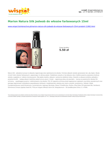 e-mail: [email protected] tel. : 17 77 00 557, 177707177 Marion Natura Silk Jedwab do włosów farbowanych 15ml www.wispol.tiointeractive.pl/marion-natura-silk-jedwab-do-wlosow-farbowanych-15ml-produkt-11062.html Cena brutto: 5.50 zł Natura Silk - jedwabna kuracja to odżywka regenerująca bez spłukiwania do włosów. Formuła odżywki została opracowana tak, aby lepiej i dłużej chronić kolor włosów farbowanych, zapewniając im zdrowy połysk. Dodatkowo zawarty w tej odżywce olej z kiełków pszenicy poprawia strukturę włosów, wygładza je i ułatwia rozczesywanie. Olej jojoba nawilża, odżywia i wzmacnia osłabione włosy. Zawarte w odzywce proteiny jedwabiu i prowitamina B5: - nadają włosom świetlisty połysk już po użyciu 1 kropli, - regenerują włosy od wewnątrz, - tworzą na powierzchni włosów filtr ochronny, - zapobiegają puszeniu i elektryzowaniu się włosów. Filtr UV zapewnia ochronę przed negatywnym wpływem czynników zewnętrznych oraz pomaga regenerować uszkodzenia spowodowane stylizacja i modelowaniem włosów przy użyciu suszarki, prostownicy i lokówki. Skład: Cyclopentasiloxane (and) Dimeticone, Cyclometicone, Isopropyl Myristate, Phenyl Trimethicone, Parfum, Ethyl Ester Of Hydrolized Silk, Panthenol, Simmonsia Chinesis (Jojoba) Seed Oil, Triticum Vulgare (Wheat) Germ Oil, Poliquaternium - 59 (and)Butylene Glicol, CI. 47000. *Ceny obowiązują wyłącznie przy składaniu zamówień przez sklep internetowy. Ceny w sklepach mogą nieznacznie różnić się od cen prezentowanych na stronach sklepu internetowego. Przedstawiona oferta w sklepie internetowym nie stanowi oferty w rozumieniu Kodeksu Cywilnego, i jest jedynie zaproszeniem do rozpoczęcia rokowań (zgodnie z art. 71 k.c.). Zastrzegamy sobie prawo do niezrealizowania zamówień z ważnych przyczyn ekonomicznych.