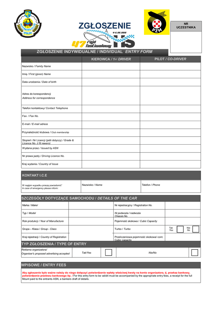 ZGŁOSZENIE NR UCZESTNIKA ZGŁOSZENIE INDYWIDUALNE / INDIVIDUAL ENTRY FORM PILOT / CO-DRIVER KIEROWCA / 1ST DRIVER Nazwisko / Family Name Imię / First (given) Name Data urodzenia / Date of birth Adres do korespondencji Address for correspondence Telefon kontaktowy/ Contact Telephone Fax / Fax No. E-mail / E-mail adress Przynależność klubowa / Club membership Stopień i Nr Licencji (jeśli dotyczy) / Grade & Licence No. (i fit rewers) Wydana przez / Issued by ASN Nr prawa jazdy / Driving Licence No. Kraj wydania / Country of Issue KONTAKT I.C.E W nagłym wypadku proszę powiadomić” In case of emergency please inform: Nazwisko / Name Telefon / Phone SZCZEGÓŁY DOTYCZĄCE SAMOCHODU / DETAILS OF THE CAR Marka / Make/ Nr rejestracyjny / Registration No. Typ / Model Nr podwozia / nadwozia Chassis No. Rok produkcji / Year of Manufacture Pojemność skokowa / Cubic Capacity Grupa – Klasa / Group - Class Turbo / Turbo Kraj rejestracji / Country of Registration Przeliczeniowa pojemność skokowa/ cont. Cubic capacity Tak Yes Nie No TYP ZGŁOSZENIA / TYPE OF ENTRY Reklama organizatora/ Organiser’s proposed advertising accepted Tak/Yes Nie/No WPISOWE / ENTRY FEES Aby zgłoszenie było ważne należy do niego dołączyć potwierdzenie wpłaty właściwej kwoty na konto organizatora, tj. przekaz bankowy, potwierdzenie przelewu bankowego itp. / For this entry form to be validit must be accompanied by the appropriate entry fees, a receipt for the full Mount paid to the entrants ASN, a bankers draft of details. WYSOKOŚĆ WPISOWEGO / HEIGHT ENTRY FEES I termin do dnia 21.05.2016r. 350,- II termin do dnia 30.05.2016r. 450,- ODBIÓR ADMINISTRACYJNY Proszę podać preferowaną godzinę Odbioru Administracyjnego. Przelew bankowy (obowiązkowo dowód nadania) Swift Bank Transfer (receipt compulsory) PKO BP oddział Opole 56 1020 3668 0000 5902 0009 6685 Czeki nie są akceptowane. Cheque is not accepted. OŚWIADCZENIE / DECLARATE Przez sam fakt podpisu na formularzu zgłoszeniowym uczestnik jak również wszyscy członkowie jego ekipy przyjmują tym samym bez zastrzeżeń Przepisy Regulaminu Kierowcy Roku Opolszczyzny i Regulaminu Uzupełniającego jak i wszystkich załączników i uzupełnień do imprezy KJS i uznają jako jedyne władze, które zostały ustalone przez PZM. Jednocześnie uczestnicy oświadczają, iż biorą udział w imprezie na własne ryzyko, przyjmują pełną odpowiedzialność za powstałe z ich winy szkody, a tym samym zrzekają się roszczeń w stosunku do organizatora. Pełni świadomi oświadczamy, iż nie istnieją żadne przeciwwskazania zdrowotne do naszego udziału w 47 Rajdzie Festiwalowym Higma Service, a wszelkie problemy mogące wystąpić z powodu uprawiania sportu samochodowego i spowodować szkodliwe konsekwencje zdrowotne są mi znane a tym samym zrzekamy się roszczeń w stosunku do organizatora. Kierowca oświadcza: - że posiada aktualne ubezpieczenie OC oraz że nie posiada licencji kierowcy w rozumieniu regulaminów sportowych PZM. Wyrażam zgodę na gromadzenie i przetwarzanie moich danych osobowych dla potrzeb imprezy, zgodnie z Ustawą z dnia 29.08.1997r. o ochronie danych osobowych. (Dz. U. Nr 133, poz. 883) Data i miejsce / Data & place Podpis Kierowcy / Signature of Driver Podpis Pilota / Signature of Co-driver