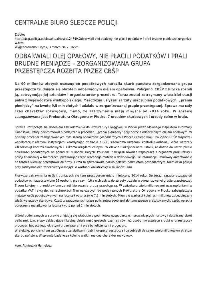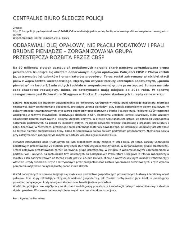 CENTRALNE BIURO ŚLEDCZE POLICJI Źródło: http://cbsp.policja.pl/cbs/aktualnosci/124749,Odbarwiali-olej-opalowy-nie-placili-podatkow-i-prali-brudne-pieniadze-zorganizo w.html Wygenerowano: Piątek, 3 marca 2017, 16:25 ODBARWIALI OLEJ OPAŁOWY, NIE PŁACILI PODATKÓW I PRALI BRUDNE PIENIĄDZE – ZORGANIZOWANA GRUPA PRZESTĘPCZA ROZBITA PRZEZ CBŚP Na 90 milionów złotych uszczupleń podatkowych naraziła skarb państwa zorganizowana grupa przestępcza trudniąca się obrotem odbarwionym olejem opałowym. Policjanci CBŚP z Płocka rozbili ją, zatrzymując jej członków i organizatorów procederu. Teraz został zatrzymany właściciel stacji paliw z województwa wielkopolskiego. Mężczyzna usłyszał zarzuty uszczupleń podatkowych, „prania pieniędzy” na kwotę 9,5 mln złotych i udziału w zorganizowanej grupie przestępczej. Sprawa ma cały czas charakter rozwojowy, mimo, że zatrzymania mają miejsce od 2014 roku. W sprawę zaangażowana jest Prokuratura Okręgowa w Płocku, 7 urzędów skarbowych i urzędy celne w kraju. Sprawa rozpoczęła się złożeniem zawiadomienia do Prokuratury Okręgowej w Płocku przez Głównego Inspektora Informacji Finansowej, który poinformował o podejrzeniu procederu „prania pieniędzy” przy obrocie odbarwionym olejem opałowym. W opisany proceder zaangażowanych było szereg podmiotów gospodarczych z Płocka i całego kraju. Policjanci CBŚP rozpoczęli współpracę z różnymi instytucjami koordynując działania z GIIF, siedmioma urzędami kontroli skarbowej, które wszczęły kilkadziesiąt kontroli skarbowych i kilkoma urzędami celnymi. W efekcie funkcjonariusze ustalili, że doszło do uszczuplenia należności podatkowych na ponad 90 milionów złotych. Policjanci nawiązali również współpracę z organami prokuratury i policji finansowej w Niemczech, przekazując część zebranego materiału dowodowego. Te informacje umożliwiły aresztowanie na terenie Niemiec przedstawicieli firmy. Firma ta sprzedawała paliwo polskim podmiotom gospodarczym. Niemiecka policja przy zatrzymaniach zabezpieczyła majątki o wartości kilkudziesięciu milionów Euro. Pierwsze zatrzymania osób trudniących się tym procederem miały miejsce w 2014 roku. Do teraz, zarzuty uszczupleń podatkowych przedstawiono 26 osobom, przy czym 16 z nich usłyszało zarzuty udziału w zorganizowanej grupie przestępczej. Trzem kolejnym przedstawiono zarzut kierowania grupą przestępczą. W związku z wielomilionowymi uszczupleniami w podatku VAT i akcyzie, na rachunkach firm należących do podejrzanych Prokuratura Okręgowa w Płocku zabezpieczyła majątek osób podejrzewanych na łączną kwotę prawie 7,5 mln złotych. Mienie o wartości kolejnych milionów zabezpieczyły właściwe urzędy skarbowe. Część z zatrzymanych przez policjantów osób zostało tymczasowo aresztowanych, część wpłaciła poręczenia majątkowe na łączną kwotę ponad 2 mln złotych. Wśród podejrzanych w sprawie znajdują się właściciele podmiotów gospodarczych prowadzących hurtowy i detaliczny obrót paliwami, tzw. słupy zakładające fikcyjną działalność gospodarczą, jak również osoby inwestujące środki w przestępczy proceder, będące jego ukrytymi organizatorami oraz beneficjentami procederu. W efekcie, policjanci we współpracy ze służbami rozbili grupę przestępczą i zapobiegli dalszym wielomilionowym stratom skarbu państwa. W sprawie badane są kolejne wątki i ma ona charakter rozwojowy. kom. Agnieszka Hamelusz Ocena: 4.5/5 (4) Tweetnij karuzela, zorganizowane grupy przestępcze