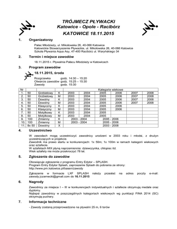 TRÓJMECZ P YWACKI Katowice - Opole - Racibórz KATOWICE 18.11.2015 1. Organizatorzy Pa ac M odzie y, ul. Miko owska 26, 40-066 Katowice Katowickie Stowarzyszenie P ywackie, ul. Miko owska 26, 40-066 Katowice Szko a P ywania Aqua Asy, 47-400 Racibórz ul. Wary skiego 34 2. Termin i miejsce zawodów 18.11.2015 r. P ywalnia Pa acu M odzie y w Katowicach 3. Program zawodów 18.11.2015, roda Rozgrzewka godz. 14:30 – 15:20 Otwarcie zawodów godz. 15:25 – 15:30 Zawody godz. 15:30 Nr 1. 2. 3. 4. 5. 6. 7. 8. 9. 10. 11. 4. 50 50 50 50 50 50 50 50 100 100 8x 50 Grzbietowy Grzbietowy Dowolny Dowolny Klasyczny Klasyczny Motylkowy Motylkowy Zmienny Zmienny Dowolny K M K M K M K M K M X 2003 2004 2003 2004 2003 2004 2003 2004 2003 2004 2003 2004 2003 2004 2003 2004 2003 - 2004 2003 - 2004 Kategorie wiekowe 2005 2006 2005 2006 2005 2006 2005 2006 2005 2006 2005 2006 2005 2005 2005 - 2006 2005 - 2006 2003 - 2008 2007 2007 2007 2007 2008 2008 2008 2008 Uczestnictwo W zawodach mog uczestniczy zawodnicy urodzeni w 2003 roku i m odsi, z dru yn uczestnicz cych w projekcie. Zawodnik ma prawo startu w konkurencjach: 1x 50m; 1x 100m w ramach kategorii wiekowych oraz sztafecie. W sztafetach MIX p yn naprzemiennie: dziewczynka, ch opiec itd. Wiek sztafety nie mo e przekroczy 78 lat. 5. Zg oszenie do zawodów Obowi zuje zg oszenie z programu Entry Edytor – SPLASH. Program Entry Edytor Splash, zaproszenie Splash do pobrania ze strony: http://www.pm.katowice.pl/basen/zawody Zg oszenie w formacie LXF SPLASH nale y [email protected] do 16.11.2015 6. przes na adres poczty e-mail: Nagrody Zawodnicy za miejsca I – III w konkurencjach indywidualnych i sztafecie otrzymuj medale oraz dyplomy. Najlepsi zawodnicy w poszczególnych kategoriach wiekowych wg punktacji FINA 2014 (SC) otrzymuj puchary. 7. Informacje techniczne - Zawody zostan przeprowadzone na p ywalni 25 m, 6 torów - Pomiar czasu pó automatyczny Colorado - Skre lenia zawodników: 3 godziny przed startem pod nr tel. 511523219 (basen) lub 511226685 (Jacek Czarnecki) 8. Zapisy do zawodów Zapisy do zawodów prowadz trenerzy poszczególnych dru yn. 9. O wiadczenie, stan zdrowia Jednocze nie z oddaniem zg osze , zaproszony klub, dru yna zapewnia, e zg oszeni do tych zawodów uczestnicy posiadaj wa ne badania lekarskie (karty zdrowia sportowca) lub wiadczenia prawnych opiekunów oraz stosowne ubezpieczenie. 10. Zasady finansowania Wszystkie koszty zwi zane z organizacj zawodów ponosz organizatorzy. (nagrody, op aty startowe, komunikaty, komisja s dziowska) 11. Komisja s dziowska Komisj s dziowsk powo uje organizator. 12. Sprawy ró ne Wr czanie medali oraz dyplomów: na bie co podczas zawodów, po zako czeniu danej konkurencji. Nagrodzenie najlepszych zawodników (6 dziewczynek, 6 ch opców) pucharami po zako czeniu zawodów. Wyniki z zawodów zostan opublikowane na stronie internetowej pracowni p ywania Wyniki poszczególnych konkurencji na bie co b wywieszane na 1 pi trze p ywalni Organizator nie ponosi odpowiedzialno ci za rzeczy zagubione, jak równie szkody i wypadki. 13. Kontakt i informacja Jacek Czarnecki; e-mail: [email protected], tel. +48511226685 Kadra trenerska pracowni p ywania tel. 511523219 Obs uga informatyczna zawodów: Jacek Czarnecki Kacper Strzelecki Organizatorzy -2-
