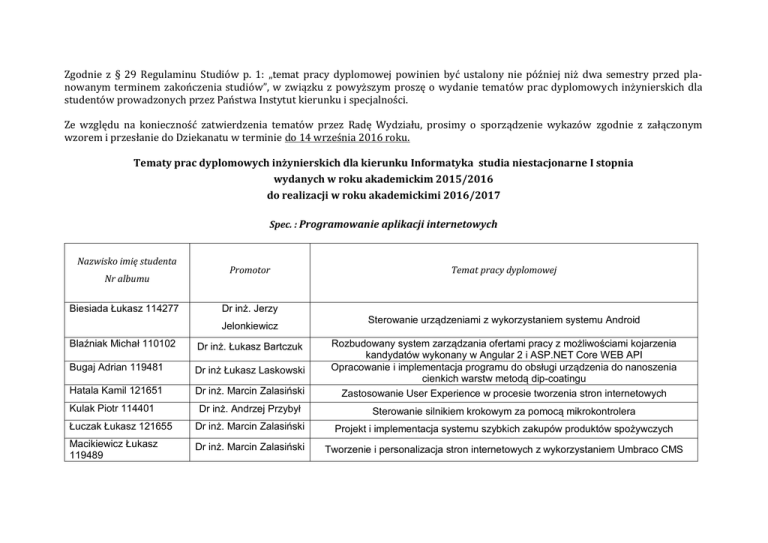Zgodnie z § 29 Regulaminu Studiów p. 1: „temat pracy dyplomowej powinien być ustalony nie później niż dwa semestry przed planowanym terminem zakończenia studiów”, w związku z powyższym proszę o wydanie tematów prac dyplomowych inżynierskich dla studentów prowadzonych przez Państwa Instytut kierunku i specjalności. Ze względu na konieczność zatwierdzenia tematów przez Radę Wydziału, prosimy o sporządzenie wykazów zgodnie z załączonym wzorem i przesłanie do Dziekanatu w terminie do 14 września 2016 roku. Tematy prac dyplomowych inżynierskich dla kierunku Informatyka studia niestacjonarne I stopnia wydanych w roku akademickim 2015/2016 do realizacji w roku akademickimi 2016/2017 Spec. : Programowanie aplikacji internetowych Nazwisko imię studenta Nr albumu Biesiada Łukasz 114277 Promotor Temat pracy dyplomowej Dr inż. Jerzy Jelonkiewicz Sterowanie urządzeniami z wykorzystaniem systemu Android Blaźniak Michał 110102 Dr inż. Łukasz Bartczuk Bugaj Adrian 119481 Dr inż Łukasz Laskowski Hatala Kamil 121651 Dr inż. Marcin Zalasiński Rozbudowany system zarządzania ofertami pracy z możliwościami kojarzenia kandydatów wykonany w Angular 2 i ASP.NET Core WEB API Opracowanie i implementacja programu do obsługi urządzenia do nanoszenia cienkich warstw metodą dip-coatingu Zastosowanie User Experience w procesie tworzenia stron internetowych Dr inż. Andrzej Przybył Sterowanie silnikiem krokowym za pomocą mikrokontrolera Łuczak Łukasz 121655 Dr inż. Marcin Zalasiński Projekt i implementacja systemu szybkich zakupów produktów spożywczych Macikiewicz Łukasz 119489 Dr inż. Marcin Zalasiński Tworzenie i personalizacja stron internetowych z wykorzystaniem Umbraco CMS Kulak Piotr 114401 Miernik Mateusz 119492 Dr inż. Marcin Zalasiński Musialik Dawid 120906 Dr inż. Marcin Zalasiński Nieszporek Katarzyna 116115 Dr hab. inż. Janusz Starczewski Olszówka Sylwester 111555 Pankowski Kamil 104139 Dr inż. Marcin Zalasiński Pawełczyk Łukasz 117699 Piotrowski Marcin 87840 Dr inż. Marcin Zalasiński Radek Błażej 113477 Renszmid Konrad 119349 Dr inż. Marcin Zalasiński Dr inż.Łukasz Laskowski Dr inż. Piotr Dziwiński Projekt i implementacja portalu internetowego oferującego usługi transportowe na lotnisko Projekt i implementacja systemu "My Little Home" do zarządzania domowymi zasobami Implementacja organizera finansowego z kalkulatorem płatności w C#.NET Projekt i implementacja systemu informatycznego umożliwiającego wymianę zbiorów kolekcjonerskich Projekt i implementacja platformy zakupowej artykułów biurowych z mechanizmem wspomagającym tworzenie ofert przetargowych Projekt i implementacja systemu informatycznego do zarządzania ewidencją biblioteczną Przygotowanie pakietu instalacyjnego dla programu do wizualizacji danych pomiarowych EPRDate Viewer Projekt i implementacja internetowego dzienniczka ucznia Dr inż. Tomasz Gałkowski Roszak Artur 113478 Dr inż. Krzysztof Rojek Stempkowski Marek Dr hab. inż. Adam Kulawik prof. P.Cz. Aplikacja internetowa do zdalnego monitorowania pracy maszyn CNC Opracowanie sieciowego systemu rezerwacji zasobów Implementacja i analiza algorytmów modelowania roślin Tetke Paweł 120915 Dr inż. Marcin Zalasiński Projekt i implementacja sklepu komputerowego z konfiguratorem sprzętowym Trajdos Wojciech 121652 Dr inż. Grzegorz Grodzki Opracowanie aplikacji typu BCM (Business Contact Manager) Warwas Piotr 97867 Dr inż. Krzysztof Rojek Opracowanie i implementacja kryptograficznych usług serwerowych Woźnica Emilian 88288 Dr inż. Janusz Bobulski Aplikacja internetowa do zarządzania zasobami biblioteki Wróbel Wojciech 120918 Dr inż. Marcin Zalasiński Projekt i implementacja serwisu turystyczno - społecznościowego "Wirtualny Wieluń"