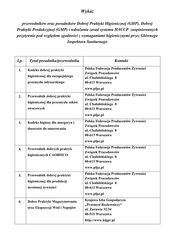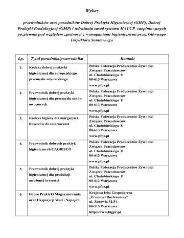 Wykaz przewodników oraz poradników Dobrej Praktyki Higienicznej (GHP), Dobrej Praktyki Produkcyjnej (GMP) i wdrażania zasad systemu HACCP zaopiniowanych pozytywnie pod względem zgodności z wymaganiami higienicznymi przez Głównego Inspektora Sanitarnego Lp. 1. Tytuł poradnika/przewodnika Kodeks dobrej praktyki higienicznej dla europejskiego przemysłu młynarskiego Kontakt Polska Federacja Producentów Żywności Związek Pracodawców ul. Chałubińskiego 8 00-613 Warszawa www.pfpz.pl 2. Przewodnik dobrej praktyki higienicznej dla przemysłu soków owocowych Polska Federacja Producentów Żywności Związek Pracodawców ul. Chałubińskiego 8 00-613 Warszawa www.pfpz.pl 3. Kodeks higieny dla margaryn i tłuszczów do smarowania Polska Federacja Producentów Żywności Związek Pracodawców ul. Chałubińskiego 8 00-613 Warszawa www.pfpz.pl 4. Przewodnik dobrych praktyk higienicznych CAOBISCO Polska Federacja Producentów Żywności Związek Pracodawców ul. Chałubińskiego 8 00-613 Warszawa www.pfpz.pl 5. Przewodnik dobrej praktyki higienicznej dla produkcji mrożonej żywności Polska Federacja Producentów Żywności Związek Pracodawców ul. Chałubińskiego 8 00-613 Warszawa www.pfpz.pl 6. Dobre Praktyki Magazynowania oraz Ekspozycji Wód i Napojów Krajowa Izba Gospodarcza „Przemysł Rozlewniczy“ ul. Żurawia 32/34 00-515 Warszawa http://www.kigpr.pl
