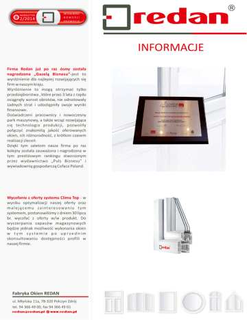 NEWSLETTER 2/2014 AKTUALNOŚCI NOWOŚCI PROMOCJE INFORMACJE Firma Redan już po raz ósmy została nagrodzona „Gazelą Biznesu”-jest to wyróżnienie dla najlepiej rozwijających się firm w naszym kraju. Wyróżnienie to mogą otrzymać tylko przedsiębiorstwa , które przez 3 lata z rzędu osiągnęły wzrost obrotów, nie odnotowały żadnych strat i udostępniły swoje wyniki finansowe. Doświadczeni pracownicy i nowoczesny park maszynowy, a także wciąż rozwijająca się technologia produkcji, pozwoliły połączyć znakomitą jakość oferowanych okien, ich różnorodność, z krótkim czasem realizacji zleceń. Dzięki tym zaletom nasza firma po raz kolejny została zauważona i nagrodzona w tym prestiżowym rankingu stworzonym przez wydawnictwo „Puls Biznesu” i wywiadownię gospodarczą Coface Poland. Wycofanie z oferty systemu Clima Top - w wyniku optymalizacji naszej oferty oraz m a l e j ą c e m u za i nte re s owa n i u t y m systemem, postanowiliśmy z dniem 30 lipca br. wycofać z oferty w/w produkt. Do wyczerpania zapasów magazynowych będzie jednak możliwość wykonania okien w tym systemie po uprzednim skonsultowaniu dostępności profili w naszej firmie. Fabryka Okien REDAN ul. Młyńska 11a, 78-320 Połczyn Zdrój tel. 94 366 49 00, fax 94 366 49 01 NEWSLETTER 2/2014 AKTUALNOŚCI NOWOŚCI PROMOCJE AKTUALNE PROMOCJE !!! Promocja systemów uchylno-przesuwnych - pragniemy przypomnieć, że wciąż obowiązuje nasza promocja na systemy uchylno przesuwne, które są nowoczesnym i niezwykle funkcjonalnym rozwiązaniem wyjścia na taras, czy balkon. Promocja dotyczy systemów przesuwnych SKB-S, SKB-SE, SKB - Z. Nowe ceny w aktualnej ofercie firmy REDAN obowiązują do odwołania. Letnia promocja REDAN RELAZZO Rozpoczynamy wakacje i czas urlopów, a najlepszym miejscem na letni wypoczynek , napicie się porannej kawy, czy opalanie się w słoneczne dni jest właśnie taras. Przygotowaliśmy promocję na deskę tarasową RELAZZO CLASSIC, dzięki czemu czas spędzony na tarasie będzie jeszcze przyjemniejszy. Fabryka Okien REDAN ul. Młyńska 11a, 78-320 Połczyn Zdrój tel. 94 366 49 00, fax 94 366 49 01 NEWSLETTER 2/2014 AKTUALNOŚCI NOWOŚCI PROMOCJE Ciepłe parapety w ofercie firmy REDAN- Do naszej oferty wprowadzamy ciepłe parapety w postaci listew i profili podokiennych z twardego styropianu EPS 035 i polistyrenu ekstrudowanego XPS oraz wkłady ociepleniowe do profili ze styropianu grafitowego EPS 032. W ofercie znajdą Państwo: -ciepły parapet PRO2T i PRO2XT- podstawowy najczęściej stosowany profil, montowany w przypadku parapetów wewnętrznych o grubościach do 32 mm. -PRO1T,PRO1XT,PROOT,PROOXT- stosowany w przypadku parapetów o nietypowych grubościach lub okien bez parapetów wewnętrznych, można stosować pod drzwi. -profil balkonowy PRO1XT - stosowany do drzwi balkonowych różnego typu. - podstawka LO2XT - ciepła listwa która jest tania i efektywna. Nowe okucia naszych okien - Maco Multi Trend zastępujemy nowszymi okuciami Maco Multi Matic KS, poniżej najważniejsze cechy nowych okuć: - ambitny design, - opcjonalnie system ryglowania i.S. Czopy zaawansowane technologicznie zapewniające lekkie funkcjonowanie i bezpieczeństwo, - zawiasy widoczne, częściowo widoczne, w pełni niewidoczne oraz do wagi 180 kg, -możliwość zastosowania podnośnika skrzydła z bezstopniową regulacją, - równomierna powłoka silber-look, -liniowe zagłębienie na zasuwnicach tworzące elegancką i smukłą linię, -zaokrąglone krawędzie zaczepów nadające okuciom łagodny kształt. Fabryka Okien REDAN ul. Młyńska 11a, 78-320 Połczyn Zdrój tel. 94 366 49 00, fax 94 366 49 01 OFERTA NEWSLETTER 2/2014 AKTUALNOŚCI NOWOŚCI PROMOCJE Nowa ława podparapetowa w produktach klasy „Premium” - podstawową zaletą nowej ławy podparapetowej, którą będziemy montować w produktach klasy „Premium” jest uszczelka, która jeszcze dokladniej zabezpiecza połączenie ławy z oknem. Kolejnym bardzo istotnym elementem jest budowa ławy pozwalająca dowolnie rozbudowywać ją o kolejne listwy, a tym samym kontrolować samemu grubość ławy podparapetowej. REALIZACJE Aktualne realizacje - firma REDAN prowadzi obecnie dostawę i montaż okien na kilku inwestycjach. Realizacje prowadzone są w różnych regionach Polski. W Krynicy Morskiej zakończyliśmy montaż stolarki okiennej PVC w systemie 6 komorowym w dwóch ośrodkach wypoczynkowych. W Szczecinie dobiegły końca prace montażowe stolarki okiennej o zwiększonej izolacyjności akustycznej na osiedlu Ku Słońcu. W Świnoujściu prowadzimy wyjątkową realizację zabudowy 125 balkonów na 11 piętrowym wieżowcu. Budynek zostaje poddany termomodernizacji, a wszystkie balkony zostaną wyposażone w lekką aluminiowoszklaną zabudowę ze skrzydłami przesuwnymi. Konstrukcje zabudowy spełniają wszystkie wymagania norm budowlanych dla stolarki montowanej w danej strefie klimatycznej z uwzględnieniem kondygnacji na której są montowane. Fabryka Okien REDAN ul. Młyńska 11a, 78-320 Połczyn Zdrój tel. 94 366 49 00, fax 94 366 49 01