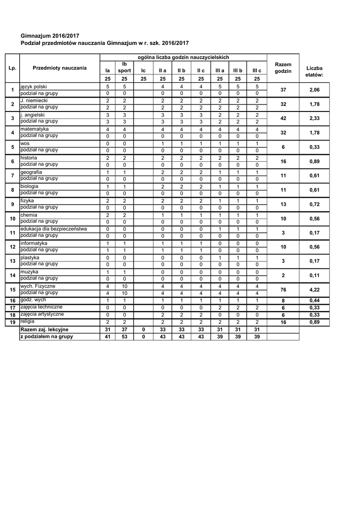 Gimnazjum 2016/2017 Podział przedmiotów nauczania Gimnazjum w r. szk. 2016/2017 ogólna liczba godzin nauczycielskich Lp. 1 2 Przedmioty nauczania język polski podział na grupy J. niemiecki podział na grupy 3 j. angielski podział na grupy 4 matematyka podział na grupy 5 wos podział na grupy 6 historia podział na grupy 7 geografia podział na grupy 8 biologia podział na grupy 9 fizyka podział na grupy chemia podział na grupy edukacja dla bezpieczeństwa 11 podział na grupy 10 informatyka 12 podział na grupy 13 plastyka podział na grupy muzyka 14 podział na grupy wych. Fizyczne 15 podział na grupy 16 godz. wych 17 zajęcia techniczne 18 zajęcia artystyczne 19 religia Razem zaj. lekcyjne z podziałem na grupy Ia Ib sport 25 5 0 2 2 3 3 4 0 0 0 2 0 1 0 1 0 2 0 2 0 0 0 1 1 0 0 1 0 4 4 1 0 0 2 31 41 25 5 0 2 2 3 3 4 0 0 0 2 0 1 0 1 0 2 0 2 0 0 0 1 1 0 0 1 0 10 10 1 0 0 2 37 53 Ic II a II b II c III a III b III c 25 25 4 0 2 2 3 3 4 0 1 0 2 0 2 0 2 0 2 0 1 0 0 0 1 1 0 0 0 0 4 4 1 0 2 2 33 43 25 4 0 2 2 3 3 4 0 1 0 2 0 2 0 2 0 2 0 1 0 0 0 1 1 0 0 0 0 4 4 1 0 2 2 33 43 25 4 0 2 2 3 3 4 0 1 0 2 0 2 0 2 0 2 0 1 0 0 0 1 1 0 0 0 0 4 4 1 0 2 2 33 43 25 5 0 2 2 2 2 4 0 1 0 2 0 1 0 1 0 1 0 1 0 1 0 0 0 1 0 0 0 4 4 1 2 0 2 31 39 25 5 0 2 2 2 2 4 0 1 0 2 0 1 0 1 0 1 0 1 0 1 0 0 0 1 0 0 0 4 4 1 2 0 2 31 39 25 5 0 2 2 2 2 4 0 1 0 2 0 1 0 1 0 1 0 1 0 1 0 0 0 1 0 0 0 4 4 1 2 0 2 31 39 0 0 Razem godzin Liczba etatów: 37 2,06 32 1,78 42 2,33 32 1,78 6 0,33 16 0,89 11 0,61 11 0,61 13 0,72 10 0,56 3 0,17 10 0,56 3 0,17 2 0,11 76 4,22 8 6 6 16 0,44 0,33 0,33 0,89