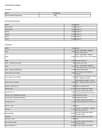 Cennik firmy Scheu Akcesoria Model Docisk zabezpieczający płytę Cena Uwagi 430 Akcesoria gramofonowe Model Cena Uwagi Classic MK II 2.600 długość 10 Classic MK II 2.840 długość 12 Cantus 3.850 długość 9 Cantus 4.300 długość 12 Tacco 10.120 długość 9 Tacco 11.880 długość 12 Gramofony Model Cena Uwagi Cello 5.950 Cello Cello + ramię R202 + wkładka 6.300 Ortofon Super OM 10, kolor niebieski Cello 4.750 cena bez ramienia Cello - podstawa pod ramię Cello + ramię R202 + wkładka Ortofon Super OM 10 150 podstawa pod ramię Cello + ramię R202 + wkładka Ortofon Super OM 10, kolor czarny Cello 6.150 Cello - pokrywa antykurzowa 1.160 pokrywa antykurzowa Cello Classic Line Timbre 9.800 Cello Classic Line Timbre bez ramienia Cello Classic Line Evolution 7.150 Cello Classic Line Evolution + ramię R202 + wkładka AT100E Cello Classic Line Basic Cello Classic Line Basic + ramię 5.490 R202 + wkładka Ortofon Super OM 10 Premier - talerz 80 mm 1.290 dopłata za talerz 80 mm Premier mk3 Premier mk2 / 9 12.100 cena bez ramienia, bez silnika 8.580 cena bez ramienia, bez silnika, wersja przystosowana do ramion 9" Premier mk2 - podstawa pod ramię 350 podstawa pod ramię Premier mk3 - podstawa pod ramię 860 podstawa pod ramię Premier mk2 /12 cena bez ramienia, bez silnika, 8.750 wersja przystosowana do ramion 12" Premier - silnik 2.180 silnik Diamond 13.160 Diamond + ramię R202 + wkładka Benz Micro MC Silver Diamond Slate 16.500 cena bez ramienia, bez silnika, granitowy korpus Diamond 10.980 cena bez ramienia, bez silnika Diamond - silnik 2.180 silnik cena bez ramienia, bez silnika, granitowy korpus Das Laufwerk Slate 35.860 Das Laufwerk No. 2 25.050 cena bez ramienia, bez silnika Das Laufwerk Slate - podstawa pod ramię 1.140 podstawa pod ramię Das Laufwerk No. 2 - podstawa pod ramię 430 podstawa pod ramię Das Laufwerk - silnik 4.620 silnik Wkładki gramofonowe Model Cena Uwagi MC Scheu SL 3.480 wkładka gramofonowa z ruchomą cewką MC Scheu Kupfer L 4.360 wkładka gramofonowa z ruchomą cewką MC Scheu Ruby 3 8.470 wkładka gramofonowa z ruchomą cewką