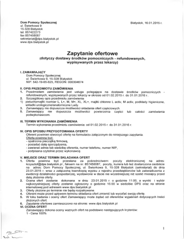 Dom Pomocy Społecznej ul. Świerkowa 9 15-328 Białystok tel. 857422273 fax 857458087 sekretariat@dps. bialystok. pl www.dps.bialystok.pl Białystok, 16.01.2015 r. Zapytanie ofertowe (dotyczy dostawy środków pomocniczych - refundowanych, wypisywanych przez lekarzy) I. ZAMAWIAJĄCY Dom Pomocy Społecznej ul. Świerkowa 9, 15-328 Białystok NIP: 542-19-65-625, REGON: 000304674 II. OPIS PRZEDMIOTU ZAMÓWIENIA 1. Przedmiotem zamówienia jest usługa polegająca na dostawie środków pomocniczych refundowanych, wypisywanych przez lekarzy w okresie od 01.02.2015 r. do 31.01.2016 r.. 2. Szczegółowy opis przedmiotu zamówienia: 1) pieluchomajtki rozmiar L, L+, M, M+, XL, XL+, majtki chłonne L activ, M activ, podkłady higieniczne, wkładki urologiczne/anatomiczne Lady. 3. Zamawiający nie dopuszcza możliwości składania ofert częściowych. 5. Zamawiający nie dopuszcza możliwości powierzenia części lub całości zamówienia podwykonawcom. III. TERMIN WYKONANIA ZAMÓWIENIA Termin wykonania przedmiotu zamówienia: od 01.02.2015 r. do 31.01.2016 r. IV. OPIS SPOSBU PRZYGOTOWANIA OFERTY Oferent powinien stworzyć ofertę na formularzu załączonym do niniejszego zapytania. Oferta powinna bvć: - opatrzona pieczątką firmową, - posiadać datę sporządzenia, - zawierać adres lub siedzibę oferenta, numer telefonu, numer NIP, - podpisana czytelnie przez wykonawcę. V. MIEJSCE ORAZ TERMIN SKŁADANIA OFERT 1. Oferta powinna być przesłana za pośrednictwem: poczty elektronicznej na adres: [email protected], faksem na nr: 857458087, poczty, kuriera lub też dostarczona osobiście na adres: Dom Pomocy Społecznej, ul. Świerkowa 9, 15-328 Białystok (sekretariat) do dnia 23.01.2015 r. wraz z załączoną kserokopią wypisu z rejestru przedsiębiorców lub zaświadczenia z ewidencji działalności gospodarczej, wystawione w dacie nie wcześniejszej niż sześć miesięcy przed datą złożenia oferty. 2. Ocena ofert zostanie dokonana w dniu 23.01.2015 r. o godzinie 11:00, a wyniki i wybór najkorzystniejszej oferty zostanie ogłoszony o godzinie 15:00 w siedzibie DPS oraz na stronie internetowej pod adresem www.dps.bialystok.pl 3. Oferty złożone po terminie nie będą rozpatrywane. 4 . Oferent może przed upływem terminu składania ofert zmienić lub wycofać swoją ofertę. 5. W toku badania i oceny ofert Zamawiający może żądać od oferentów wyjaśnień dotyczących treści złożonych ofert. 6. Zapytanie ofertowe zamieszczono na stronie: www.dps.bialystok.pl VI. OCENA OFERT Zamawiający dokona oceny ważnych ofert na podstawie następujących kryteriów: 1 - Cena 100% 1 — VII. INFORMACJE DOTYCZĄCE WYBORU NAJKORZYSTNIEJSZEJ OFERTY O wyborze najkorzystniejszej oferty Zamawiający zawiadomi oferentów za pośrednictwem strony internetowej znajdującej się pod adresem www.dps.bialystok.pl VIII. DODATKOWE INFORMACJE Dodatkowych informacji udziela Krzysztof Kisło pod numerem telefonu 857458071 oraz adresem email: [email protected] IX. ZAŁĄCZNIKI Wzór formularza ofertowego. DYREKTOR DOMU POMOCY SPOŁECZNEJ 2 Zapytanie o cenę data.-dk^:.^.!.?.. Lp Cena brutto Liczba wniosków ( 1 wniosek 60 szt) po 60szt za rok 2014 Nazwa produktu 1. Pieluchomajtki rozm. M 2. Pieluchomajtki rozm. M + 3. Majtki chłonne rozm. M activ 4. Pieluchomajtki rozm. L 5. Pieluchomajtki L+ 12 6. Majtki chłonne rozm. L activ 69 7. Pieluchomajtki rozm.XL 27 8. Pieluchomajtki rozm.XL+ 9. Podkłady higieniczne 10. Wkładki urologiczne/anatomiczne Lady 205 3 50 477 -f 14 12 11 12 13 .. ri RAZEM dopłata DPS KIEROW NIK DZIALI Anna I Dopłata Refundacja DPS do NFZ (do 1 wniosku - wniosku 60szt) ( powyżej refundacji NFZ) Dopłata DPS (do wysokości limitu ceny) roczna Dopłata do 1 wniosku mieszkańc a DPS (powyżej limitu ceny)