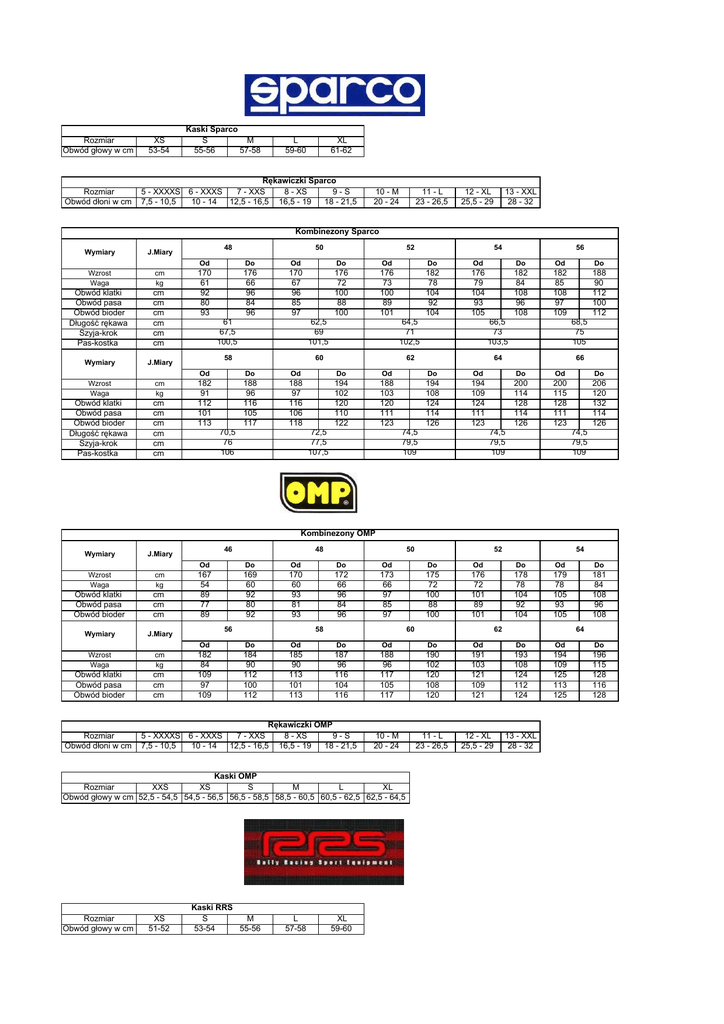 Rozmiar Obwód głowy w cm Rozmiar Obwód dłoni w cm XS 53-54 Kaski Sparco S M 55-56 57-58 L 59-60 XL 61-62 Rękawiczki Sparco 5 - XXXXS 6 - XXXS 7 - XXS 8 - XS 9-S 7,5 - 10,5 10 - 14 12,5 - 16,5 16,5 - 19 18 - 21,5 10 - M 20 - 24 11 - L 23 - 26,5 12 - XL 25,5 - 29 13 - XXL 28 - 32 Kombinezony Sparco Wymiary 48 J.Miary Wzrost Waga cm kg Obwód klatki Obwód pasa Obwód bioder Długość rękawa Szyja-krok Pas-kostka cm cm cm cm cm cm Wymiary J.Miary Wzrost Waga cm kg Obwód klatki Obwód pasa Obwód bioder Długość rękawa Szyja-krok Pas-kostka cm cm cm cm cm cm 50 52 54 56 Od Do Od Do Od Do Od Do Od Do 170 61 92 80 93 176 66 96 84 96 170 67 96 85 97 176 72 100 88 100 176 73 100 89 101 182 78 104 92 104 176 79 104 93 105 182 84 108 96 108 182 85 108 97 109 188 90 112 100 112 61 67,5 100,5 62,5 69 101,5 58 64,5 71 102,5 60 66,5 73 103,5 62 68,5 75 105 64 66 Od Do Od Do Od Do Od Do Od Do 182 91 112 101 113 188 96 116 105 117 188 97 116 106 118 194 102 120 110 122 188 103 120 111 123 194 108 124 114 126 194 109 124 111 123 200 114 128 114 126 200 115 128 111 123 206 120 132 114 126 70,5 76 106 72,5 77,5 107,5 74,5 79,5 109 74,5 79,5 109 74,5 79,5 109 Kombinezony OMP Wymiary J.Miary Wzrost Waga cm kg Obwód klatki Obwód pasa Obwód bioder cm cm cm Wymiary J.Miary Wzrost Waga cm kg Obwód klatki Obwód pasa Obwód bioder cm cm cm Rozmiar Obwód dłoni w cm 46 48 50 Od Do Od Do Od Do Od Do 167 54 89 77 89 169 60 92 80 92 170 60 93 81 93 172 66 96 84 96 173 66 97 85 97 175 72 100 88 100 176 72 101 89 101 178 78 104 92 104 179 78 105 93 105 181 84 108 96 108 56 58 60 62 64 Od Do Od Do Od Do Od Do Od Do 182 84 109 97 109 184 90 112 100 112 185 90 113 101 113 187 96 116 104 116 188 96 117 105 117 190 102 120 108 120 191 103 121 109 121 193 108 124 112 124 194 109 125 113 125 196 115 128 116 128 10 - M 20 - 24 11 - L 23 - 26,5 12 - XL 25,5 - 29 13 - XXL 28 - 32 Rękawiczki OMP 5 - XXXXS 6 - XXXS 7 - XXS 8 - XS 9-S 7,5 - 10,5 10 - 14 12,5 - 16,5 16,5 - 19 18 - 21,5 XS 51-52 54 Do Kaski OMP Rozmiar XXS XS S M L XL Obwód głowy w cm 52,5 - 54,5 54,5 - 56,5 56,5 - 58,5 58,5 - 60,5 60,5 - 62,5 62,5 - 64,5 Rozmiar Obwód głowy w cm 52 Od Kaski RRS S M 53-54 55-56 L 57-58 XL 59-60