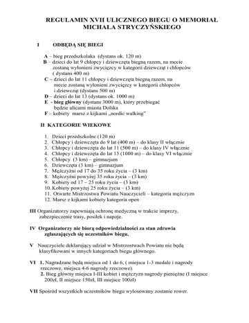 REGULAMIN XVII ULICZNEGO BIEGU O MEMORIAŁ MICHAŁA STRYCZYŃSKIEGO I ODBĘDĄ SIĘ BIEGI A – bieg przedszkolaka (dystans ok. 120 m) B – dzieci do lat 9 chłopcy i dziewczęta biegną razem, na mecie zostaną wyłonieni zwycięzcy w kategorii dziewcząt i chłopców ( dystans 400 m) C – dzieci do lat 11 chłopcy i dziewczęta biegną razem, na mecie zostaną wyłonieni zwycięzcy w kategorii chłopców i dziewcząt (dystans 500 m) D – dzieci do lat 13 (dystans ok. 1000 m) E - bieg główny (dystans 3000 m), który przebiegać będzie ulicami miasta Dolska F – kobiety marsz z kijkami „nordic walking” II KATEGORIE WIEKOWE 1. Dzieci przedszkolne (120 m) 2. Chłopcy i dziewczęta do 9 lat (400 m) – do klasy II włącznie 3. Chłopcy i dziewczęta do lat 11 (500 m) – do klasy IV włącznie 4. Chłopcy i dziewczęta do lat 13 (1000 m) – do klasy VI włącznie 5. Chłopcy (3 km) – gimnazjum 6. Dziewczęta (3 km) – gimnazjum 7. MęŜczyźni od 17 do 35 roku Ŝycia – (3 km) 8. MęŜczyźni powyŜej 35 roku Ŝycia – (3 km) 9. Kobiety od 17 – 25 roku Ŝycia – (3 km) 10. Kobiety powyŜej 25 roku Ŝycia – (3 km) 11. Otwarte Mistrzostwa Powiatu Nauczycieli – kategoria męŜczyzn 12. Marsz z kijkami kobiety kategoria open III Organizatorzy zapewniają ochronę medyczną w trakcie imprezy, zabezpieczenie trasy, posiłek i napoje. IV Organizatorzy nie biorą odpowiedzialności za stan zdrowia zgłaszających się uczestników biegu. V Nauczyciele deklarujący udział w Mistrzostwach Powiatu nie będą klasyfikowani w innych kategoriach biegu głównego. VI 1. Nagradzane będą miejsca od 1 do 6, ( miejsca 1-3 medale i nagrody rzeczowe, miejsca 4-6 nagrody rzeczowe). 2. Bieg główny miejsca I-III kobiet i męŜczyzn nagrody pienięŜne (I miejsce 200zł, II miejsce 150zł, III miejsce 100zł) VII Spośród wszystkich uczestników biegu wylosowany zostanie rower.