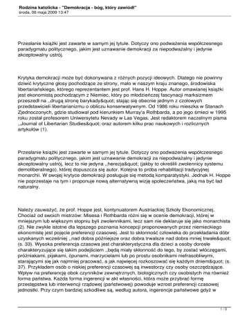 Rodzina katolicka - "Demokracja - bóg, który zawiódł" środa, 06 maja 2009 13:47 Przesłanie książki jest zawarte w samym jej tytule. Dotyczy ono podważenia współczesnego paradygmatu politycznego, jakim jest uznawanie demokracji za niepodważalny i jedynie akceptowalny ustrój. Krytyka demokracji może być dokonywana z różnych pozycji ideowych. Dlatego nie powinny dziwić krytyczne głosy pochodzące ze strony, mało w naszym kraju znanego, środowiska libertariańskiego, którego reprezentantem jest prof. Hans H. Hoppe. Autor omawianej książki jest ekonomistą pochodzącym z Niemiec, który po młodzieńczej fascynacji marksizmem przeszedł na ,,drugą stronę barykady" stając się obecnie jednym z czołowych przedstawicieli libertarianizmu o obliczu konserwatywnym. Od 1986 roku mieszka w Stanach Zjednoczonych, gdzie studiował pod kierunkiem Murray'a Rothbarda, a po jego śmieci w 1995 roku został profesorem Uniwersytetu Nevady w Las Vegas. Jest redaktorem naczelnym pisma ,,Journal of Libertarian Studies" oraz autorem kilku prac naukowych i rozlicznych artykułów (1). Przesłanie książki jest zawarte w samym jej tytule. Dotyczy ono podważenia współczesnego paradygmatu politycznego, jakim jest uznawanie demokracji za niepodważalny i jedynie akceptowalny ustrój, lecz to nie jedyna ,,herezja" (jakby to określili zwolennicy systemu demoliberalnego), której dopuszcza się autor. Kolejna to próba rehabilitacji tradycyjnej monarchii. W swojej krytyce demokracji posługuje się metodą komparatystyki. Jednak H. Hoppe nie poprzestaje na tym i proponuje nową alternatywną wizję społeczeństwa, jaką ma być ład naturalny. Należy zauważyć, że prof. Hoppe jest, kontynuatorem Austriackiej Szkoły Ekonomicznej. Chociaż od swoich mistrzów: Misesa i Rothbarda różni się w ocenie demokracji, której w mniejszym lub większym stopniu byli zwolennikami, lecz sam nie deklaruje się jako monarchista (2). Nie zwykle istotne dla lepszego poznania koncepcji proponowanych przez niemieckiego ekonomistę jest pojęcie preferencji czasowej. Jest to skłonność człowieka do przekładania dóbr uzyskanych wcześniej ,,nad dobra późniejsze oraz dobra trwalsze nad dobra mniej trwałe" (s. 33). Wysoka preferencja czasowa jest charakterystyczna dla dzieci a osoby dorosłe charakteryzujące się takim podejściem ,,będą miały skłonność do tego, by zostać włóczęgami, próżniakami, pijakami, ćpunami, marzycielami lub po prostu osobnikami niefrasobliwymi, starającymi się jak najmniej pracować, a jak najwięcej rozkoszować się każdym dniem" (s. 37). Przykładem osób o niskiej preferencji czasowej są inwestorzy czy osoby oszczędzające. Wpływ na preferencję obok czynników zewnętrznych, biologicznych czy osobistych ma również forma państwa. Każda forma ingerencji w akt własności, która może przybrać formę przestępstwa lub interwencji rządowej (państwowej) powoduje wzrost preferencji czasowej jednostki. Przy czym bardziej szkodliwe są, według autora, ingerencje państwowe gdyż w 1/5 Rodzina katolicka - "Demokracja - bóg, który zawiódł" środa, 06 maja 2009 13:47 odróżnieniu od aktów gwałtu na własności prywatnej dokonywanych przez przestępców mają one charakter permanentny oraz posiadają status ,,legalności" (3). Oba typy naruszeń własności powodują zmniejszenie posiadanych przez ofiarę zasobów oraz alokację środków na cele, które przed dokonaniem przestępstwa uchodziłyby za marnotrawstwo np. przeznaczanie pieniędzy na wzmocnienie poczucia bezpieczeństwa. Autor uważa, że państwo zostało utworzone w wyniku zgody społecznej poprzez przekazanie elicie przez społeczeństwo uprawnienia do stworzenia struktury państwowej, czyli wedle określenia prof. H. Hoppego, legalnego monopolu terytorialnego. Pierwotnie państwo przybierało formę monarchiczną, która jest określana mianem prywatnej własności rządowego aparatu przymusu. Prywatny rząd (monarchia) wyróżnia się od publicznego głównie tym, ,,że konfiskowane zasoby i przywilej monopolu na przyszłą konfiskatę stanowią indywidualną własność. Konfiskowane zasoby są dodawane do prywatnego majątku władcy i traktowane tak, jakby były jego częścią, a przywilej monopolu na przyszłą konfiskatę jest przypisany do tego majątku jako tytuł , co natychmiast podnosi jego teraźniejszą wartość (...). Najważniejsze jest to, że jako prywatny właściciel rządowego majątku władca ma prawo przekazania swojego majątku spadkobiercy. Może sprzedać, wynająć lub oddać część albo całość majątku, do którego przypisany jest przywilej (i zachować zapłatę za sprzedane lub wynajęte dobra); może osobiście mianować i odwoływać zarządców i pracowników zatrudnionych w jego majątku" (s. 54). Monarcha traktując podległe sobie terytorium jako własność dąży do pomnażania majątku, co owocuje jego umiarem. Cechą szczególną monarchii jest również wytworzenie się wśród rządzonych poczucia solidarności ,,klasowej", która wytwarza się poprzez brak możliwości awansu do grupy rządzącej (którą tworzą na ogół monarcha wraz z najbliższą rodziną). W ten sposób rodzi się między nimi poczucie bycia ofiarą naruszania prawa własności przez rząd, dlatego też rośnie wśród nich opór i sprzeciw wobec wszelkich form ucisku fiskalnego. Niemalże dokładnym przeciwieństwem tej formy państwa jest demokracja, która cechuje się brakiem umiaru zarówno w polityce wewnętrznej jak i zewnętrznej (to systemy demokratyczne, zdaniem H. Hoppego, przyniosły zjawisko wojen totalnych niespotykanych w okresie chociażby średniowiecza). Ponadto pogłębia ona procesy decywilzacyjne, dążąc do powiększania swojej władzy nad obywatelami. Przykładem wysokiej preferencji czasowej rządów publicznych jest rosnące zadłużenie państwa, które ma miejsce zarówno w okresach wojny jak i pokoju, podczas gdy w okresie monarc