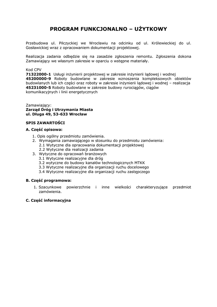 PROGRAM FUNKCJONALNO – UŻYTKOWY Przebudowa ul. Pilczyckiej we Wrocławiu na odcinku od ul. Królewieckiej do ul. Gosławickiej wraz z opracowaniem dokumentacji projektowej. Realizacja zadania odbędzie się na zasadzie zgłoszenia remontu. Zgłoszenia dokona Zamawiający we własnym zakresie w oparciu o wstępne materiały. Kod CPV 71322000-1 Usługi inżynierii projektowej w zakresie inżynierii lądowej i wodnej 45200000-9 Roboty budowlane w zakresie wznoszenia kompleksowych obiektów budowlanych lub ich części oraz roboty w zakresie inżynierii lądowej i wodnej – realizacja 45231000-5 Roboty budowlane w zakresie budowy rurociągów, ciągów komunikacyjnych i linii energetycznych Zamawiający: Zarząd Dróg i Utrzymania Miasta ul. Długa 49, 53-633 Wrocław SPIS ZAWARTOŚCI A. Część opisowa: 1. Opis ogólny przedmiotu zamówienia. 2. Wymagania zamawiającego w stosunku do przedmiotu zamówienia: 2.1 Wytyczne dla opracowania dokumentacji projektowej 2.2 Wytyczne dla realizacji zadania 3. Wytyczne do opracowań branżowych 3.1 Wytyczne realizacyjne dla dróg 3.2 wytyczne do budowy kanałów technologicznych MTKK 3.3 Wytyczne realizacyjne dla organizacji ruchu docelowego 3.4 Wytyczne realizacyjne dla organizacji ruchu zastępczego B. Część programowa: 1. Szacunkowe zamówienia. powierzchnie C. Część informacyjna i inne wielkości charakteryzujące przedmiot A. Część opisowa 1. Opis ogólny przedmiotu zamówienia Przedmiotem zamówienia jest opracowanie dokumentacji projektowej wraz z realizacją: Przebudowa ul. Pilczyckiej we Wrocławiu na odcinku od ul. Królewieckiej do ul. Gosławickiej Przedmiot zamówienia przewidziany do realizacji w systemie „zaprojektuj i zbuduj” składa się z dwóch części: opracowanie dokumentacji projektowej realizacja robót budowlanych 2. Wymagania w stosunku do przedmiotu zamówienia 2.1 Wymagania w stosunku do dokumentacji: Dokumentacja projektowa, na podstawie której będą realizowane roboty budowlane winna składać się z następujących opracowań i projektów : Część drogowa wraz z rozbiórką i odbudową nawierzchni po robotach MTKK Kanały technologiczne MTKK Organizacja ruchu zastępczego Organizacja ruchu docelowego Zabezpieczenie poziomej osnowy geodezyjnej Uzupełniające pomiary geodezyjne Specyfikacje techniczne wykonania i odbioru robót 2.2 Wymagania w stosunku do realizacji zadania : Realizacja zadania winna obejmować poprawę stanu technicznego nawierzchni jezdni poprzez rozbiórkę i wykonanie nawierzchni z betonu asfaltowego, ułożenie nawierzchni chodnika z kostki betonowej oraz plantowanie poboczy z obsianiem trawą. Zadanie obejmuje również budowę kanalizacji kablowej MTKK na długości od skrzyżowania z ul. Gosławicką do istniejącej studni MTKK na rondzie ul Pilczyckiej/Królewieckiej w poboczu gruntowym. 3. Wytyczne dla opracowań branżowych 3.1 Wytyczne dotyczące robót drogowych - Roboty rozbiórkowe rozebranie nawierzchni z betonu asfaltowego o średniej grubości 6 cm wraz z załadunkiem, wywozem, utylizacją rozbiórka kostki betonowej grubości 8 cm wraz z załadunkiem wywozem i utylizacją rozbiórka płytek betonowych 50x50x7 wraz z załadunkiem wywozem i utylizacją rozbiórka obrzeża betonowego 6x30 wraz z załadunkiem wywozem i utylizacją rozbiórka opornika kamiennego 12x30 – (część do ponownego wbudowania) wraz z załadunkiem, wywozem, utylizacją rozbiórka nawierzchni z kostki kamiennej 18/20 – odzysk 70% ( wywóz na magazyn ZDiUM), pozostałą część - wywóz na wraz z utylizacją roboty ziemne wraz z rozbiórką podbudowy z kruszywa pod wjazdami i chodnikami - wjazdy – podbudowa gr 18 cm - chodniki – podbudowa gr. 10 cm; korytowanie gr. 16 cm - Nawierzchnia jezdni ul. Pilczyckiej wykonanie nawierzchni jezdni o konstrukcji: - warstwa ścieralna AC 11 S grubości – 5 cm - warstwa wyrównawcza na pow. 30% remontowanej nawierzchni z AC 11 o średniej grubości 3 cm skropienie lepiszczem przed ułożeniem warstw asfaltowych dla zapewnienia odpowiedniego połączenia międzywarstwowego ułożenie opornika kamiennego z rozbiórki 12x30 na ławie betonowej C12/15 z oporem organizacja ruchu docelowego regulacja studni i skrzynek istniejącego uzbrojenia podziemnego - Nawierzchnia chodnika i wjazdów z kostki betonowej ułożenie nawierzchni chodnika i wjazdów o konstrukcji - kostka betonowa behaton gr. 8 cm w kolorze szarym na miale kamiennym gr. 3 cm - podbudowa z kruszywa łamanego 0/31,5 pod chodniki gr. 10 cm - podbudowa z kruszywa łamanego pod wjazdy gr. 15 cm - warstwa odsączająca z piasku gr. 10 cm przełożenie nawierzchni z kostki betonowej gr. 8 cm na wjazdach do posesji ułożenie nowych obrzeży bet. 8x30 na ławie betonowej C12/15 z oporem - Pobocza jezdni Plantowanie pobocza jezdni z obsianiem trawą gr 20 cm - Rozbiórka i odbudowa nawierzchni dla potrzeb MTKK Odbudowę nawierzchni wykonać zgodnie ze stanem istniejącym Do odbudowy nawierzchni w miarę możliwości wykorzystać materiał z rozbiórki - Roboty towarzyszące organizacja zaplecza budowy oraz zasilanie zaplecza w energie i wodę (wg własnych potrzeb organizacja ruchu zastępczego 3.2 Wytyczne dla budowy kanałów MTKK Kanały MTKK wykonać zgodnie z normami MTKK ZN-WIMUMWR-01 do 05 – dostępne na stronie internetowej UM Wrocławia www.wroclaw.pl/normy; kanały technologiczne wykonać profilem CRu1 zastępując rurę HDPE140 rura DVK 110 i stosując studnie SKR1 jako przelotowe i SKO2g jako rozgałęźne; na wysokości skrzyżowania z ul. Gosławicką przewidzieć przejście poprzeczne w celu obsługi drugiej strony ulicy; dodatkowo należy zaprojektować i wybudować połączenie takim samym profilem CRu1 do istniejącej studni MTKK na rondzie ul Pilczyckiej/Królewieckiej ( nawiązanie do istniejących kanałów MTKK); wszystkie studnie na ciągu CRu1 zabezpieczyć przed dostępem do sieci osób niepowołanych poprzez zastosowanie odpowiednich pokryw zamykanych na zamek/kłódkę