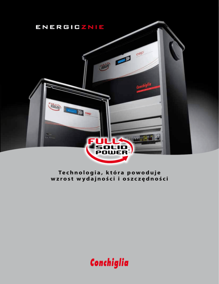 E NE R GIC Z NIE Te c h n o l o g i a , k t ó r a p o w o d u j e wzrost w ydajności i oszczędności Nowa generacja Elektronicznych Mierników Mocy Najlepsze osiągi i najwyższa oszczędność w instalacjach oświetleniowych Nowe elektroniczne mierniki mocy Full Solid Power® są ostatnim osiągnięciem w ewolucji technologicznej urządzeń do regulacji strumienia świetlnego. Bazują całościowo na technologii falownika, co pozwala na dostarczanie napięcia sinusoidalnego i regulację o szerokim zakresie wartości, odpowiednie do różnego rodzaju lamp do instalacji oświetleniowych; dzięki tej technologii są w stanie zniwelować negatywny efekt przesunięcia fazowego i uzyskać w ten sposób najwyższą skuteczność świetlną i najlepszą sprawność energetyczną instalacji. Ponadto Full Solid Power(r) posiada wbudowany komputer, zintegrowany z systemem operacyjnym Linux i co więcej, wszystkimi jego funkcjami można zarządzać zdalnie bez dodatkowych urządzeń. Wersje KCEP/HFS CEP/HFS* KGPI/HFS GPI/HFS* CEP/HFS-G** Elektroniczny miernik mocy Elektroniczny miernik mocy Elektryczne a gregaty mocy Elektryczne agregaty mocy Elektroniczny miernik mocy Bez szafy W szafie certyfikowanej IMQ Bez szafy W szafie certyfikowanej IMQ Tylko chassis (bazowy element konstrukcyjny) miernika IP21 IP44 IP21 IP44 IP21 * wykonanie w podwójnej izolacji (klasa II) na zamówienie ** w celu poprawnej instalacji kierować się wskazówkami firmy Conchiglia Wykaz modeli Prąd maksymalny fazy (A) Maksymalne dopuszczalne obciążenie (kW x faza) Wymiary dla wersji z szafą (mm) Wykonanie Model Moc znamionowa (kVA) Podstawa Wysokość Głębokość Trójfazowy …/308/… 3 x 3,2 14 2,9 860 1.394 450 Trójfazowy …/310/… 3 x 4,1 18 3,7 860 1.394 450 Trójfazowy …/315/… 3 x 5,8 25 5,2 860 1.394 450 Trójfazowy …/320/… 3 x 6,9 30 6,2 860 1.394 450 Trójfazowy …/325/… 3 x 8,7 38 7,9 860 1.394 450 Trójfazowy …/330/… 3 x 10,4 45 9,3 860 1.394 450 Trójfazowy .../335/… 3 x 12,0 52 10,8 860 1.394 450 Trójfazowy …/345/… 3 x 15,0 65 13,5 860 1.394 450 Trójfazowy …/350/… 3 x 16,8 73 15,1 860 1.394 450 Trójfazowy …/360/… 3 x 20,0 87 18,0 860 1.394 450 Trójfazowy …/375/… 3 x 24,2 105 21,7 860 1.394 450 Jednofazowy …/158/… 1 x 5,8 25 5,2 546 900 308 Jednofazowy …/169/… 1 x 6,9 30 6,2 546 900 308 Jednofazowy …/187/… 1 x 8,7 38 7,9 546 900 308 Jednofazowy …/199/… 1 x 10,4 45 9,3 546 900 308 Podstawowe dane techniczne to: • utrzymanie wartości cosφ≈1 wejścia; • zróżnicowanie cosφ wyjścia zarządzane do 0,75 także z maksymalnym zastosowanym obciążeniem; • regulacja lamp z optymalnymi kształtami fali; • odporność na mikroprzerwy napięcia sieci; • zdalne monitorowanie zintegrowane z urządzeniem (dostarczony w standardzie); • wysoka elastyczność i personalizacja cykli; • działanie jako zasilacz awaryjny (z opcjonalnym modułem); • wykonanie w podwójnej izolacji (na zamówienie). FULL SOLID POWER: WYDAJN Zaawansowana technologia Falownik wielopoziomowy z korekcją Współczynnika Mocy (PF) W stosunku do wersji tradycyjnych, pozwala na większą ogólną wydajność urządzenia przy zastosowaniu tej samej mocy. Zalety: • zarządzanie w sposób elastyczny i skuteczny urządzeniami różnego rodzaju; • obniżenie zniekształcenia napięcia wyjścia w każdych warunkach obciążenia lamp, czego natychmiastowym efektem jest lepsza końcowa wydajność instalacji oświetleniowej • pochłanianie z sieci energii z cosφ≈1 Zintegrowany system kontroli Oparty na wbudowanym komputerze i systemie operacyjnym Linux. Zalety: • zdalny monitoring z prostym dodaniem karty telefonicznej i użycie wspólnej przeglądarki sieciowej; • aktualizacja oprogramowania i ciągła poprawa skuteczności bez dodatkowych kosztów dla klienta; • aktualizacja systemu, także zdalna; • połączenia: - miejscowe (poprzez port Ethernet/ USB) - zdalne przez komputer (port Ethernet); • niezawodność i wysokie możliwości personalizacji; • dostępność do aktualnych i poprzednich danych o działaniu urządzenia. System full unbreak® • zagwarantowana jest ciągłość dostawy na obciążeniu także w obecności mikroprzerw do 40ms; • integrując moduł zasilania rezerwowego na baterie (na zamówienie), w obecności mikroprzerw dłuższych niż 40ms lub awarii zasilania, system przewiduje rekonfiguracje automatyczną i zasilanie instalacji na baterie; • w przypadku warunków krytycznych dla sprzętu lub uszkodzenia wewnętrznego, by-pass przewiduje zasilanie bezpośrednie instalacji bez przerw w dostawie. Specyfikacja techniczna Napięcie wejściowe (jednofazowe) 1/N/PE 180-276 V Napięcie wejściowe (trójfazowe) 3/N/PE 315-470 V Napięcie wyjściowe sterowane 100-245 V Częstotliwość 50-60 Hz (do wyboru) Dokładność napięcia wyjścia ±0,3% Max dopuszczalne przeciążenie do 200% wartości znamionowej prądu na obciążeniu pojemnościowym na starcie Szybkość stabilizacji < 10 ms Poprawka współczynnika mocy obciążenia wejścia Cosφ ≥ 0,99 Przesunięcie fazowe zarządzane z zastosowanym obciążeniem max Cosφ ≥ 0,75 Niezależna regulacja w trzech fazach występuje Temperatura pracy -20°C +50°C Wilgotność względna Do 95% bez kondensacji Komunikacja USB/Ethernet - sterowanie monitoringiem przez modem (zintegrowany) GSM/GPRS Direttive Dyrektywy Niskie napięcie CE/2006/95, Emc CE/2004/108, Znakowanie CE CE/93/68 Zgodność z normami EN 61000-3-2, 61000-3-12, EN 60439-1 OŚĆ, KTÓRA GENERUJE NAJWYŻS Zalety Ekonomiczne i Osiągi Poprawka jednostkowego Współczynnika mocy (PF) Korzyści: • wydłużenie żywotności komponentów elektromechanicznych; • znacznie ograniczona częstotliwość wykonywania konserwacji części elektrycznych; • optymalny stosunek między zainstalowanym obciążeniem a mocą urządzenia; • redukcja pobranej mocy; • podwyższona wydajność urządzenia; • brak dodatkowego przegrzewan