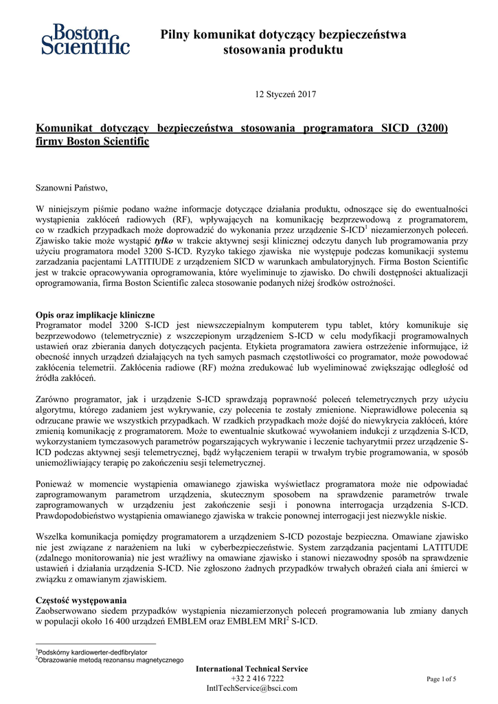 Pilny komunikat dotyczący bezpieczeństwa stosowania produktu 12 Styczeń 2017 Komunikat dotyczący bezpieczeństwa stosowania programatora SICD (3200) firmy Boston Scientific Szanowni Państwo, W niniejszym piśmie podano ważne informacje dotyczące działania produktu, odnoszące się do ewentualności wystąpienia zakłóceń radiowych (RF), wpływających na komunikację bezprzewodową z programatorem, co w rzadkich przypadkach może doprowadzić do wykonania przez urządzenie S-ICD1 niezamierzonych poleceń. Zjawisko takie może wystąpić tylko w trakcie aktywnej sesji klinicznej odczytu danych lub programowania przy użyciu programatora model 3200 S-ICD. Ryzyko takiego zjawiska nie występuje podczas komunikacji systemu zarzadzania pacjentami LATITIUDE z urządzeniem SICD w warunkach ambulatoryjnych. Firma Boston Scientific jest w trakcie opracowywania oprogramowania, które wyeliminuje to zjawisko. Do chwili dostępności aktualizacji oprogramowania, firma Boston Scientific zaleca stosowanie podanych niżej środków ostrożności. Opis oraz implikacje kliniczne Programator model 3200 S-ICD jest niewszczepialnym komputerem typu tablet, który komunikuje się bezprzewodowo (telemetrycznie) z wszczepionym urządzeniem S-ICD w celu modyfikacji programowalnych ustawień oraz zbierania danych dotyczących pacjenta. Etykieta programatora zawiera ostrzeżenie informujące, iż obecność innych urządzeń działających na tych samych pasmach częstotliwości co programator, może powodować zakłócenia telemetrii. Zakłócenia radiowe (RF) można zredukować lub wyeliminować zwiększając odległość od źródła zakłóceń. Zarówno programator, jak i urządzenie S-ICD sprawdzają poprawność poleceń telemetrycznych przy użyciu algorytmu, którego zadaniem jest wykrywanie, czy polecenia te zostały zmienione. Nieprawidłowe polecenia są odrzucane prawie we wszystkich przypadkach. W rzadkich przypadkach może dojść do niewykrycia zakłóceń, które zmienią komunikację z programatorem. Może to ewentualnie skutkować wywołaniem indukcji z urządzenia S-ICD, wykorzystaniem tymczasowych parametrów pogarszających wykrywanie i leczenie tachyarytmii przez urządzenie SICD podczas aktywnej sesji telemetrycznej, bądź wyłączeniem terapii w trwałym trybie programowania, w sposób uniemożliwiający terapię po zakończeniu sesji telemetrycznej. Ponieważ w momencie wystąpienia omawianego zjawiska wyświetlacz programatora może nie odpowiadać zaprogramowanym parametrom urządzenia, skutecznym sposobem na sprawdzenie parametrów trwale zaprogramowanych w urządzeniu jest zakończenie sesji i ponowna interrogacja urządzenia S-ICD. Prawdopodobieństwo wystąpienia omawianego zjawiska w trakcie ponownej interrogacji jest niezwykle niskie. Wszelka komunikacja pomiędzy programatorem a urządzeniem S-ICD pozostaje bezpieczna. Omawiane zjawisko nie jest związane z narażeniem na luki w cyberbezpieczeństwie. System zarządzania pacjentami LATITUDE (zdalnego monitorowania) nie jest wrażliwy na omawiane zjawisko i stanowi niezawodny sposób na sprawdzenie ustawień i działania urządzenia S-ICD. Nie zgłoszono żadnych przypadków trwałych obrażeń ciała ani śmierci w związku z omawianym zjawiskiem. Częstość występowania Zaobserwowano siedem przypadków wystąpienia niezamierzonych poleceń programowania lub zmiany danych w populacji około 16 400 urządzeń EMBLEM oraz EMBLEM MRI2 S-ICD. 1 Podskórny kardiowerter-dedfibrylator Obrazowanie metodą rezonansu magnetycznego 2 International Technical Service +32 2 416 7222 [email protected] Page 1 of 5 Pilny komunikat dotyczący bezpieczeństwa stosowania produktu Cztery z siedmiu przypadków mogły mieć ewentualny wpływ na zdrowie, lecz wszystkie zostały z powodzeniem wykryte i rozwiązane bez szkody dla pacjenta. Prawdopodobieństwo wystąpienia poważnych skutków niepożądanych dla urządzenia EMBLEM S-ICD zostało oszacowane na poziomie 1 do 25 000 w okresie 5 lat. Zaobserwowano trzy przypadki wystąpienia niezamierzonych poleceń programowania lub zmiany danych w odniesieniu do urządzeń SQ-RX™ S-ICD. Jeden z trzech przypadków dotyczył przywrócenia nominalnych parametrów fabrycznych. Żaden z trzech przypadków nie doprowadził do trwałych obrażeń ciała ani śmierci. Prawdopodobieństwo wystąpienia poważnych skutków niepożądanych dla urządzenia SQ-RX S-ICD zostało oszacowane na poziomie 1 do 200 000 w okresie 5 lat. Zalecenia Firma Boston Scientific jest w trakcie opracowywania oprogramowania, które wyeliminuje omawiane zjawisko. Poniższe zalecenia pozwalają zminimalizować ryzyko z nim związane do chwili udostępnienia zaktualizowanego oprogramowania: Korzystanie z systemu zarządzania pacjentami LATITUDE do rutynowej oceny urządzenia S-ICD zminimalizuje liczbę interakcji programatora z urządzeniem S-ICD. Jeżeli system zarządzania pacjentami LATITUDE nie jest dostępny, należy rozważyć zmniejszenie częstości kontroli klinicznych, stosując jednocześnie wytyczne Towarzystw Kardiologicznych.3 Podczas jakichkolwiek czynności programowania lub kontroli urządzeń S-ICD przy użyciu programatora S-ICD model 3200, należy: ‒ upewnić się, że podczas wszczepienia oraz testowania w trakcie wizyt kontrolnych dostępny jest zewnętrzny sprzęt do defibrylacji oraz personel medyczny posiadający doświadczenie w prowadzeniu RKO4, a także nie należy pozostawiać pacjenta bez opieki ‒ zawsze umieszczać sondę telemetryczną bezpośrednio nad urządzeniem S-ICD i w maksymalnym możliwym zakresie zwiększyć odległość pomiędzy źródłem zakłóceń, a programatorem i urządzeniem S-ICD ‒ skrócić do minimum czas komunikacji z programatorem oraz zakończyć sesję telemetryczną niezwłocznie po wykonaniu zadań W trakcie komunikowania się programatora z urządzeniem S-ICD istnieje ewentualność, że omawiane zjawisko może zmienić parametry tymczasowe bez wiedzy użytkown