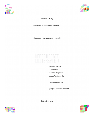 RAPORT 2015 NAPRAW SOBIE UNIWERSYTET! diagnoza – partycypacja – rozwój Natalia Kaczor Anna Muś Kamila Rogowicz Anna Wróblewska We współpracy z: Justyną Szostek-Aksamit Katowice, 2015 1 SPIS TREŚCI SPIS TREŚCI.............................................................................................................................2 Podziękowania............................................................................................................................3 1. Inicjatywa Napraw Sobie Uniwersytet............................................................................................4 1.1 Dlaczego „napraw”?.............................................................................................................4 1.2 O Inicjatywie .......................................................................................................................4 2. Kontekst ..........................................................................................................................................6 2.1 Uniwersytet i wspólnota akademicka...................................................................................6 2.2 Zmiany otoczenia Uniwersytetu...........................................................................................8 2.3 Student..................................................................................................................................9 2.4 Uniwersytet Trzeciej Generacji..........................................................................................10 2.5 Misja Uniwersytetu Śląskiego, Strategia Rozwoju i akty prawne......................................11 3. Badania .........................................................................................................................................14 3.1 Grupa badawcza.................................................................................................................14 3.2 Przedmiot badań.................................................................................................................14 3.3 Narzędzie badawcze i analiza danych................................................................................15 3.4 Organizacja badań..............................................................................................................16 3.5 Źródła danych i dobór badanej próby.................................................................................16 4. Problematyka.................................................................................................................................18 4.1 Koła Naukowe i Organizacje Studenckie...........................................................................18 Metody.............................................................................................................................18 Diagnoza..........................................................................................................................19 Problemy........................................................................................................................101 Rozwiązania...................................................................................................................103 Oczekiwane efekty.........................................................................................................107 4.2 Samorząd Studencki.........................................................................................................108 Metody i techniki...........................................................................................................108 Diagnoza........................................................................................................................108 Wyzwania......................................................................................................................245 Koncepcje .....................................................................................................................247 Proponowane rozwiązania.............................................................................................248 Oczekiwane rezultaty.....................................................................................................248 3. Media akademickie.............................................................................................................250 Metody i techniki...........................................................................................................250 Diagnoza........................................................................................................................250 Wyzwania i koncepcje...................................................................................................275 Rozwiązania i pożądane efekty.....................................................................................277 4.4 Komfort życia studentów.................................................................................................279 Metody i techniki...........................................................................................................279 Diagnoza........................................................................................................................279 Problemy........................................................................................................................305 4.5 Jakość kształcenia.............................................................................................................307 Metoda...........................................................................................................................307 Diagnoza........................................................................................................................307 Problemy........................................................................................................................424 Oc