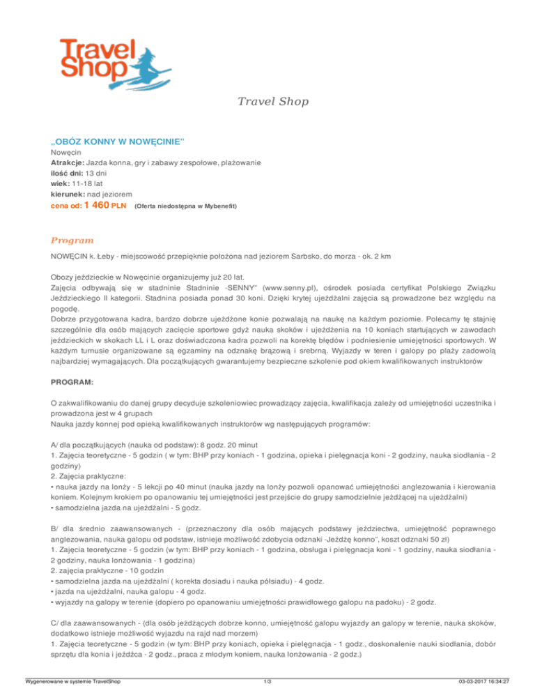Travel Shop „OBÓZ KONNY W NOWĘCINIE” Nowęcin Atrakcje: Jazda konna, gry i zabawy zespołowe, plażowanie ilość dni: 13 dni wiek: 11-18 lat kierunek: nad jeziorem cena od: 1 460 PLN (Oferta niedostępna w Mybenefit) Program NOWĘCIN k. Łeby - miejscowość przepięknie położona nad jeziorem Sarbsko, do morza - ok. 2 km Obozy jeździeckie w Nowęcinie organizujemy już 20 lat. Zajęcia odbywają się w stadninie Stadninie -SENNY” (www.senny.pl), ośrodek posiada certyfikat Polskiego Związku Jeździeckiego II kategorii. Stadnina posiada ponad 30 koni. Dzięki krytej ujeżdżalni zajęcia są prowadzone bez względu na pogodę. Dobrze przygotowana kadra, bardzo dobrze ujeżdżone konie pozwalają na naukę na każdym poziomie. Polecamy tę stajnię szczególnie dla osób mających zacięcie sportowe gdyż nauka skoków i ujeżdżenia na 10 koniach startujących w zawodach jeździeckich w skokach LL i L oraz doświadczona kadra pozwoli na korektę błędów i podniesienie umiejętności sportowych. W każdym turnusie organizowane są egzaminy na odznakę brązową i srebrną. Wyjazdy w teren i galopy po plaży zadowolą najbardziej wymagających. Dla początkujących gwarantujemy bezpieczne szkolenie pod okiem kwalifikowanych instruktorów PROGRAM: O zakwalifikowaniu do danej grupy decyduje szkoleniowiec prowadzący zajęcia, kwalifikacja zależy od umiejętności uczestnika i prowadzona jest w 4 grupach Nauka jazdy konnej pod opieką kwalifikowanych instruktorów wg następujących programów: A/ dla początkujących (nauka od podstaw): 8 godz. 20 minut 1. Zajęcia teoretyczne - 5 godzin ( w tym: BHP przy koniach - 1 godzina, opieka i pielęgnacja koni - 2 godziny, nauka siodłania - 2 godziny) 2. Zajęcia praktyczne: • nauka jazdy na lonży - 5 lekcji po 40 minut (nauka jazdy na lonży pozwoli opanować umiejętności anglezowania i kierowania koniem. Kolejnym krokiem po opanowaniu tej umiejętności jest przejście do grupy samodzielnie jeżdżącej na ujeżdżalni) • samodzielna jazda na ujeżdżalni - 5 godz. B/ dla średnio zaawansowanych - (przeznaczony dla osób mających podstawy jeździectwa, umiejętność poprawnego anglezowania, nauka galopu od podstaw, istnieje możliwość zdobycia odznaki -Jeżdżę konno”, koszt odznaki 50 zł) 1. Zajęcia teoretyczne - 5 godzin (w tym: BHP przy koniach - 1 godzina, obsługa i pielęgnacja koni - 1 godziny, nauka siodłania 2 godziny, nauka lonżowania - 1 godzina) 2. zajęcia praktyczne - 10 godzin • samodzielna jazda na ujeżdżalni ( korekta dosiadu i nauka półsiadu) - 4 godz. • jazda na ujeżdżalni, nauka galopu - 4 godz. • wyjazdy na galopy w terenie (dopiero po opanowaniu umiejętności prawidłowego galopu na padoku) - 2 godz. C/ dla zaawansowanych - (dla osób jeżdżących dobrze konno, umiejętność galopu wyjazdy an galopy w terenie, nauka skoków, dodatkowo istnieje możliwość wyjazdu na rajd nad morzem) 1. Zajęcia teoretyczne - 5 godzin (w tym: BHP przy koniach, opieka i pielęgnacja - 1 godz., doskonalenie nauki siodłania, dobór sprzętu dla konia i jeźdźca - 2 godz., praca z młodym koniem, nauka lonżowania - 2 godz.) Wygenerowane w systemie TravelShop 1/3 03-03-2017 16:34:27 2. Zajęcia praktyczne - 10 godzin: • jazda na ujeżdżalni (doskonalenie podstaw ujeżdżania) - 5 godzin • nauka skoków na ujeżdżalni - 2 godziny • wyjazdy na galopy w terenie - 3 godziny. D/ grupa szkoleniowo-sportowa - warunkiem uczestnictwa w tej grupie jest umiejętność poprawnego galopu i podstaw w skokach, co jest sprawdzane w pierwszym dniu przez trenera. W przypadku akceptacji trenera na przesunięcie do grupy D, należy uiścić na miejscu dodatkowy koszt w wysokości 250 zł. Grupa D ta jest przygotowywana do zdania egzaminu Polskiego Związku Jeździeckiego na odznakę brązową lub srebrną. Egzamin komisyjny jest przeprowadzany na terenie Ośrodka -Senny” po zdaniu egzaminu wewnętrznego. Program grupy D: 1. Zajęcia teoretyczne (8 godz.): B.H.P przy koniach, opieka i pielęgnacja konia - 1 godz., doskonalenie nauki siodłania, dobór sprzętu dla konia i jeźdźca - 2 godz., praca z młodym koniem, nauka lonżowania - 2 godz., przygotowanie do egzaminu na odznakę - 3 godz. 2. Zajęcia praktyczne:- 12 godzin • jazda na ujeżdżalni (doskonalenie podstaw ujeżdżania) - 2 godz. • doskonalenie umiejętności skoków - 3 godz. • wyjazdy na galopy w terenie - 2 godz. • przygotowanie do egzaminu z ujeżdżania i skoków - 3 godz. • egzamin wewnętrzny - 1 godz. • egzamin przed komisją P.Z.J. - 1 godz. Po zdaniu egzaminu komisyjnego uczestnik otrzymuje brązową lub srebrną odznakę wystawiona przez Polski Związek Jeździecki w Warszawie (koszt odznaki 100 ł). PROGRAM OBOZU Z JEŹDZIECKIM ABC: Zajęcia praktyczne tj. 3 godzin jazdy konnej i 2 godziny jazdy bryczką, zajęcia teoretyczne - 5 godzin (pielęgnacja konia, nauka siodłania, nauka lonżowania) Każdy uczestnik powinien posiadać sportowy ubiór: dres, obuwie sportowe itp. DODATKOWE ZAJĘCIA Z KOŃMI: W przypadku uczestników obozu konnego istnieje możliwość wykupienia tzw. MAX PAKIETU w cenie 270 zł dodatkowo 10 godzin zajęć teoretycznych i 7 godzin jazdy konnej (lub 6 godzin jazdy + egzamin na odznakę PZJ -Jeżdżę konno”), zajęcia w ramach max pakietu odbywają się w godzinach 16.00-18.00, obejmują doskonalenie umiejętności podstaw jeżdżenia w klusie i galopie, naukę i doskonalenie skoków, wyjazdy w teren. Za dodatkową opłatą istnieje możliwość: • skorzystania z dodatkowych lekcji nauki jazdy konnej; w cenie - ok. 35 zł/godz., • 6-godzinnego kursie nauki powożenia w cenie 70 zł , • w przypadku uczestników grupy C - zdobycia odznaki P.Z.J. -jeżdżę konno”, koszt egzaminu 50 zł, • rajd nad morze 90 zł ( świadczenia płatne na miejscu) PROGRAM PO ZAJĘCIACH Z KOŃMI • zajęcia w Parku Linowym w Łebie, • wizyta w Sea Park Sarbsk w największym na północy Polski parku roz