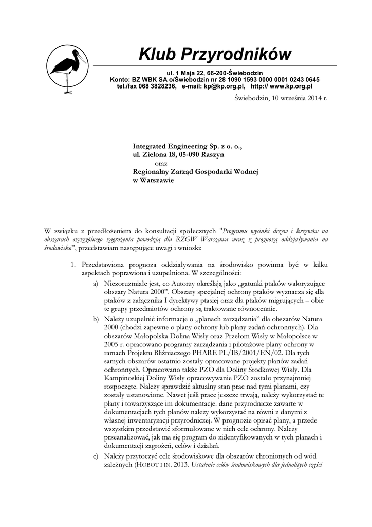 Klub Przyrodników ul. 1 Maja 22, 66-200-Świebodzin Konto: BZ WBK SA o/Świebodzin nr 28 1090 1593 0000 0001 0243 0645 tel./fax 068 3828236, e-mail: [email protected], http:// www.kp.org.pl Świebodzin, 10 września 2014 r. Integrated Engineering Sp. z o. o., ul. Zielona 18, 05-090 Raszyn oraz Regionalny Zarząd Gospodarki Wodnej w Warszawie W związku z przedłożeniem do konsultacji społecznych "Programu wycinki drzew i krzewów na obszarach szczególnego zagrożenia powodzią dla RZGW Warszawa wraz z prognozą oddziaływania na środowisko”, przedstawiam następujące uwagi i wnioski: 1. Przedstawiona prognoza oddziaływania na środowisko powinna być w kilku aspektach poprawiona i uzupełniona. W szczególności: a) Niezoruzmiałe jest, co Autorzy określają jako „gatunki ptaków waloryzujące obszary Natura 2000”. Obszary specjalnej ochrony ptaków wyznacza się dla ptaków z załącznika I dyrektywy ptasiej oraz dla ptaków migrujących – obie te grupy przedmiotów ochrony są traktowane równocennie. b) Należy uzupełnić informacje o „planach zarządzania” dla obszarów Natura 2000 (chodzi zapewne o plany ochrony lub plany zadań ochronnych). Dla obszarów Małopolska Dolina Wisły oraz Przełom Wisły w Małopolsce w 2005 r. opracowano programy zarządzania i pilotażowe plany ochrony w ramach Projektu Bliźniaczego PHARE PL/IB/2001/EN/02. Dla tych samych obszarów ostatnio zostały opracowane projekty planów zadań ochronnych. Opracowano także PZO dla Doliny Środkowej Wisły. Dla Kampinoskiej Doliny Wisły opracowywanie PZO zostało przynajmniej rozpoczęte. Należy sprawdzić aktualny stan prac nad tymi planami, czy zostały ustanowione. Nawet jeśli prace jeszcze trwają, należy wykorzystać te plany i towarzyszące im dokumentacje. dane przyrodnicze zawarte w dokumentacjach tych planów należy wykorzystać na równi z danymi z własnej inwentaryzacji przyrodniczej. W prognozie opisać plany, a przede wszystkim przedstawić sformułowane w nich cele ochrony. Należy przeanalizować, jak ma się program do zidentyfikowanych w tych planach i dokumentacji zagrożeń, celów i działań. c) Należy przytoczyć cele środowiskowe dla obszarów chronionych od wód zależnych (HOBOT I IN. 2013. Ustalenie celów środowiskowych dla jednolitych części d) e) f) g) wód powierzchniowych, podziemnych i obszarów chronionych, mscr dla KZGW) i przeanalizować wpływ Programu na osiągnięcie tych celów. Niezrozumiale jest, dlaczego grzyby inwentaryzowano tylko wiosną. W świetle takiej metody, wyniki są niewiarygodne – w rzeczywistości na terenie opracowania można się spodziewać co najmniej kilku-kilkunastu gatunków grzybów z czerwonej listy, ale o owocnikach pojawiających się jesienią. Mimo że proponowana wycinka drzew, korzystając z wyjątku ustawowego, nie naruszałaby zakazów obowiązujących w rezerwatach przyrody, parkach krajobrazowych i obszarach chronionego krajobrazu, to w Prognozie trzeba przeanalizować jej oddziaływanie na przedmioty ochrony i cele ochrony tych form ochrony przyrody. Prognoza oddziaływania na środowisku musi analizować także oddziaływanie działań kompensacyjnych. Kosztem jakich ekosystemów mają być wprowadzane nowe zadrzewienia łęgowe? Czy nie są to cenne przyrodniczo ekosystemy nieleśne doliny rzecznej, w szczególności istotne nieleśne siedliska ptaków? Niezrozumiałe jest stwierdzenie, że „W związku z brakiem stwierdzeń stanowisk lęgowych gatunków ptaków stanowiących przedmioty ochrony Obszaru Specjalnej Ochrony Ptaków (OSO) PLB140006 Małopolski Przełom Wisły na terenie planowanej inwestycji, nie przeprowadzono oceny oddziaływania”. Czy stanowisk lęgowych przedmiotów ochrony nie stwierdzono, czy też wykluczono ich występowanie? Czy rzeczywiście nie przeprowadzono oceny, czy też chodzi raczej o stwierdzenie braku ryzyka oddziaływania? Zwracamy uwagę, że oddziaływanie na populacje i siedliska ptaków to nie tylko oddziaływanie na stanowiska lęgowe? 2. Prognoza oddziaływania na środowisko powinna analizować także oddziaływanie Programu na dolinę Wisły poniżej obszaru realizacji Programu. Celem Programu jest zwiększenie przepustowości hydraulicznej międzywala Wisły i ułatwienie przepływu wód powodziowych: co oznacza, ze wody te mogą szybciej znaleźć się poniżej analizowanego odcinka i tam spowodować zwiększone zagrożenie powodziowe. 3. Pomimo braków i błędów, prognoza oddziaływania na środowisko wykazuje bez żadnych wątpliwości, że Program miałby znaczące negatywne oddziaływanie na obszary Natura 2000 w analizowanym odcinku doliny Wisły. W tej sytuacji, nie może on zostać zatwierdzony. Wyjątkowo, plan mógłby on zostać zatwierdzony w trybie art. 6.4 dyrektywy siedliskowej (art. 34 ustawy o ochronie przyrody), tj. wymagałoby to udowodnienia: – rzeczywistej nadrzędności interesu publicznego realizacji programu nad interesem ochrony środowiska i przyrody doliny Wisły, – braku rozwiązań altenatywnych, a także zagwarantowania adekwatnej kompensacji przyrodniczej, zapewniającej spójność sieci Natura 2000. 4. Ochrona przeciwpowodziowa jest niewątpliwie interesem publicznym, ale nadrzędność tego interesu w porównaniu z ochroną integralności lasów łęgowych w dolinie Wisły wraz z ich fauną nie została jeszcze ani w Programie ani w prognozie wykazana. W żadnym razie nie można przyjąć, że ochrona przeciwpowodziowa jest a’priori nadrzędna nad ochroną obszarów Natura 2000. Dowód taki wymagałby oszacowania zmniejszenia ryzyka powodziowego (wielkość przewidywanych strat powodziowych × zmiana prawdopodobieństwa ich zaistnienia w wyniku realizacji Programu). 5. Celem wycinek ma być, co do zasady, lokalne obniżenie maksymalnych stanów wody w przypadku fali powodziowej. Oczywistą alternatywą, która nie została jak na razie rozważona, jest przebudowa i wzmocnienie wałów przeciwpowodziowych bez zmiany 